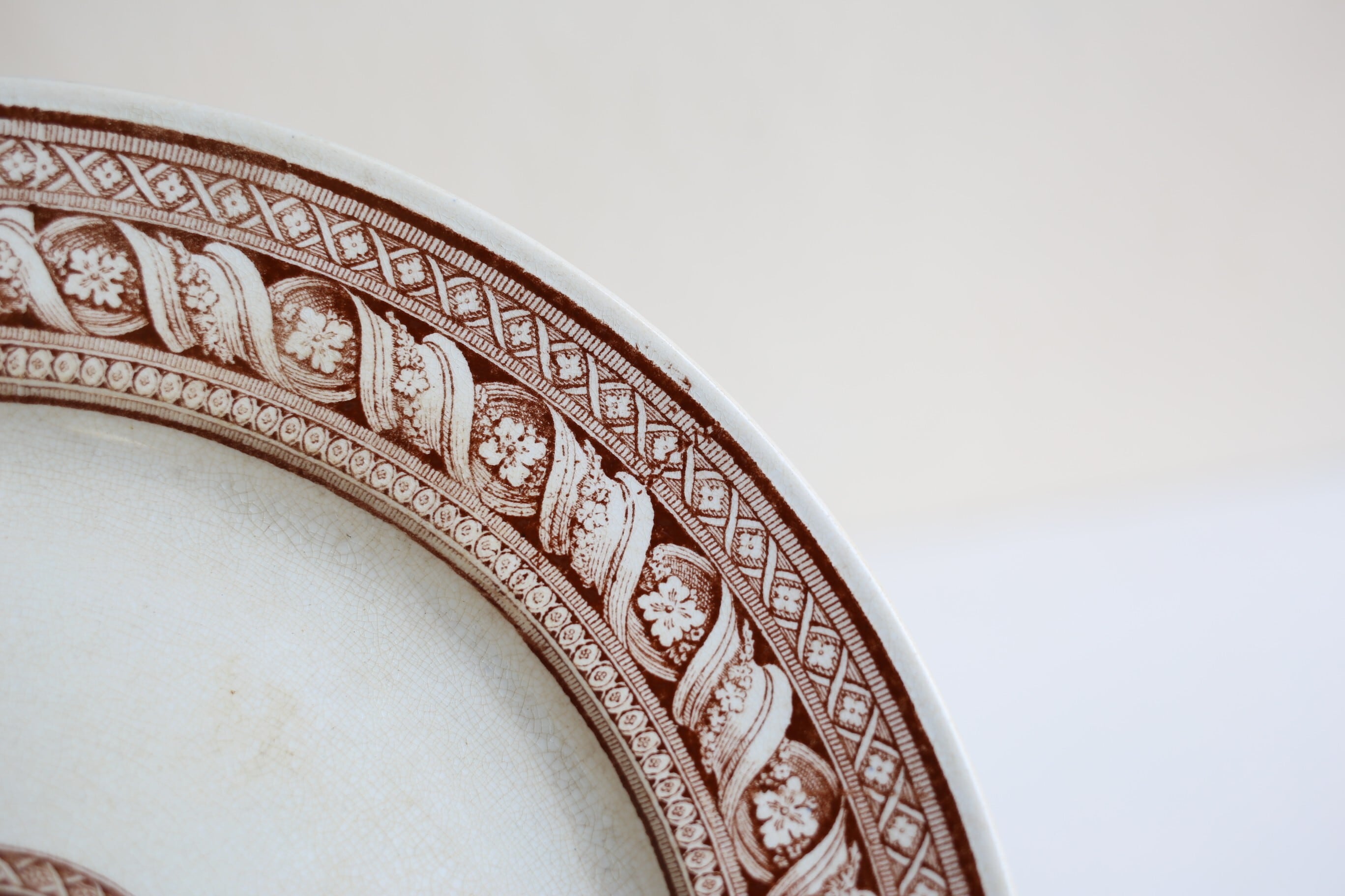 縁から5cmほどのヘアラインが一本ありますが、それ以外は多少のカトラリー跡や全体にシミが入っている程度で、全体的には釉薬の輝きも残った良い状態です。