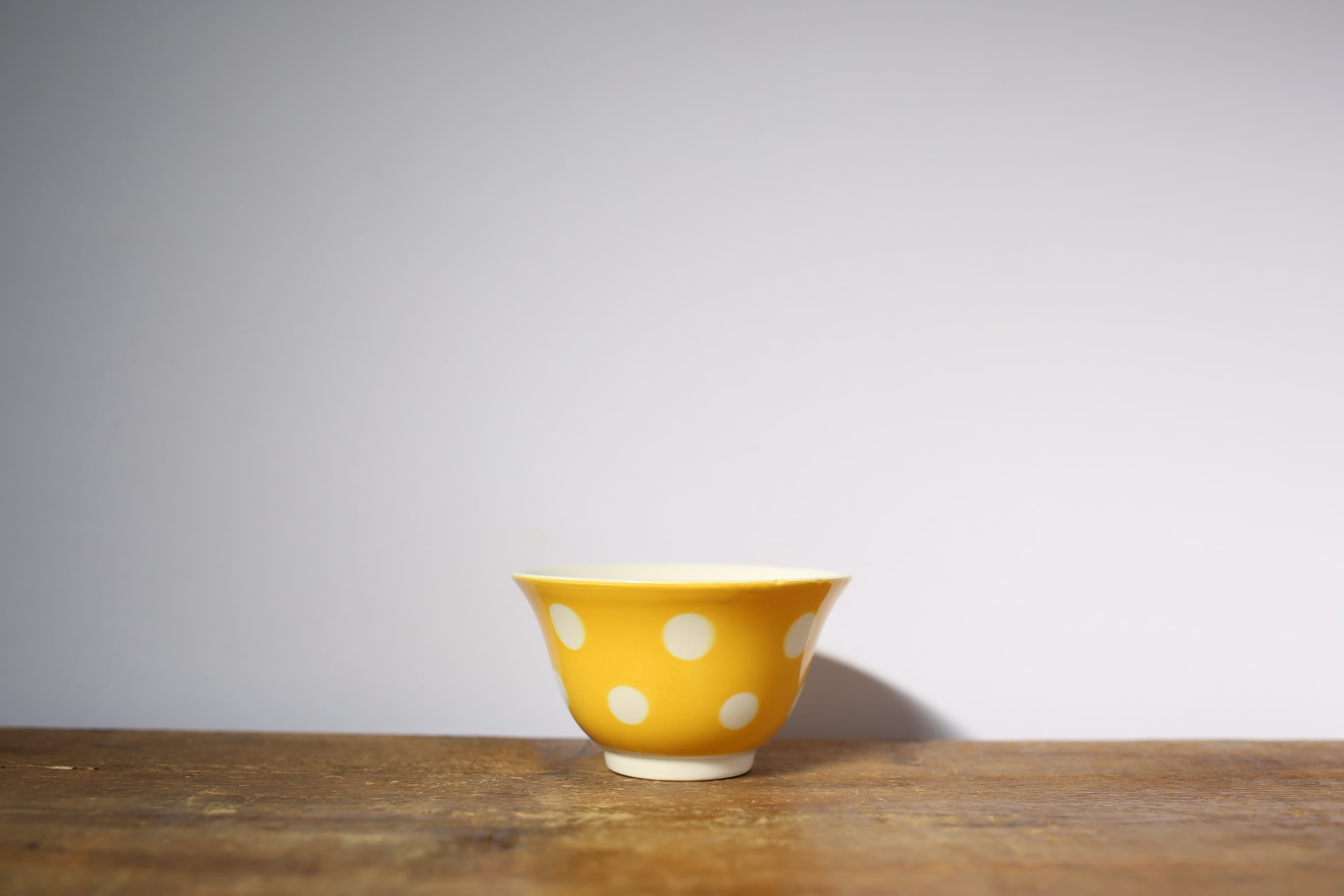 口に向かって広がるフォルムや黄色に白抜きの水玉模様が可愛らしく、目に入るだけで明るい気分になれる素敵なアイテムです。
