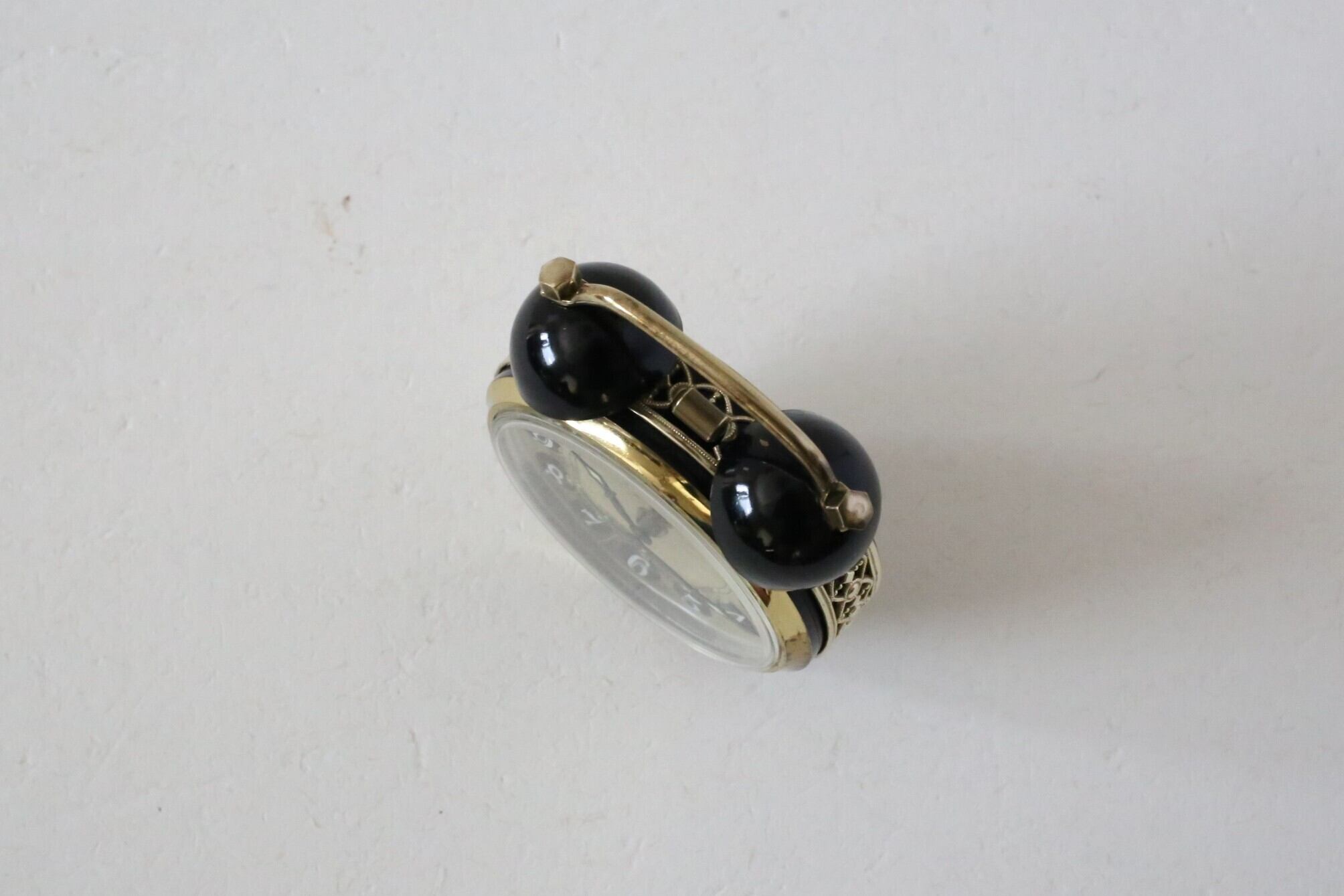 上部に2つのベルが付いたレトロなデザインやサイドの装飾にブラック×ゴールドのシックなカラーが素敵な時計です。