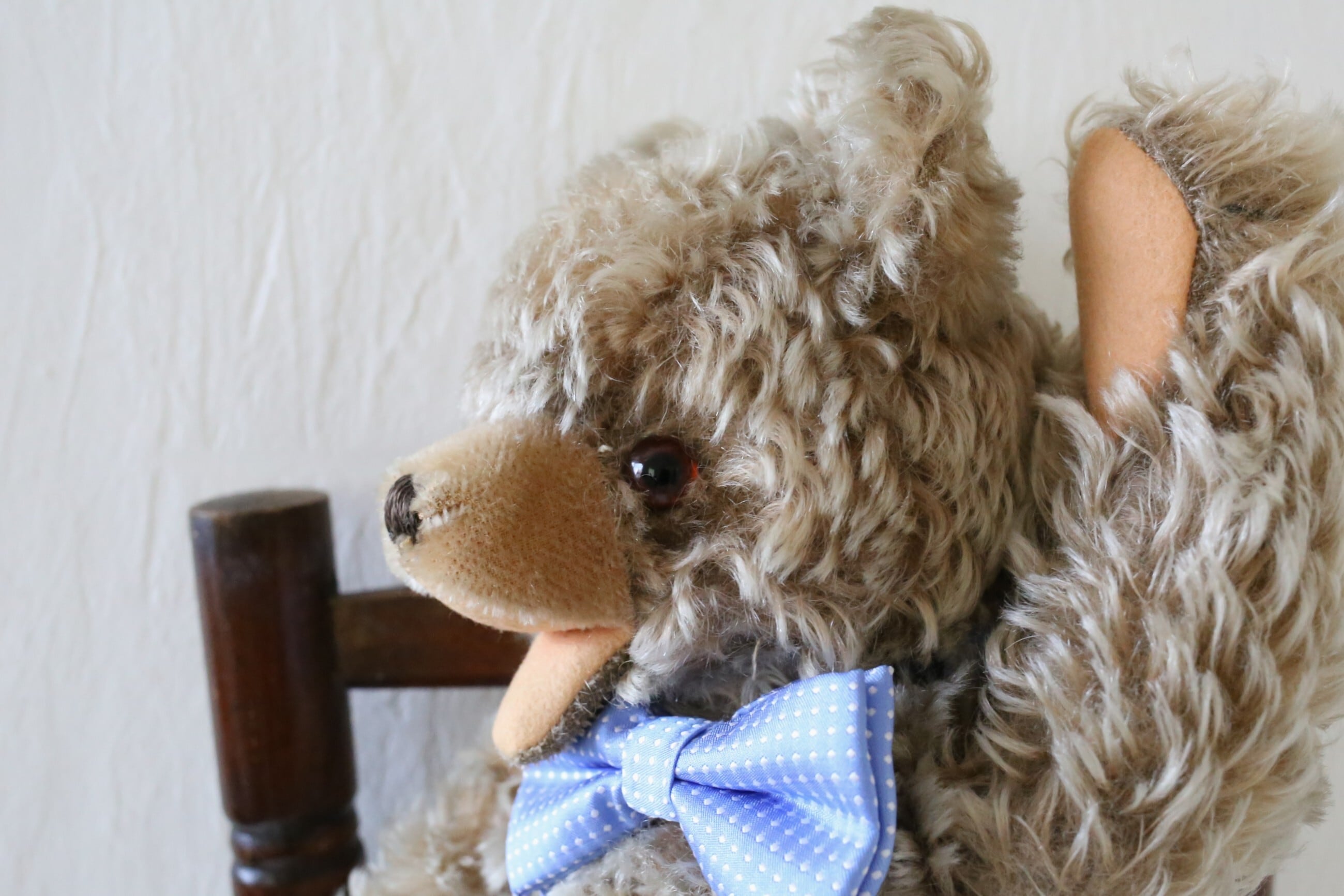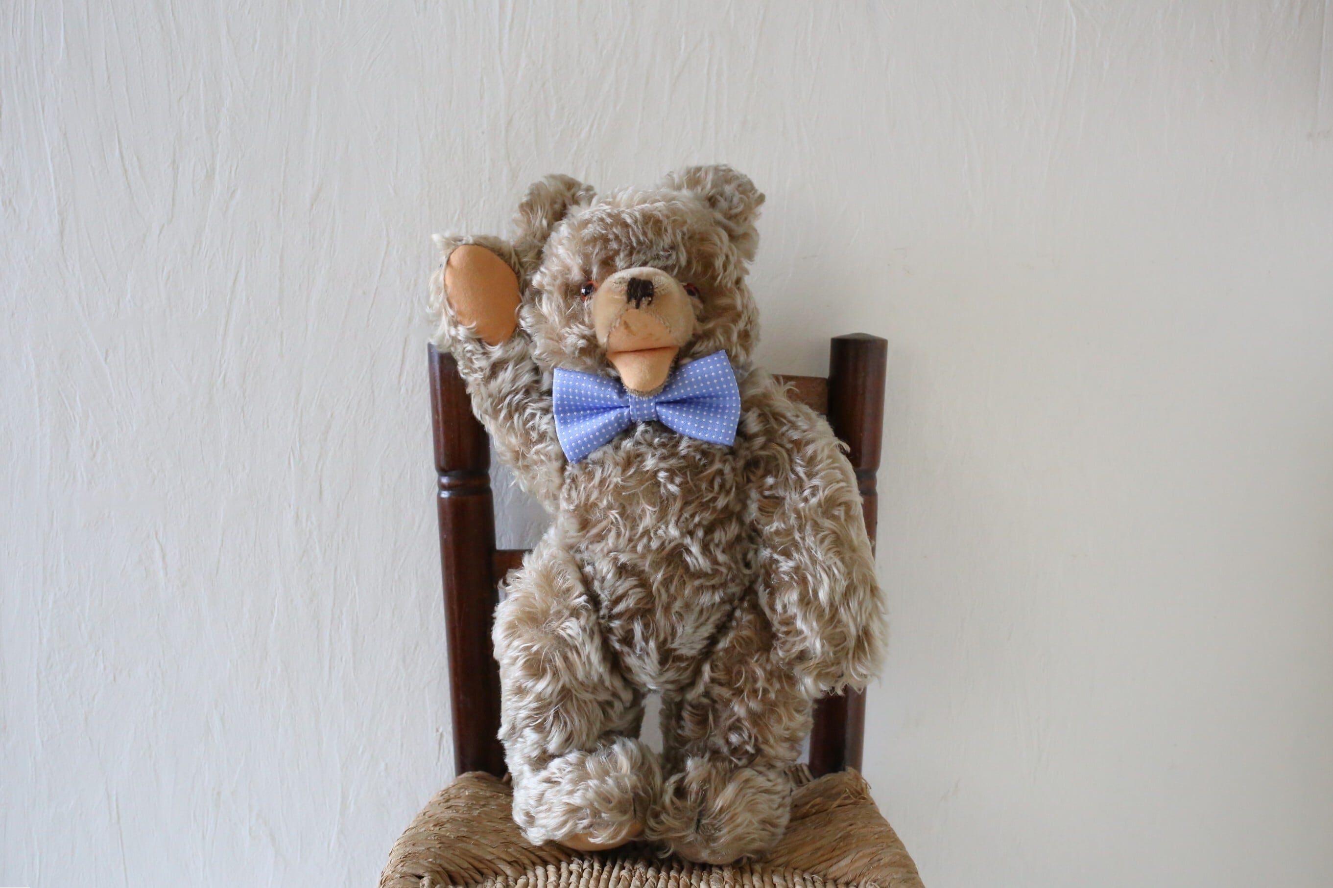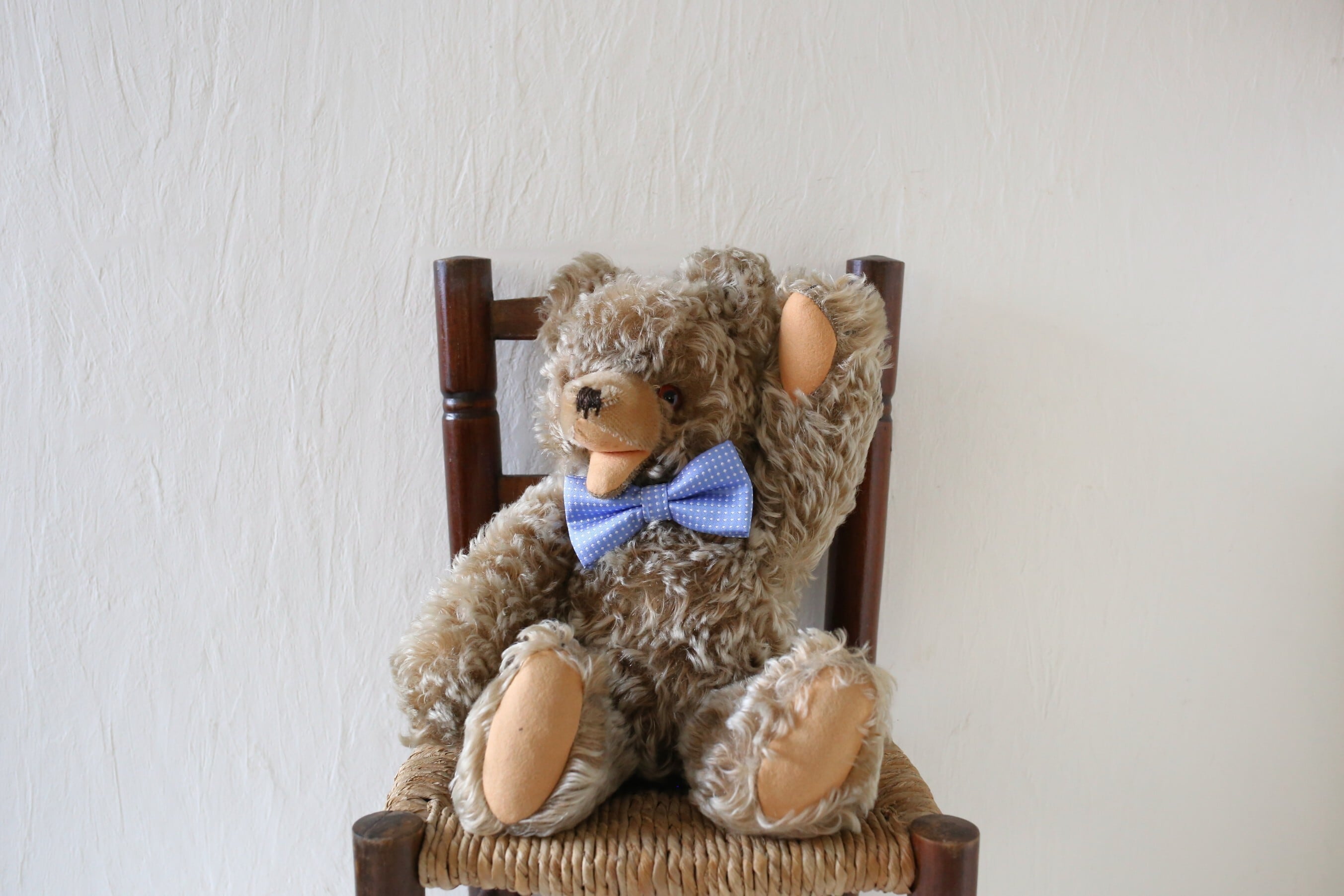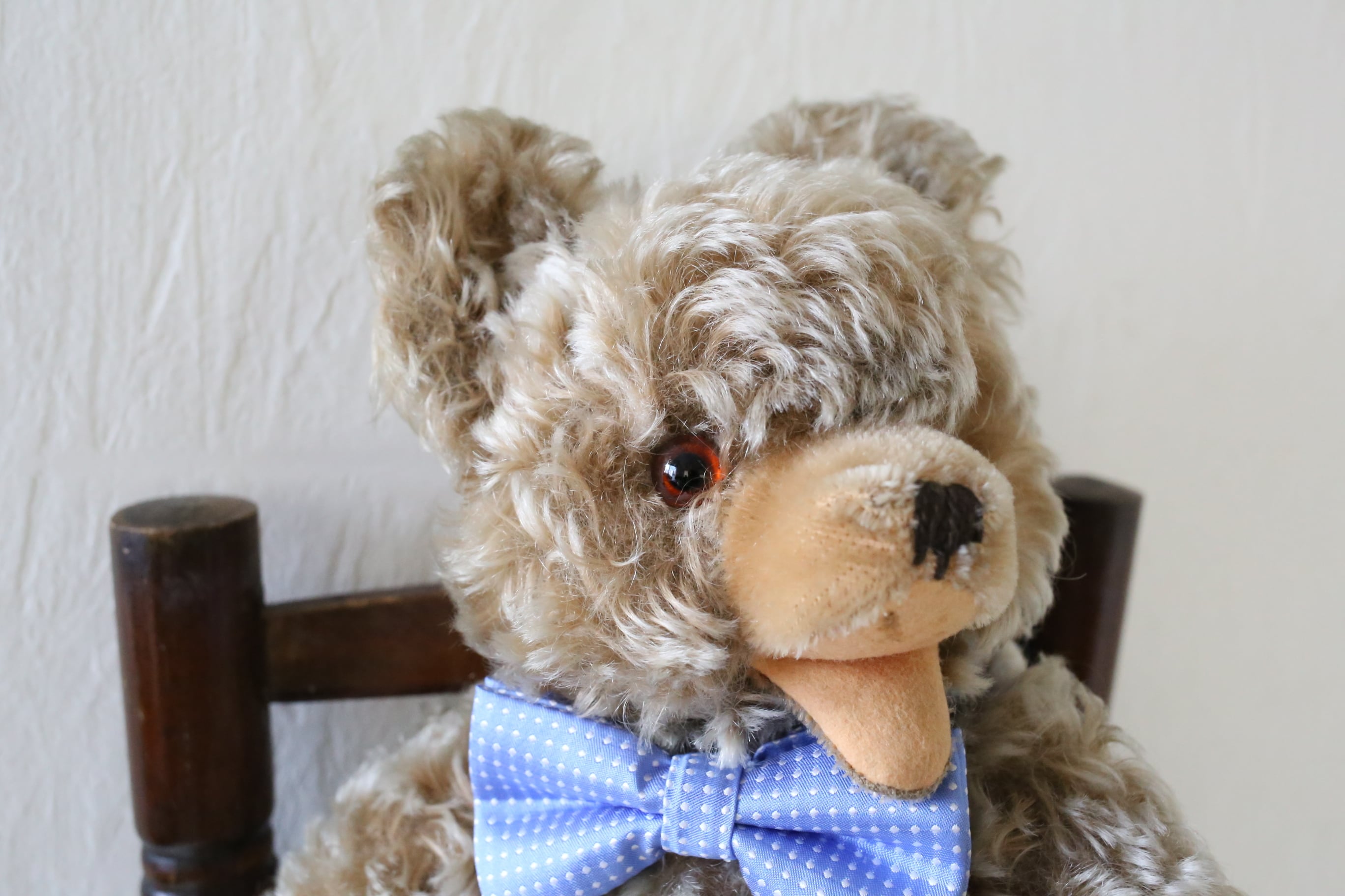 前の持ち主が蝶ネクタイを付けてくれていますが、水色に小さな白いドット柄がベアの雰囲気と良く合っています。