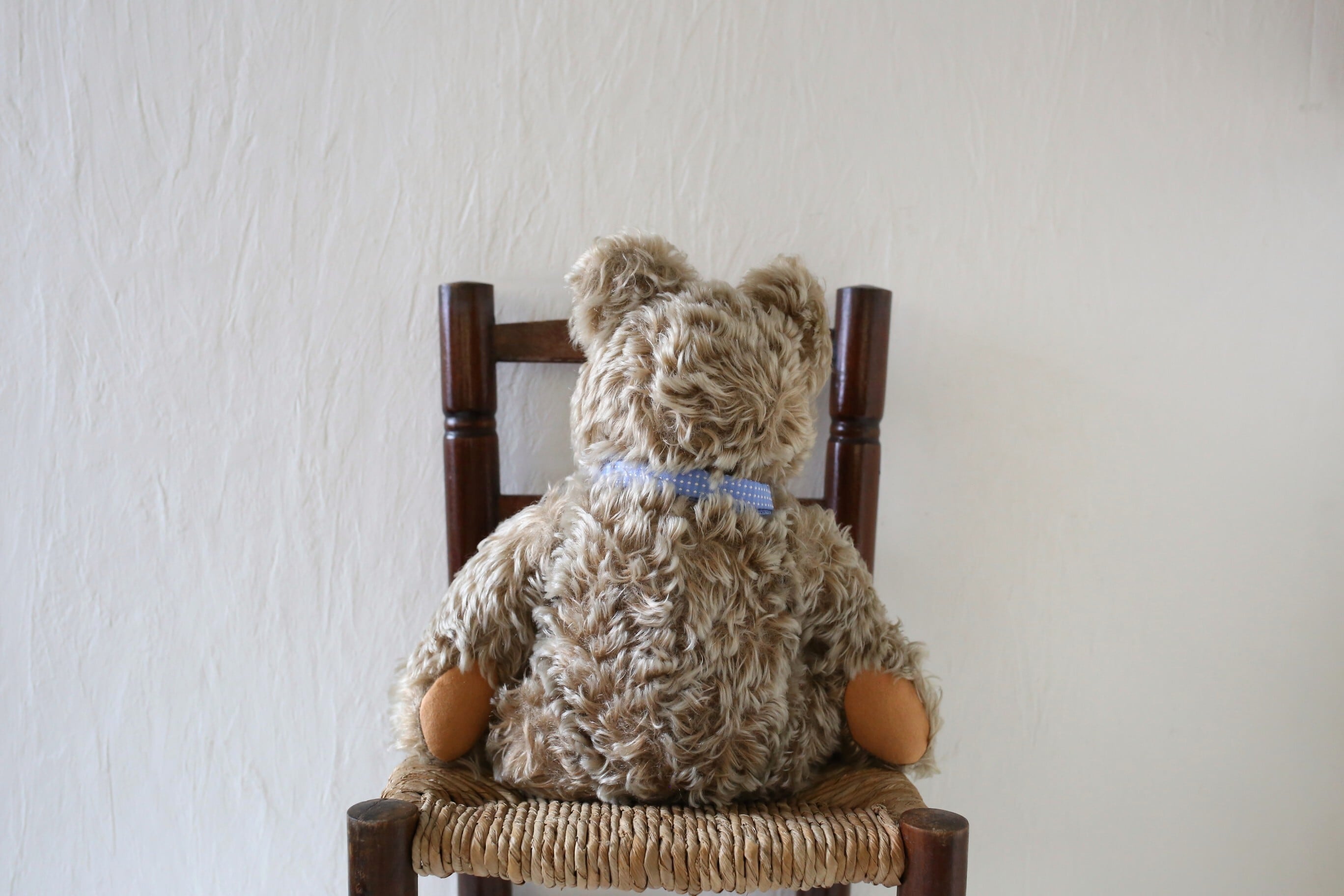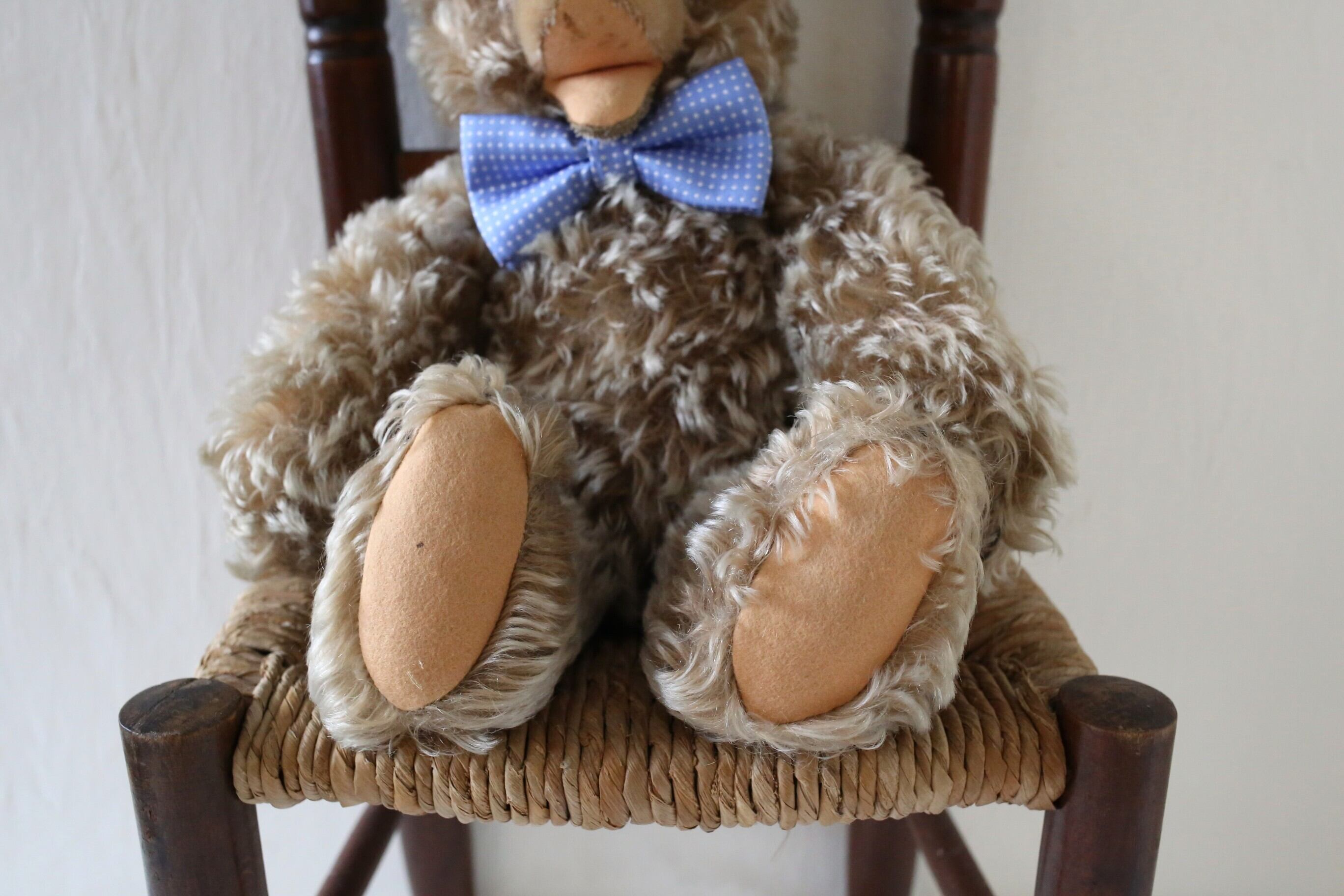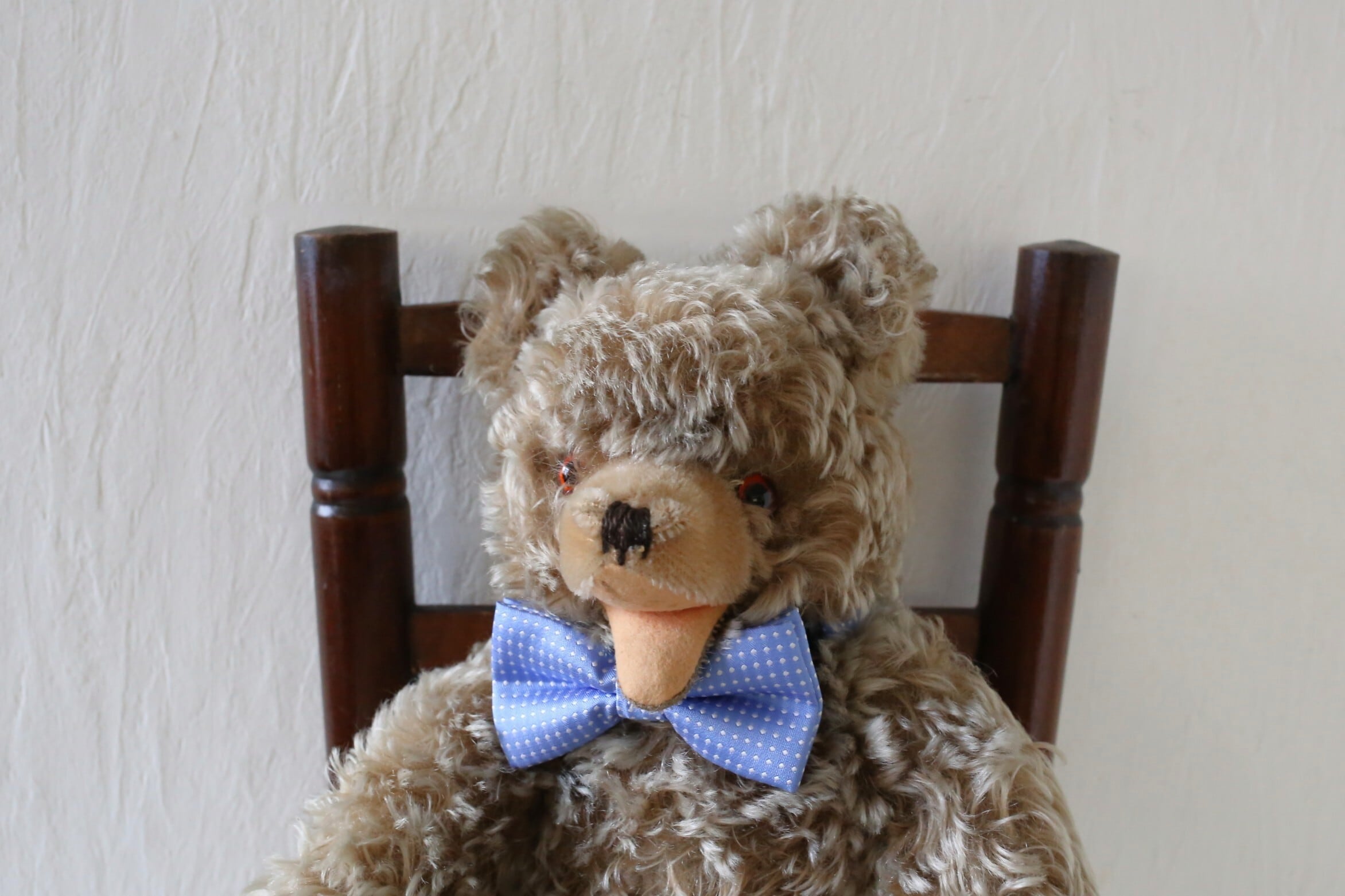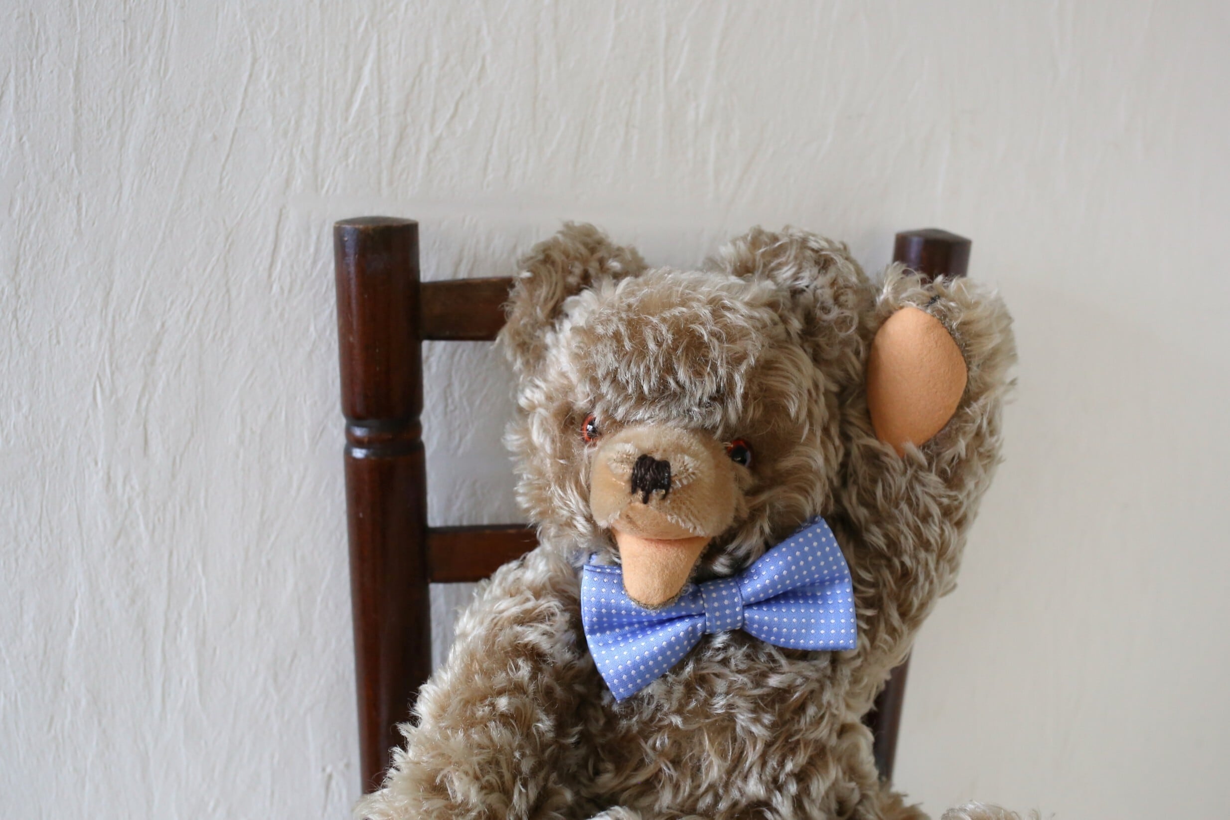前の持ち主が蝶ネクタイを付けてくれていますが、水色に小さな白いドット柄がベアの雰囲気と良く合っています。