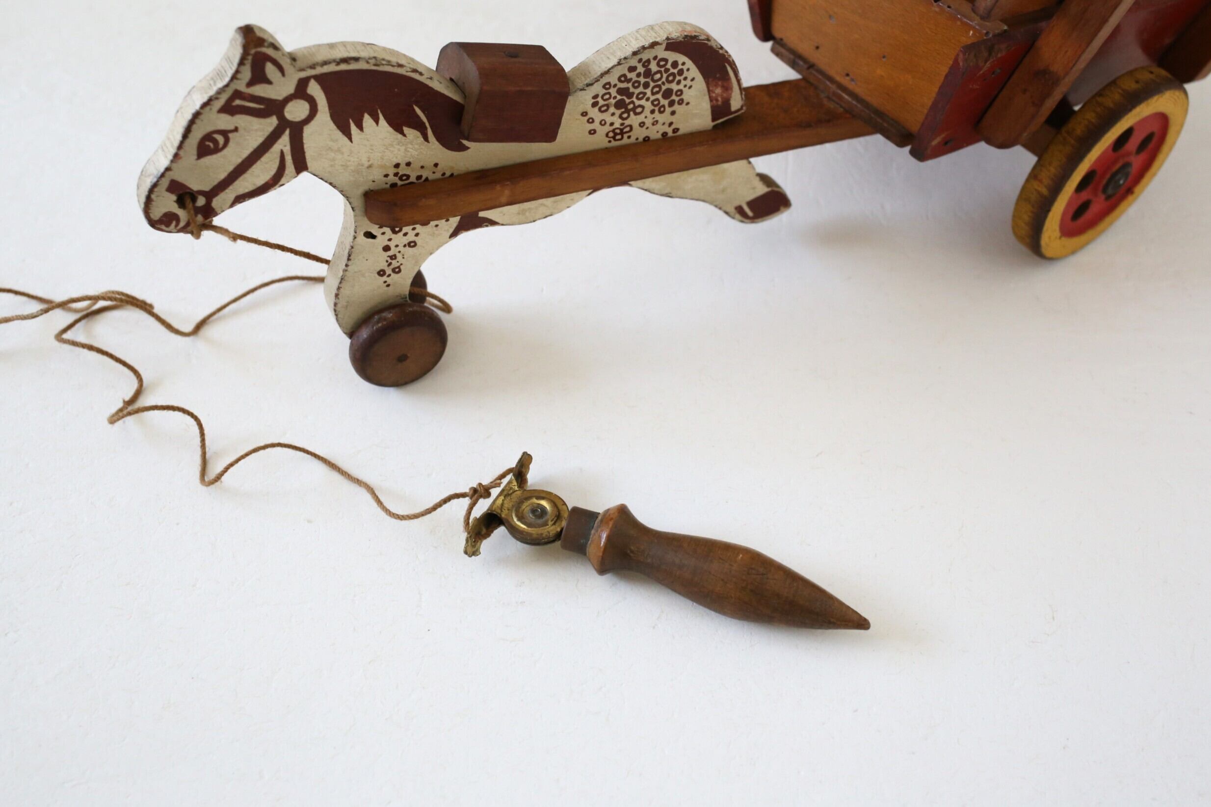 馬車を引っ張る紐の先にはウッドハンドルが付いていていますが、真鍮の金具の付いたとても素敵なハンドルです。