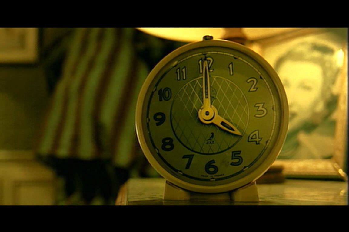 (映画の中では目覚ましベルを止める演出上、時計の上部に目覚ましベルを止めるボタンが付けられていました。)