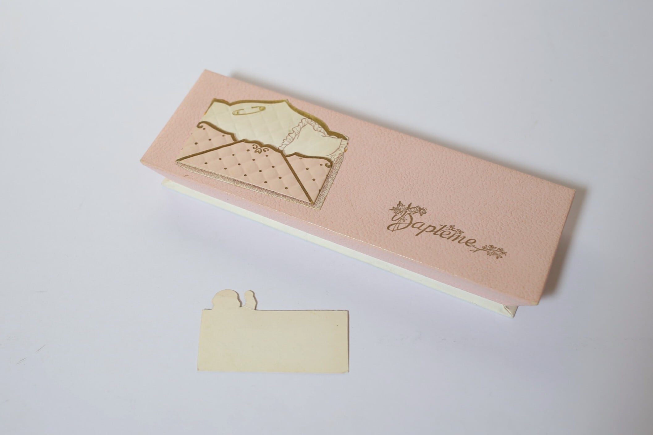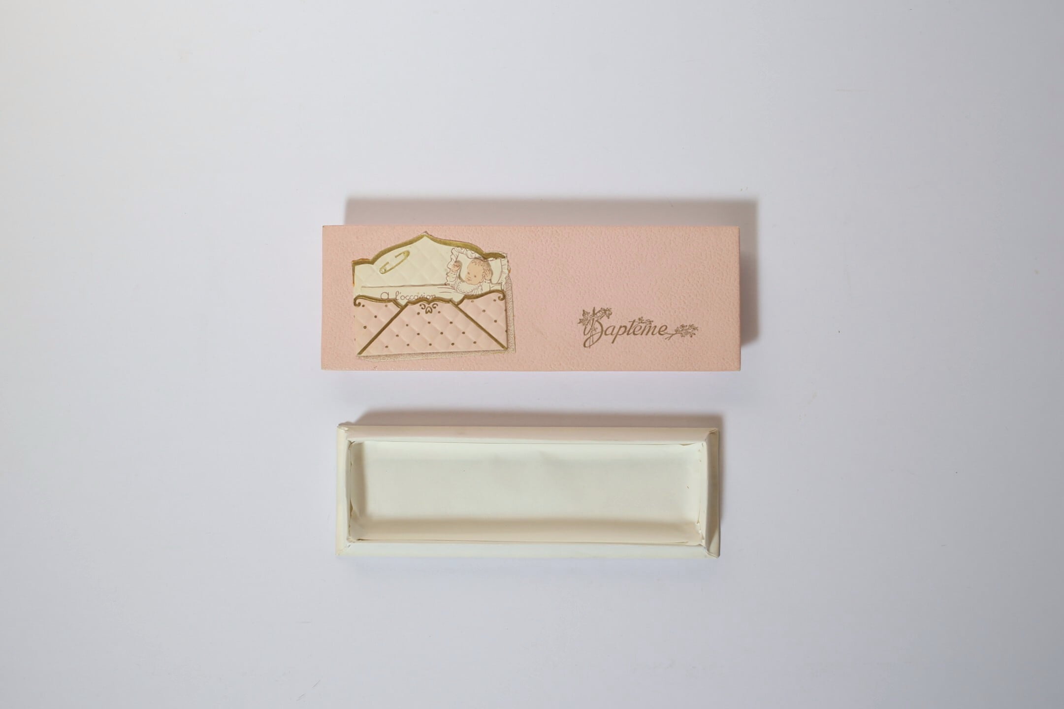 こちらは優しいピンクとゴールドを基調とした蓋にベビーベッドから赤ちゃんが描かれたカードが出てくる可愛らしいデザインの箱です。