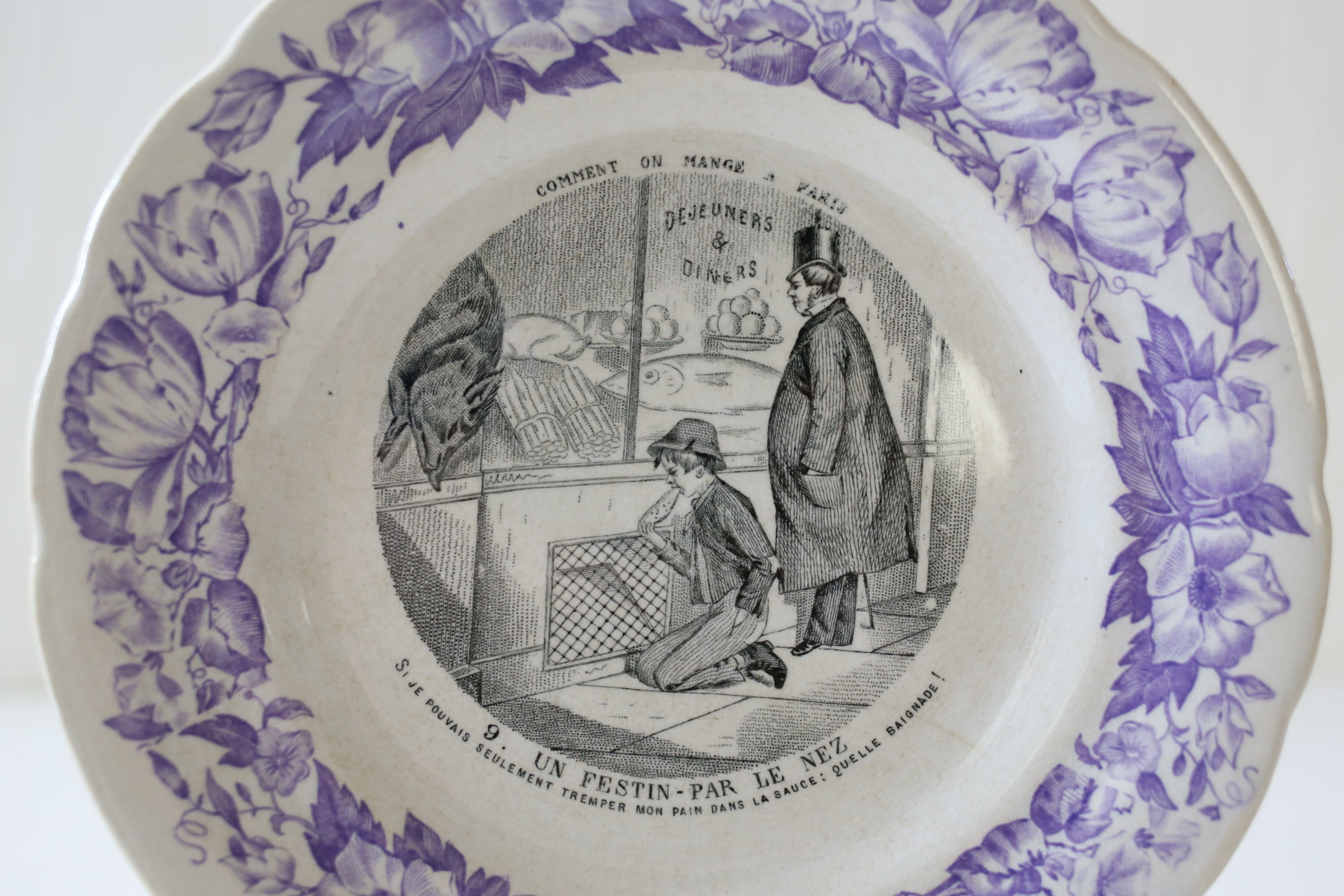 風刺画は『COMMENT ON MANGE A PARIS パリでの食事の仕方』という題名で「UN FESTIN PAR LE NEZ 鼻で味わうご馳走」と書かれ、パンを持った少年が高級食材店のショーウインドー内のご馳走の見ながらパンを頬張っています。