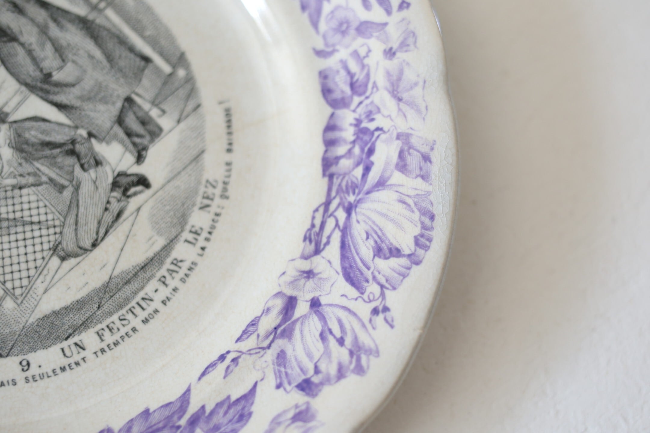 全体に入った細かい貫入や薄っすらと色付いた陶器はなんとも趣があり、リムの優しいフリルやパープルの花のガーランド模様の美しさを引き立てています。