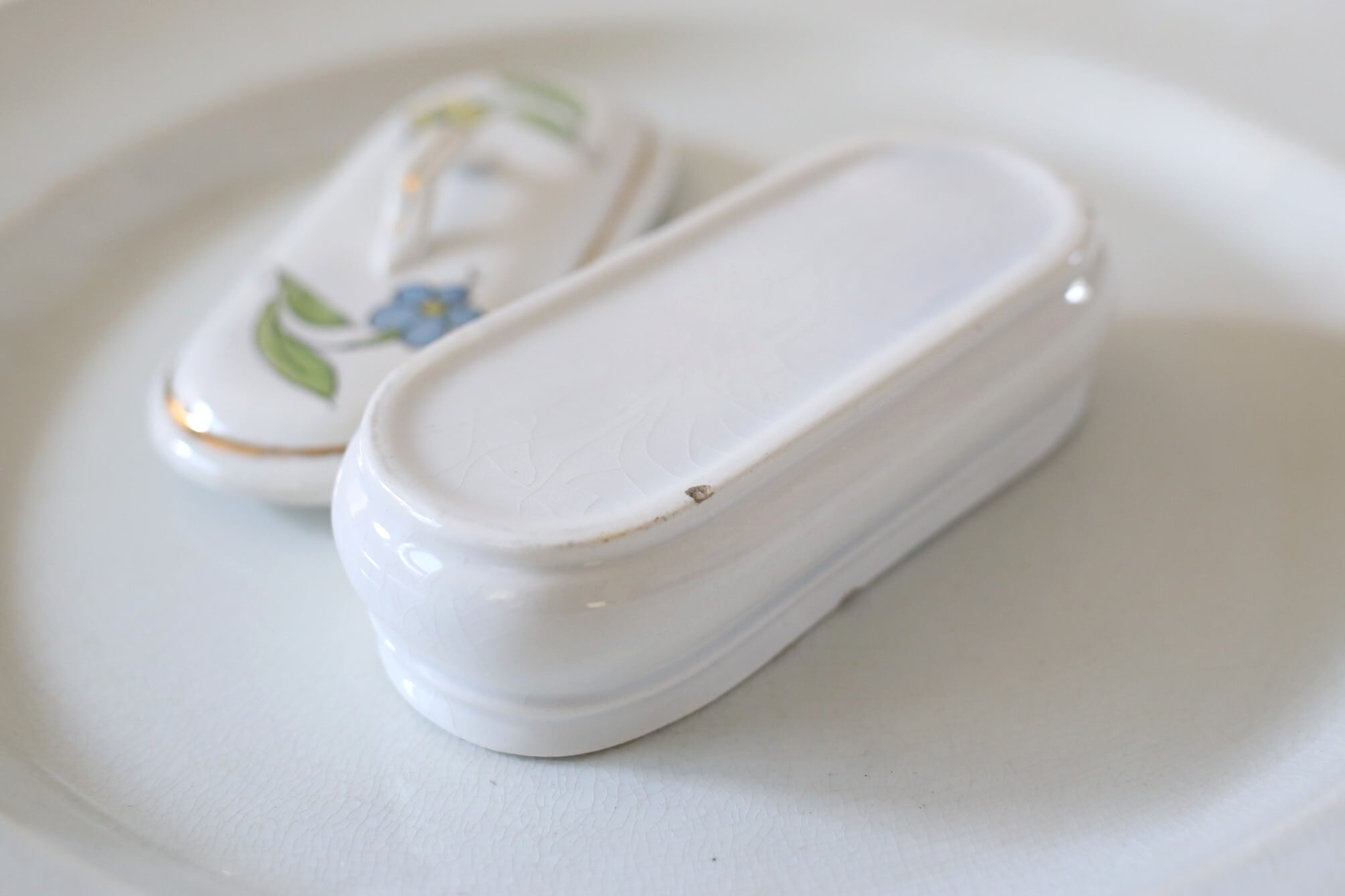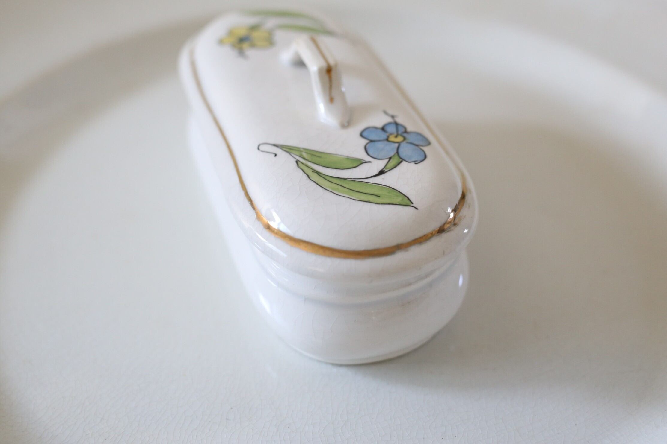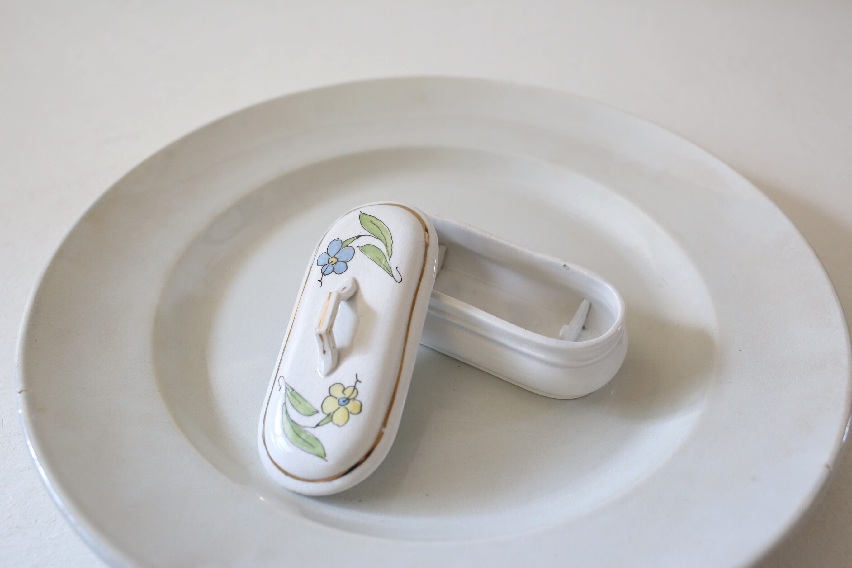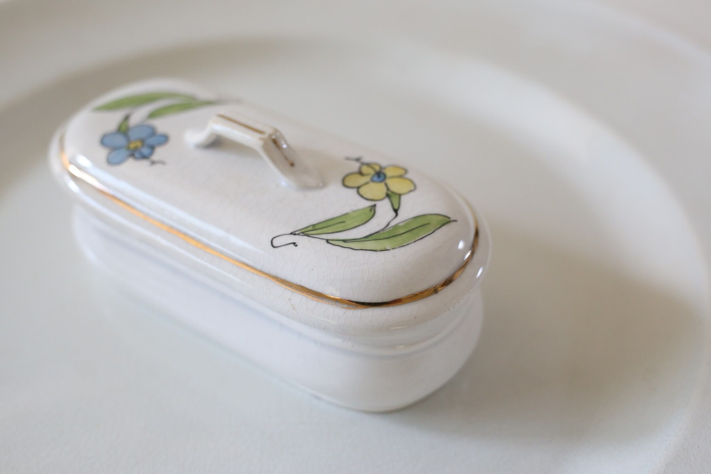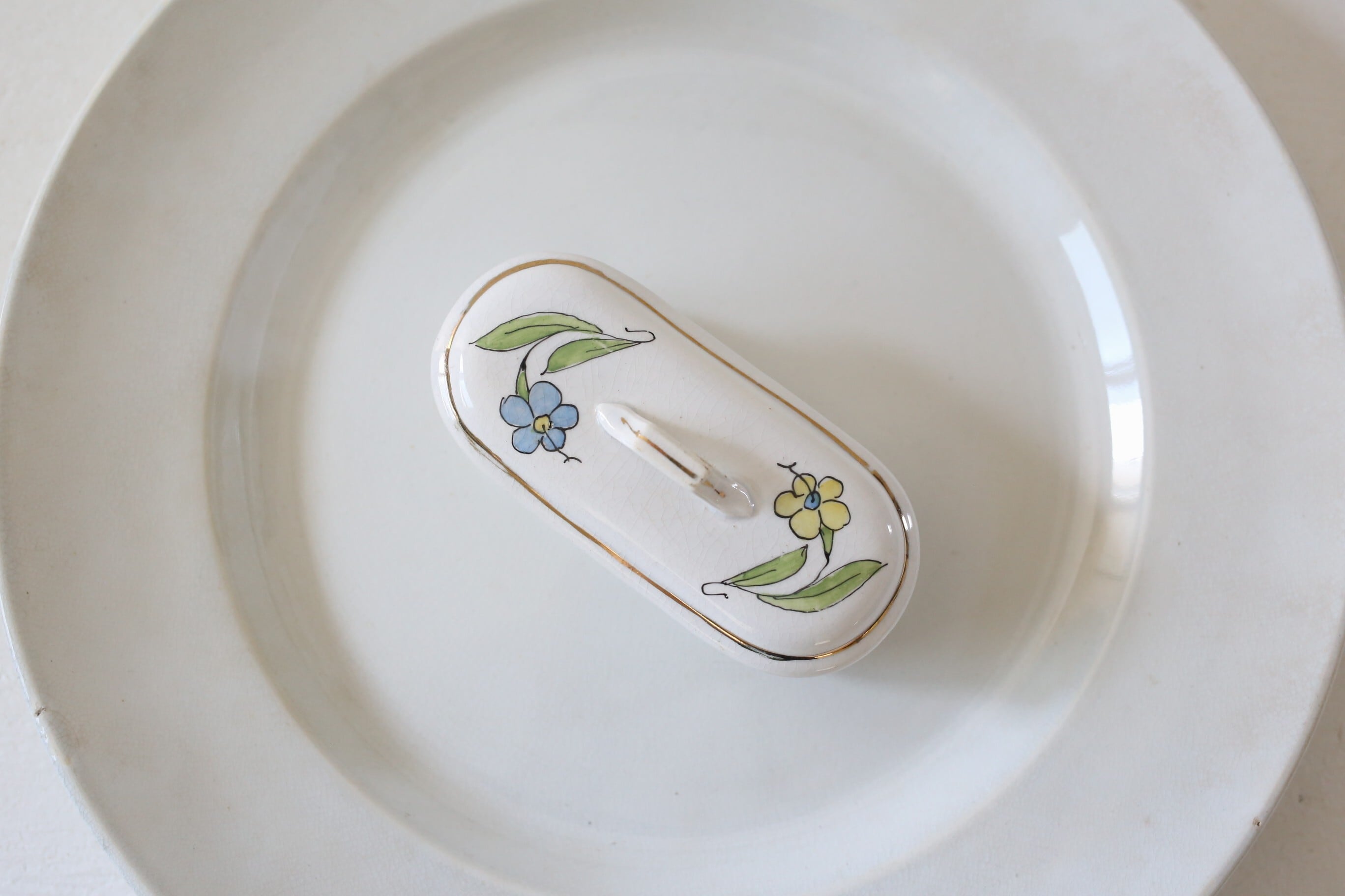 以前この柄と同じシリーズの洗面台周りの陶器セットを見かけたことがあるので、おそらくそのセットの一つと思われます。