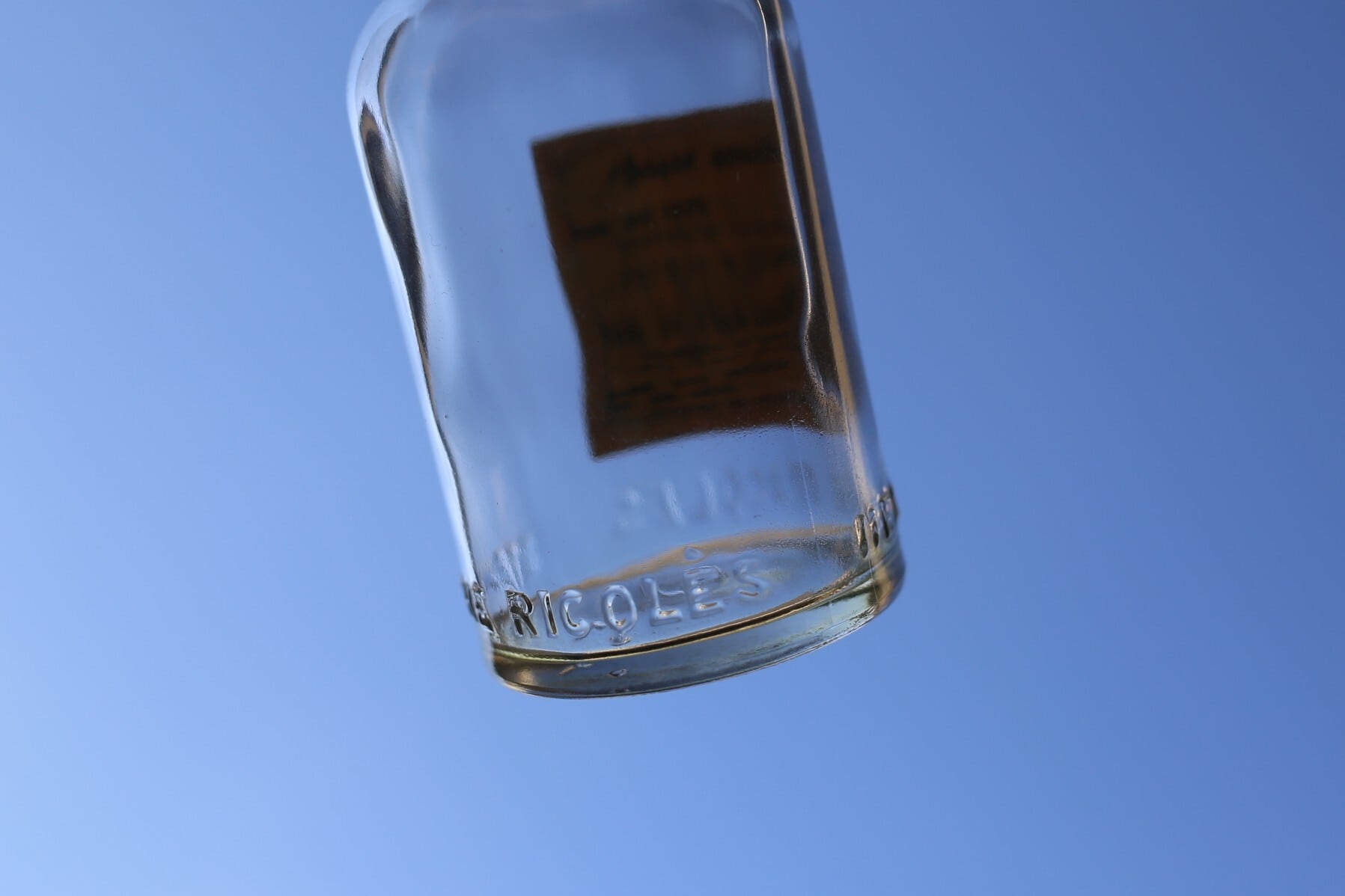古いガラスならではの不均一な揺らめきや、ガラス自体に入ったエンボスの文字も良い雰囲気です。