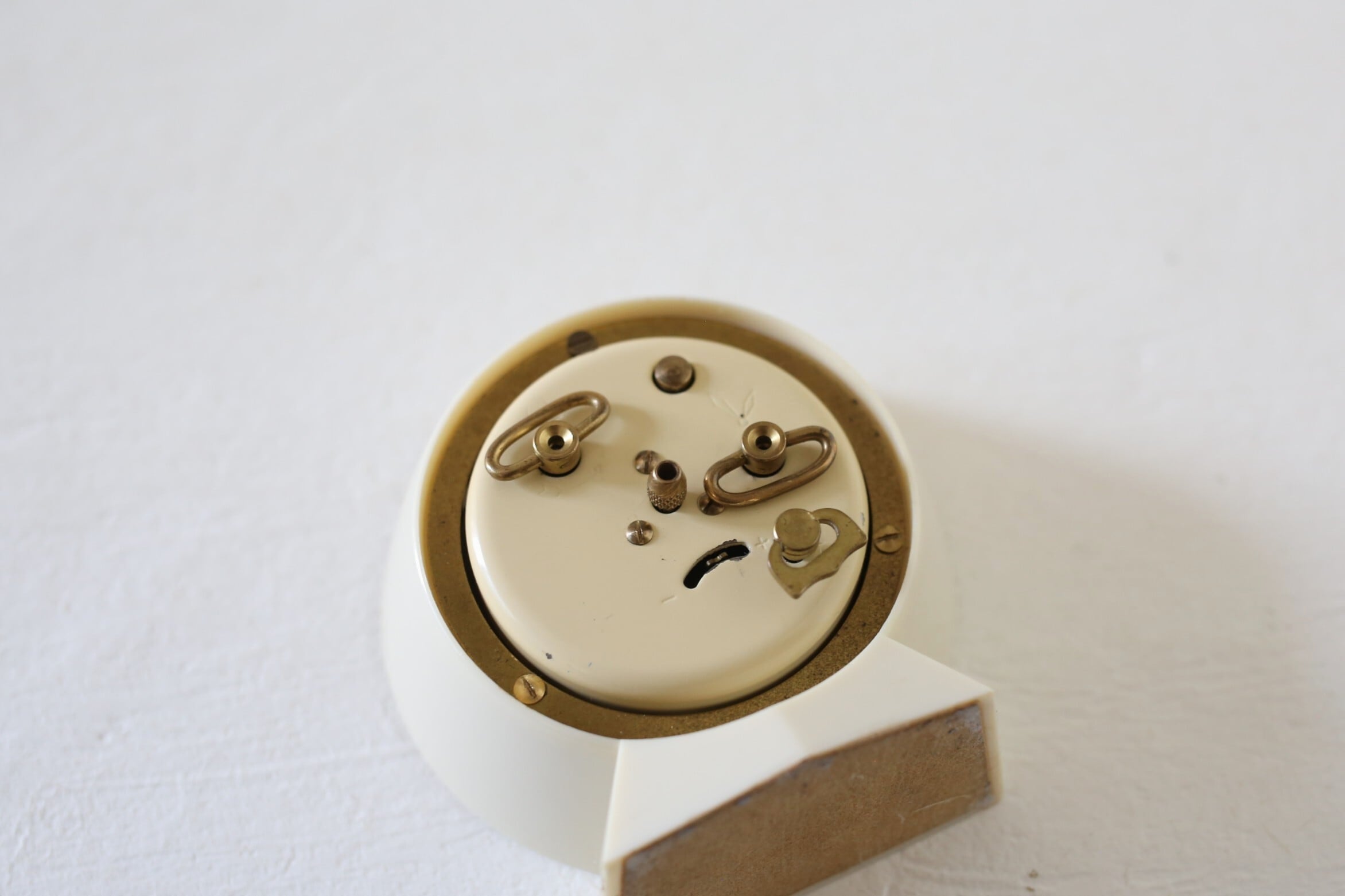 裏面の右側のゼンマイが時計のムーブメント用、左側のゼンマイがアラーム用です。