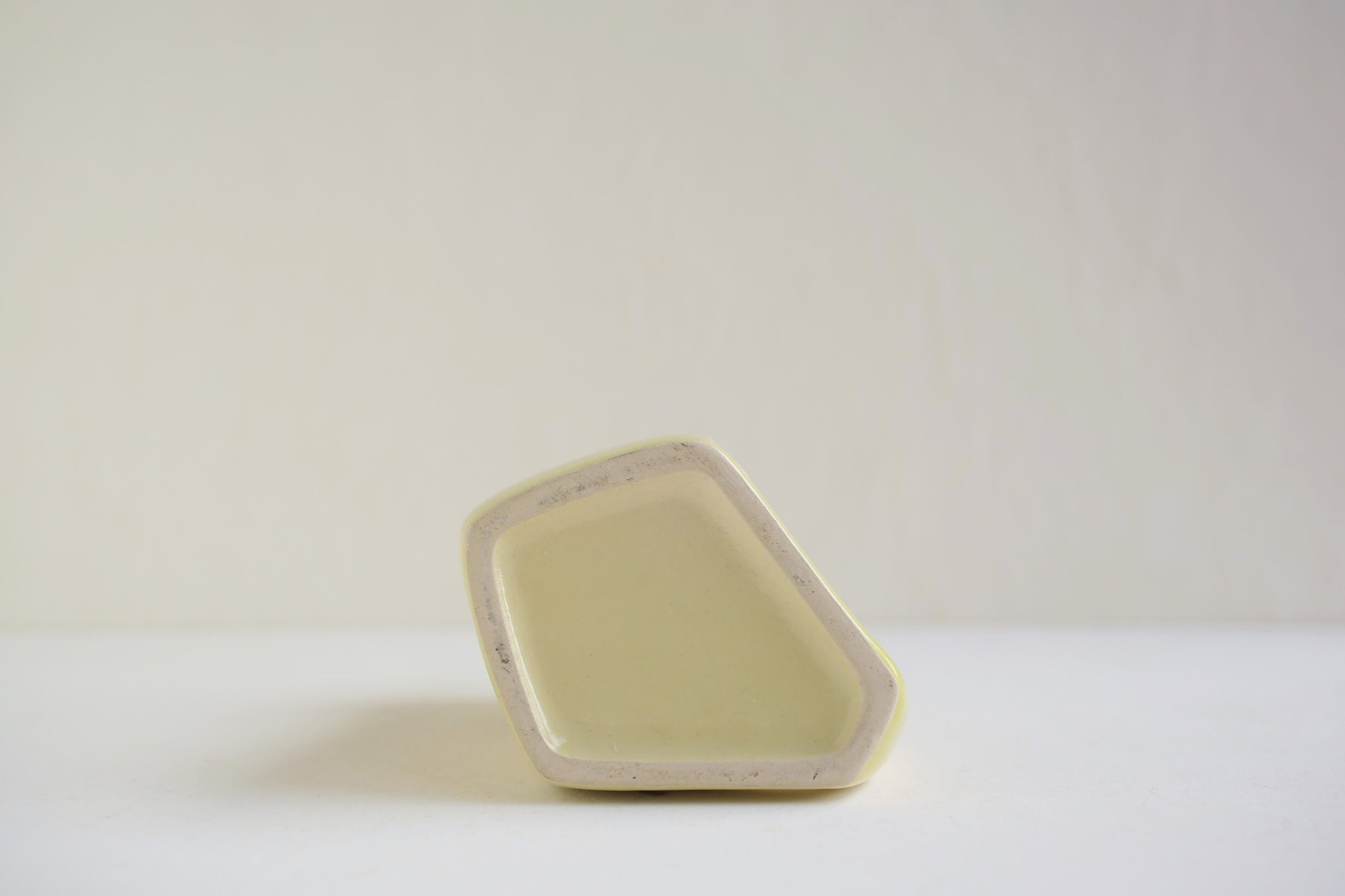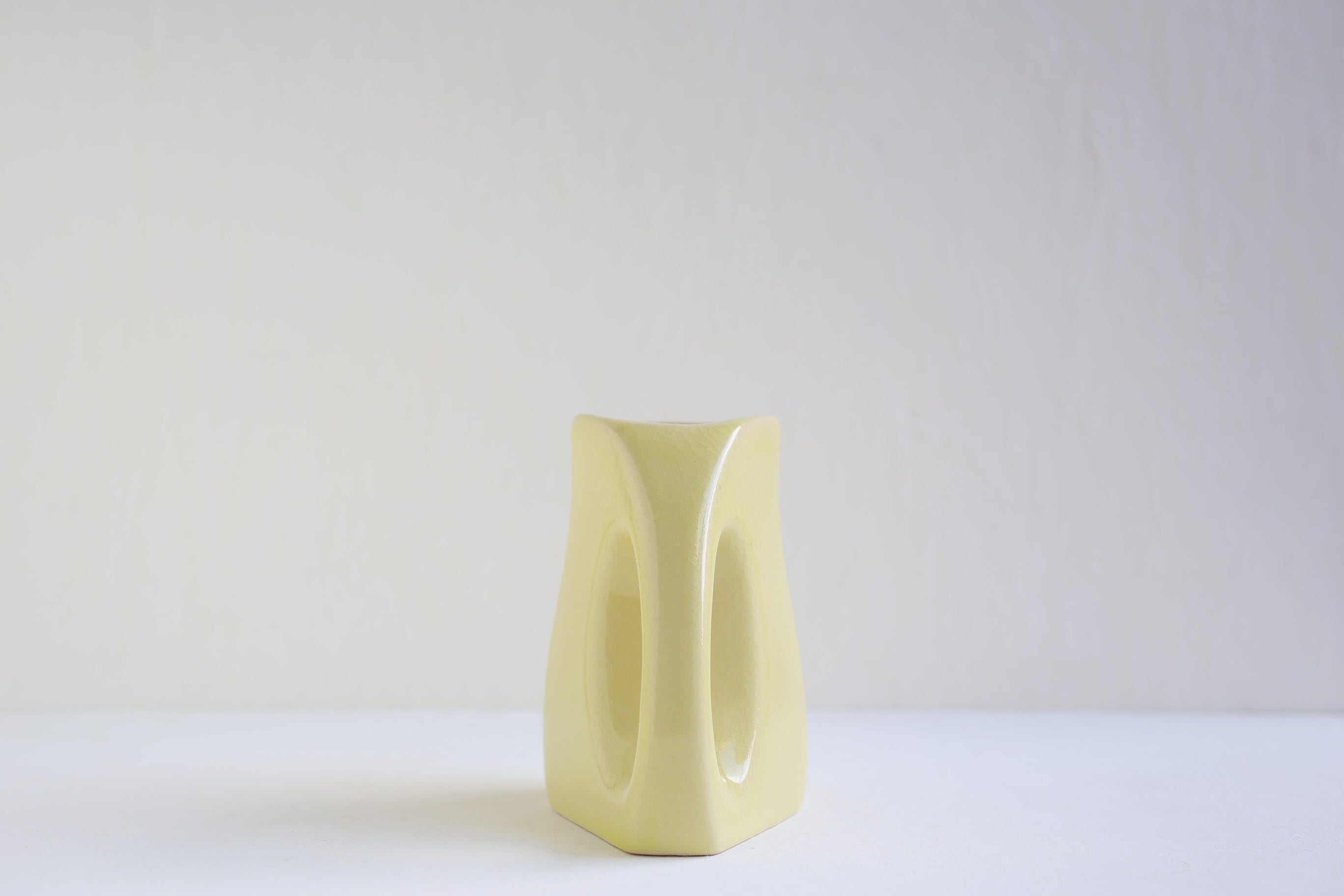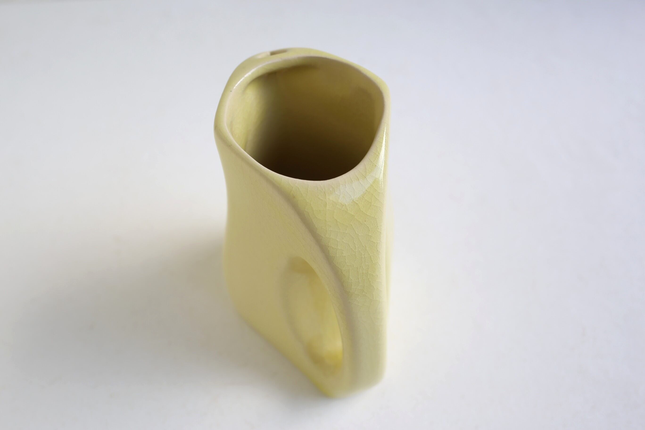 厚手の陶器の質感や特徴的なフォルム、クリーム色がかった優しい黄色のカラーが目を引き、全体に入った貫入の風合いも素敵です。