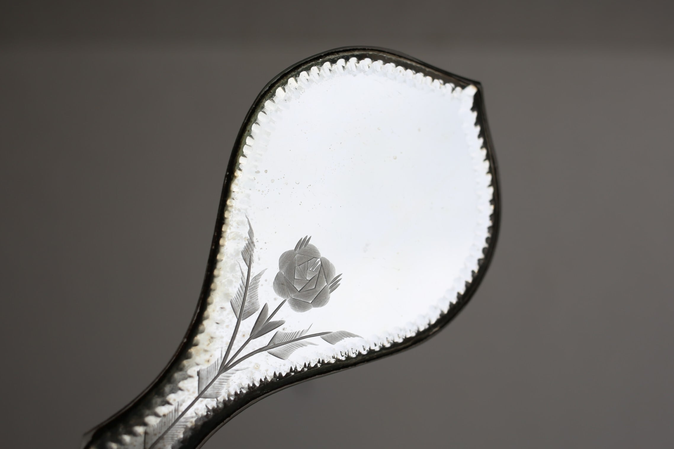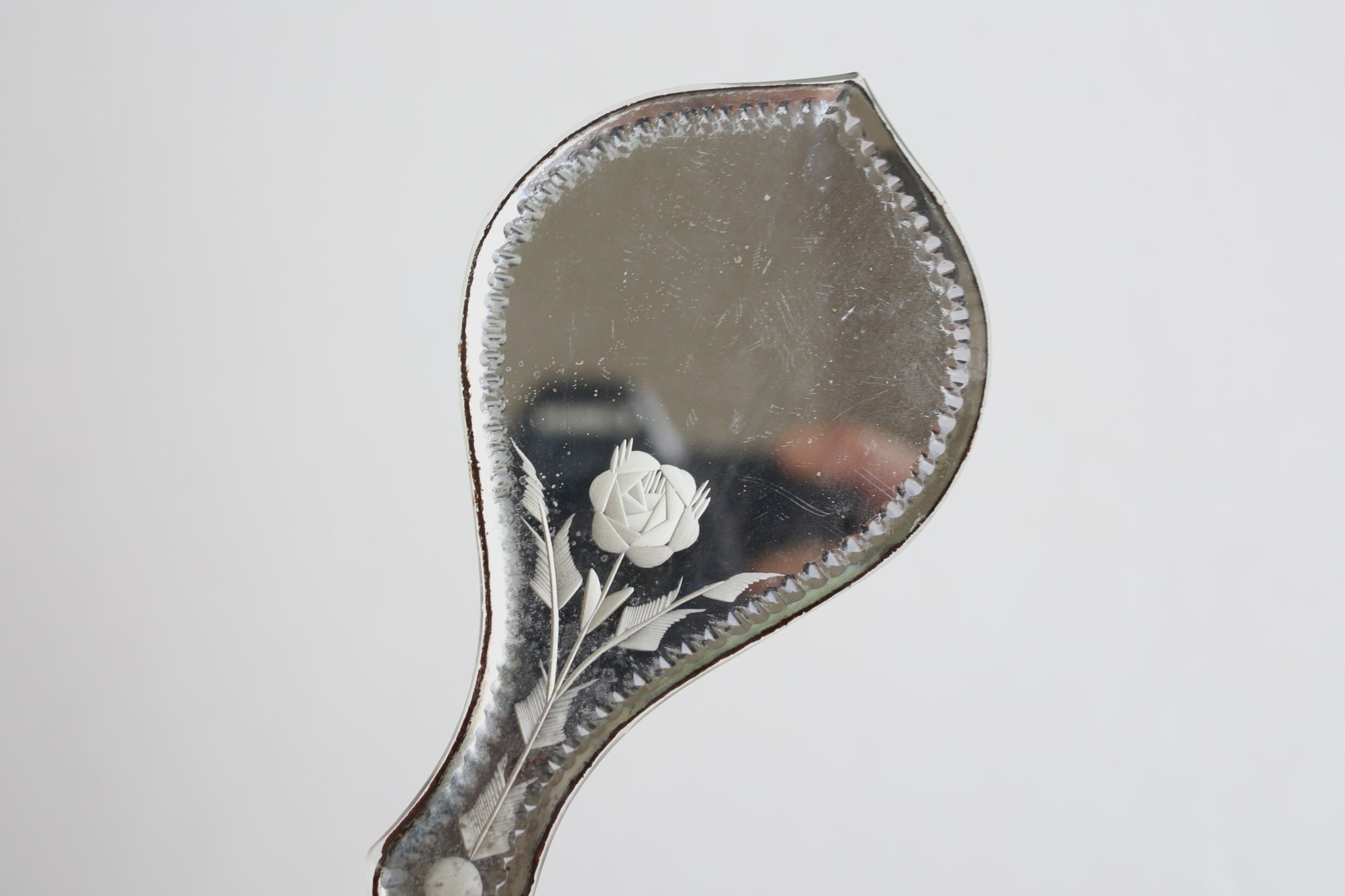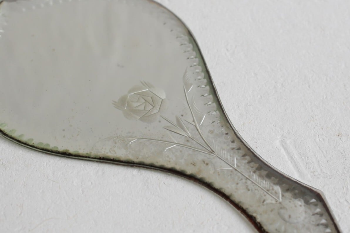 エッチングで描かれた繊細な一輪の花や面取りされパール模様にカットされた縁取りが大変美しく趣のあるミラーです。