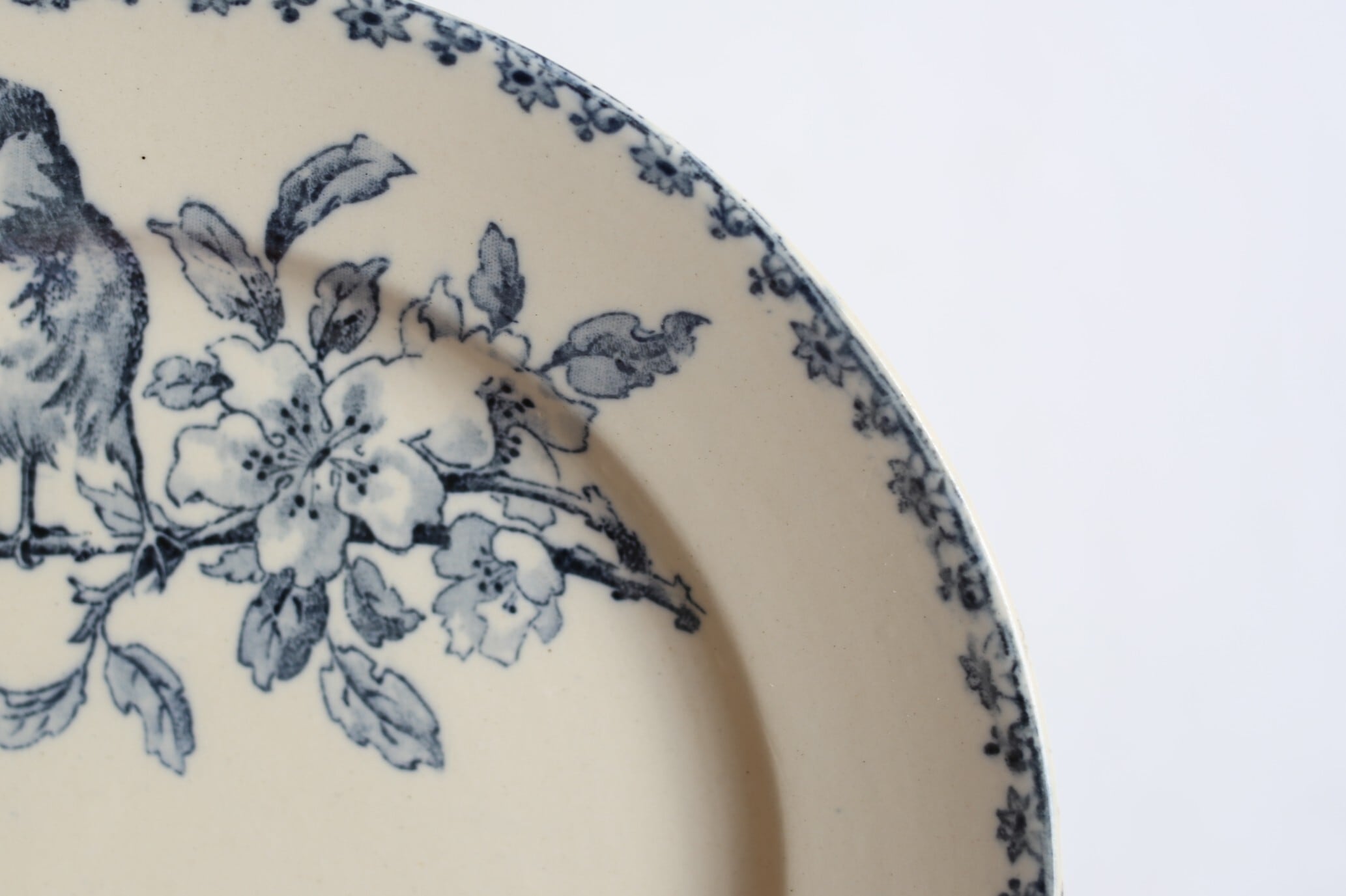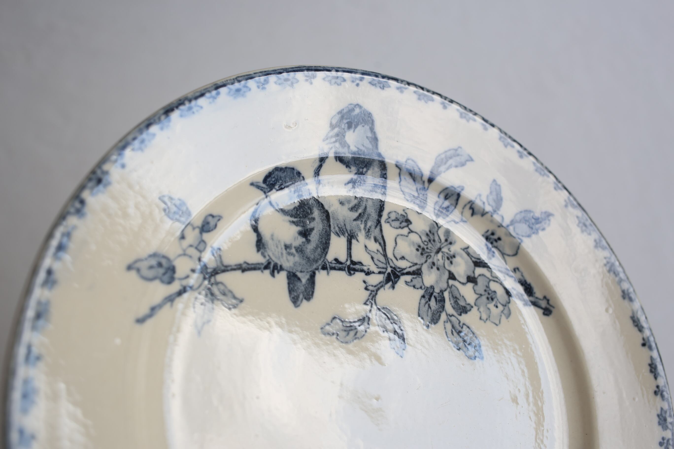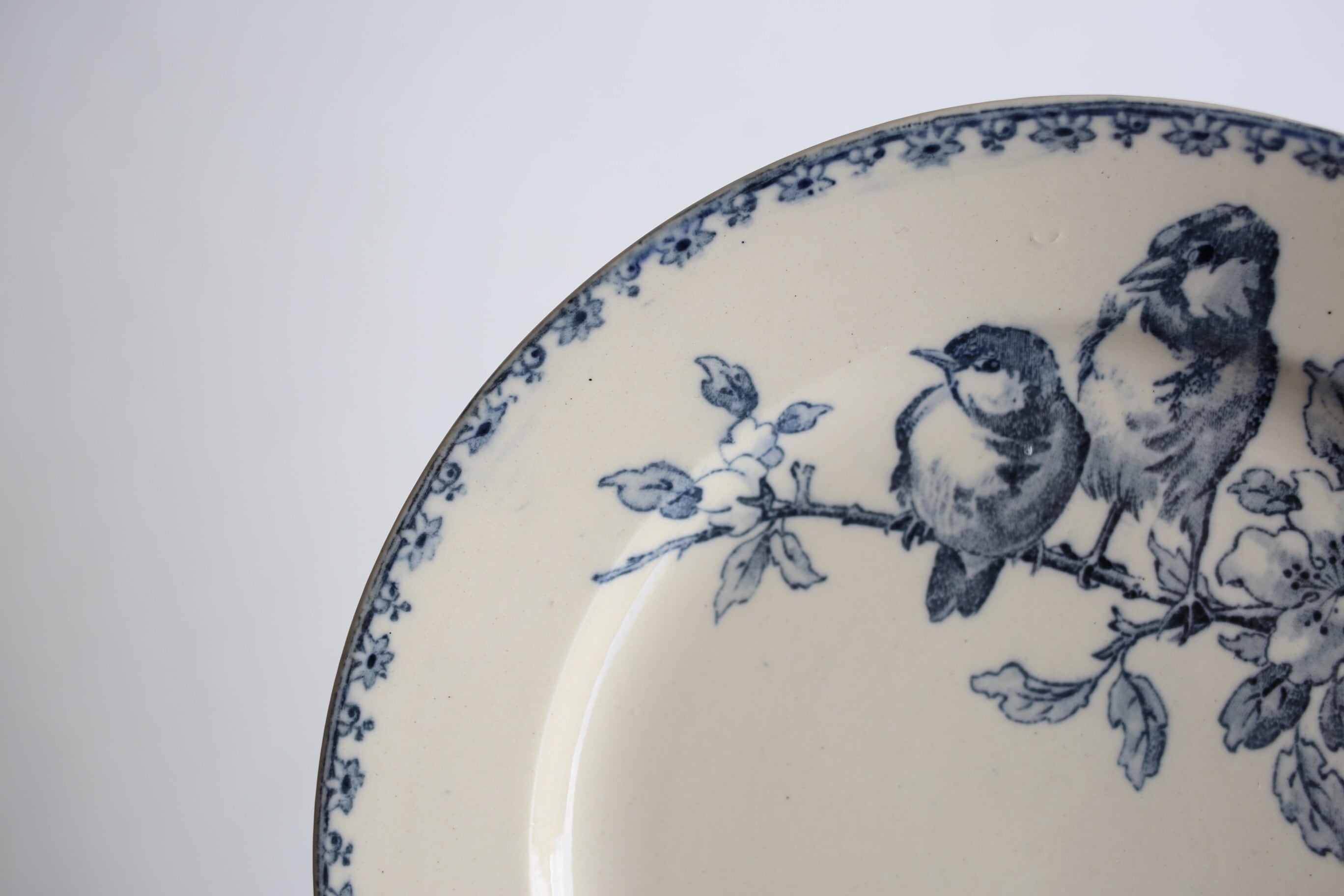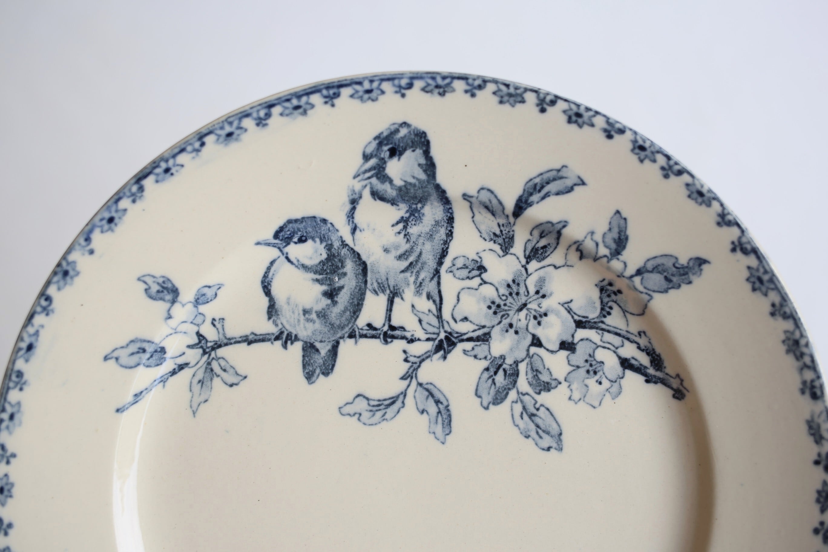こちらは淡いインディゴブルーで二羽の小鳥が小枝にとまる様子が繊細に描かれています。