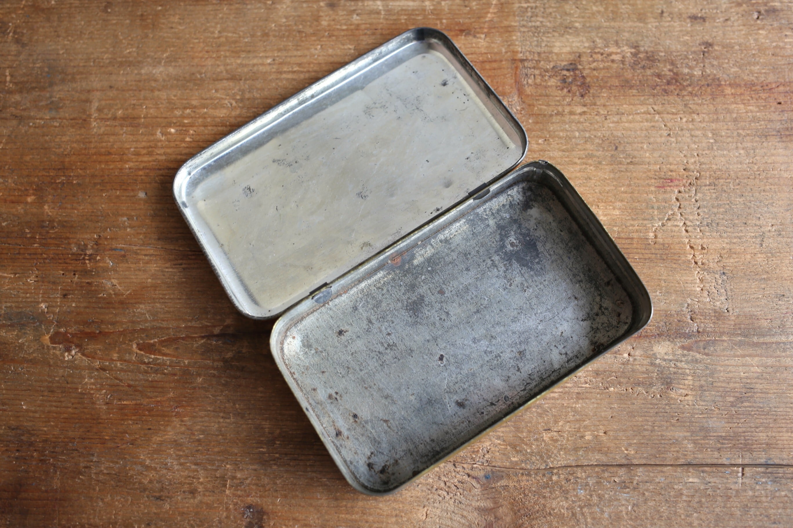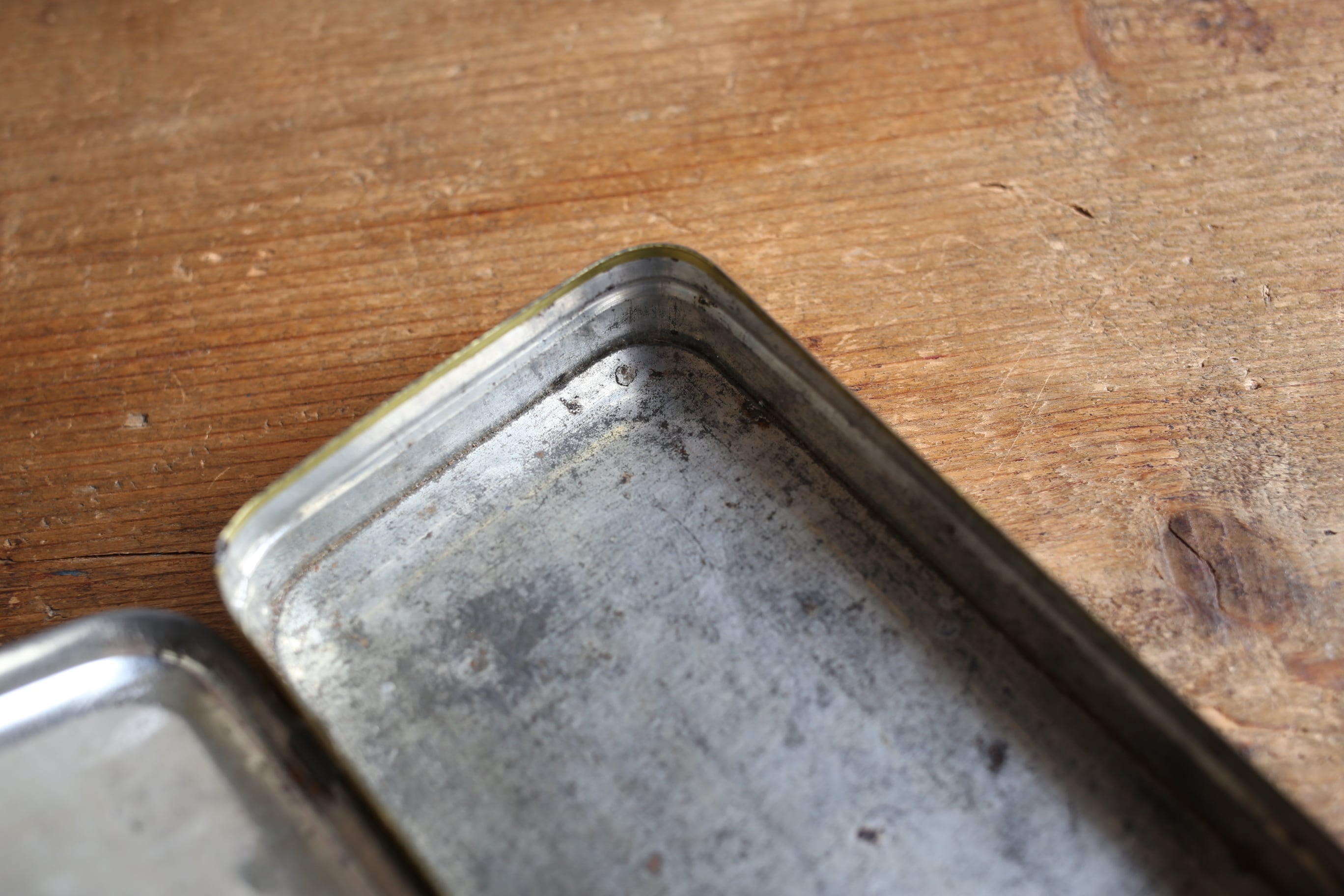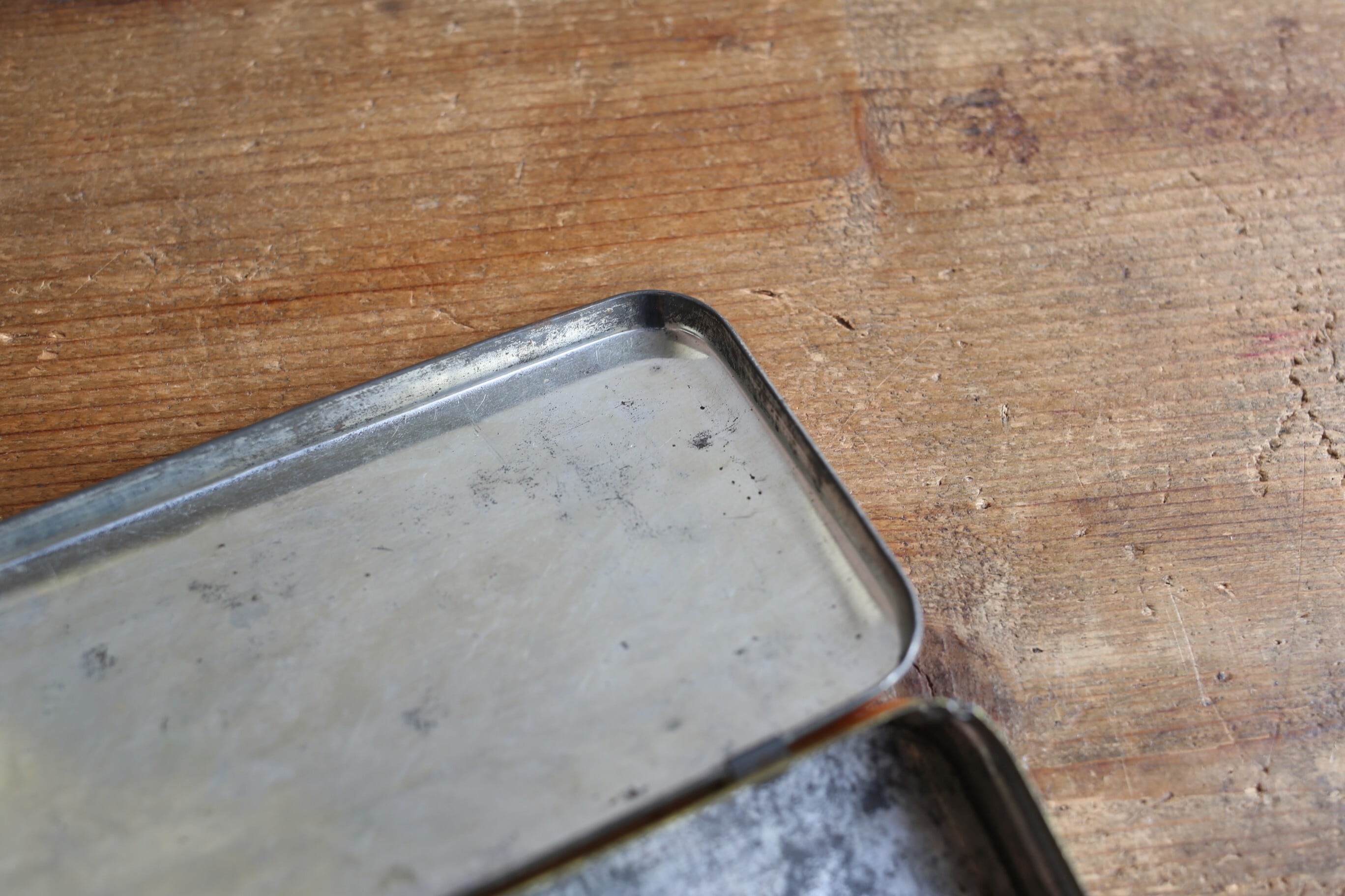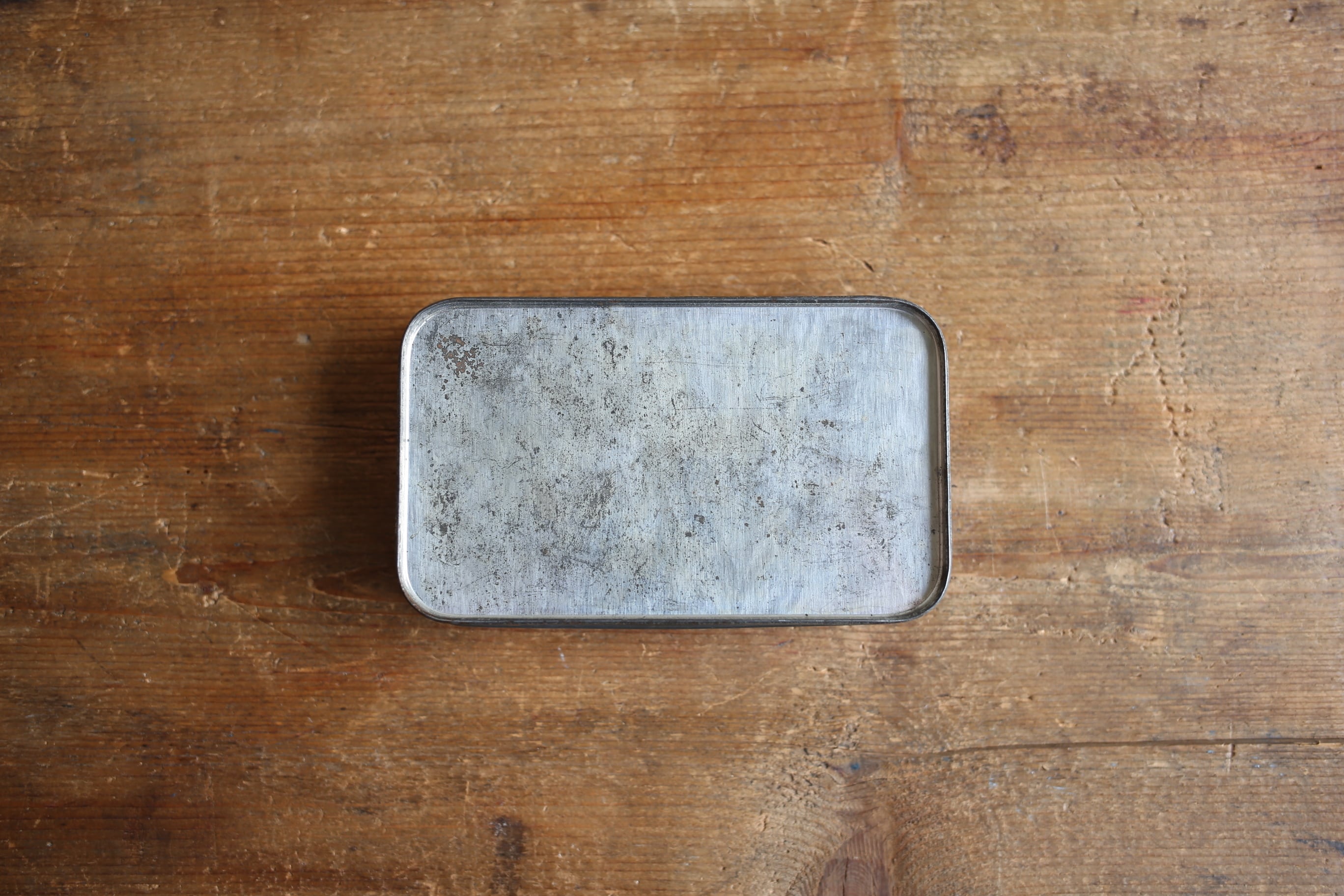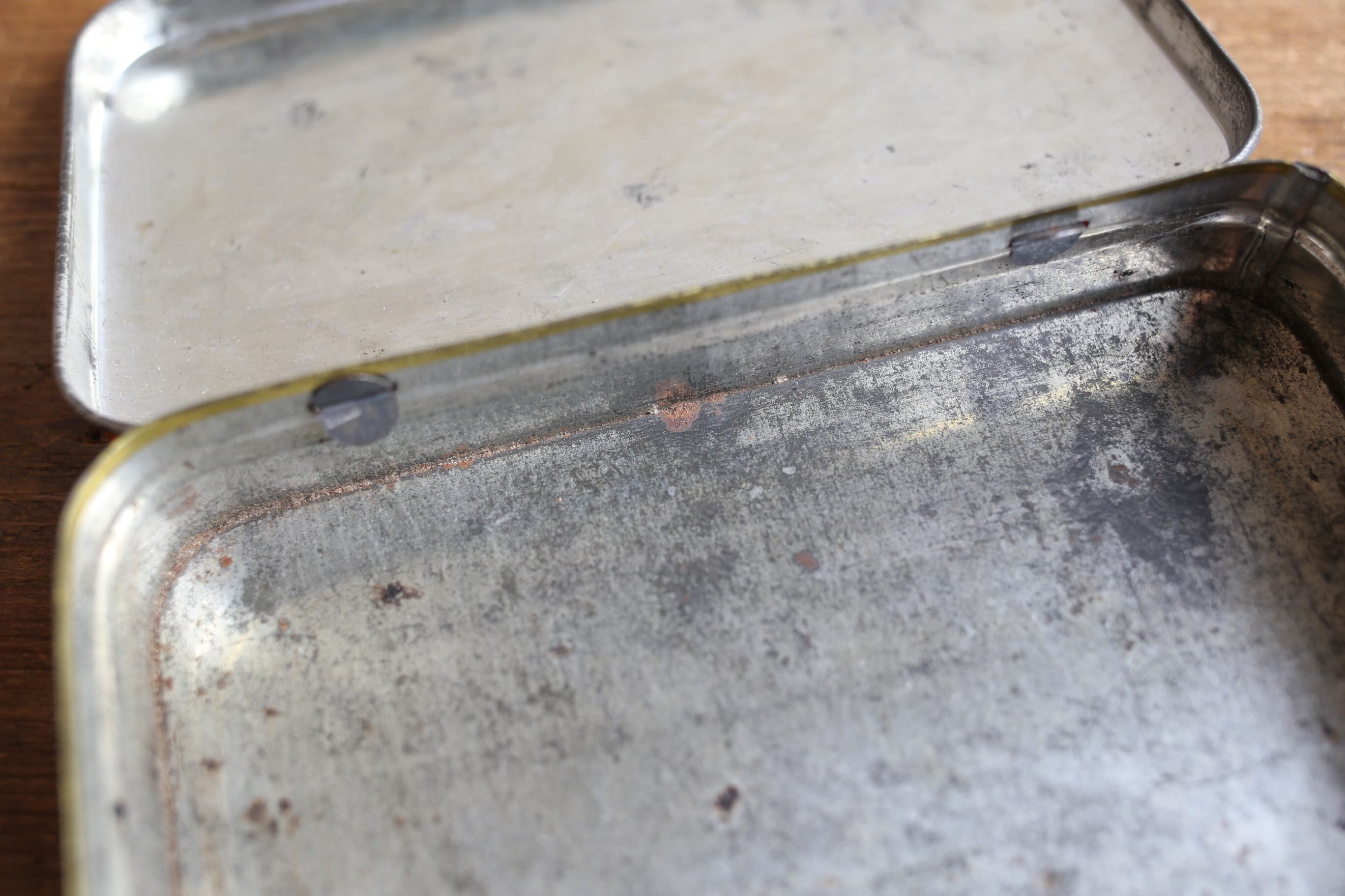 クスミやキズ、わずかにサビや小さなアタリはありますが、ブリキ缶ならではの趣きがあり、
