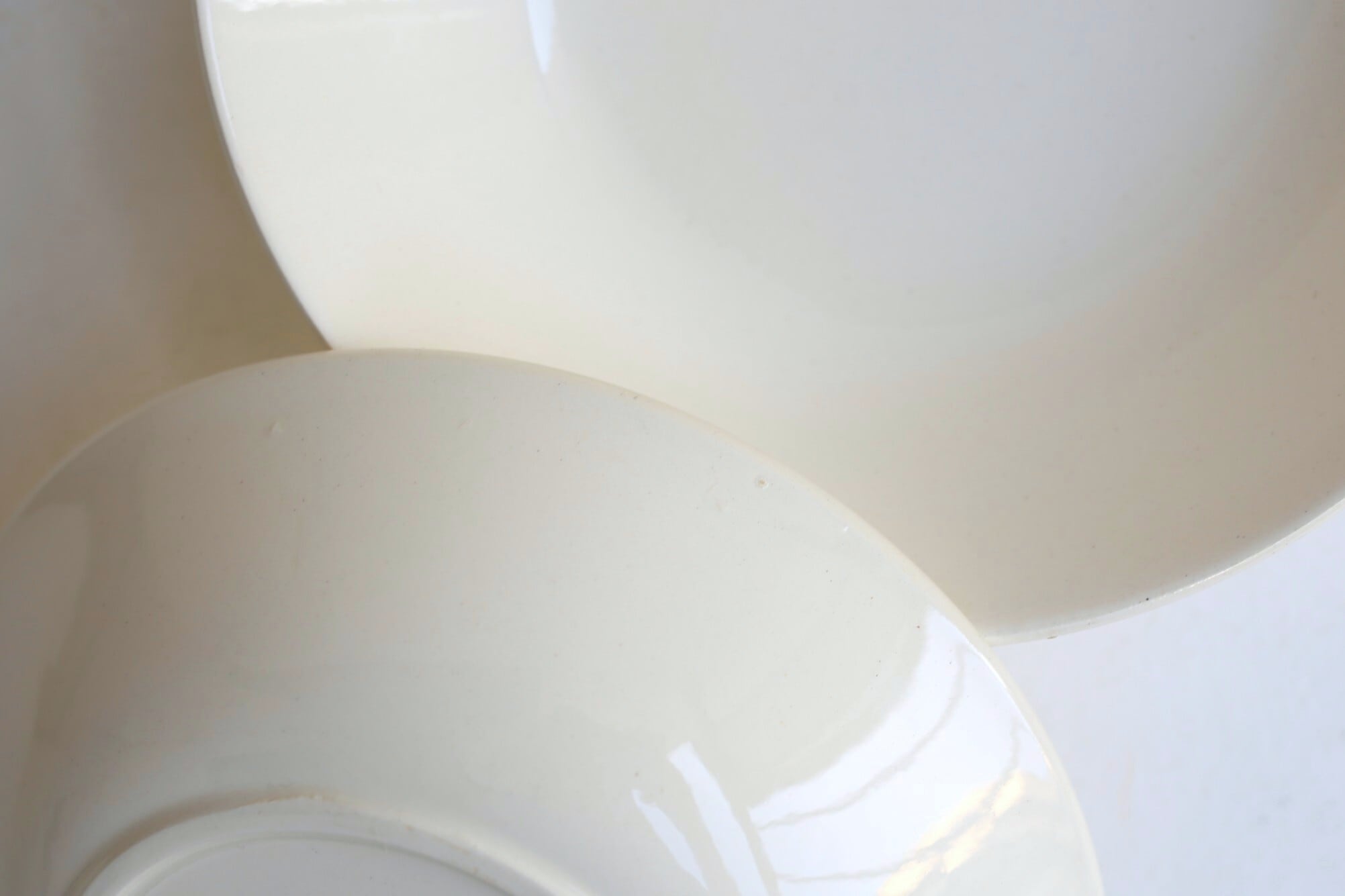 リムのない滑らかなフォルムのアイボリーの深皿は、サラダやスープ、煮込みやデザートなどいろいろな用途に用いられたものと思われます。
