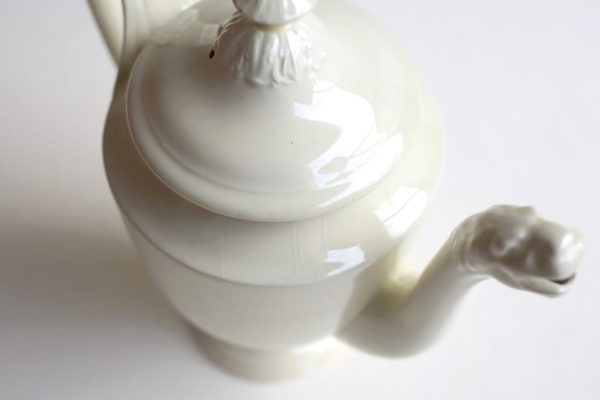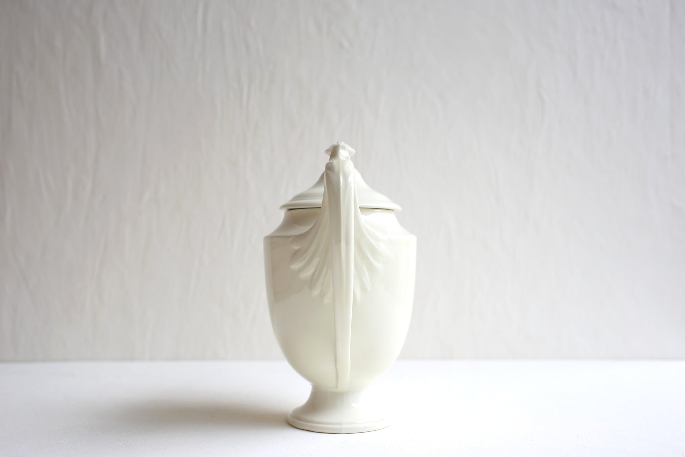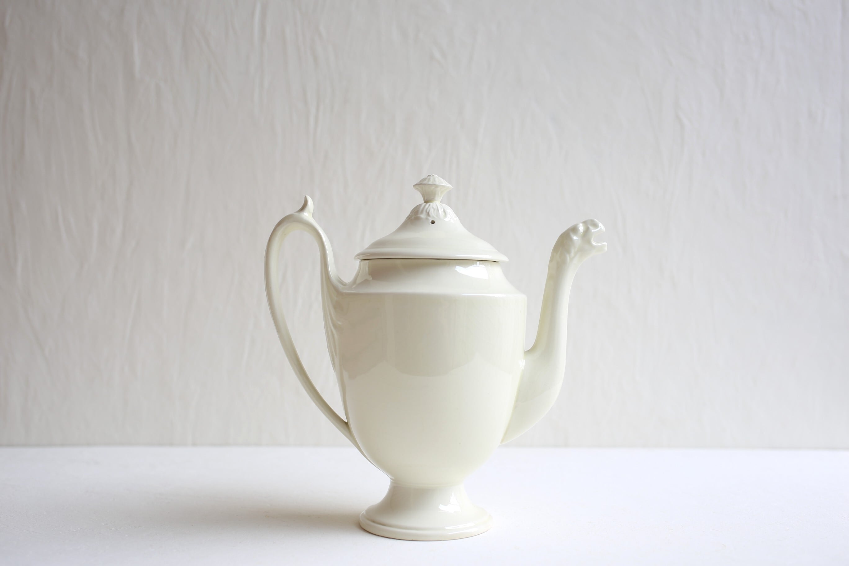 滑らかな曲線とくびれのある優雅なフォルムに、注ぎ口、ハンドル、蓋のつまみのそれぞれに装飾が施された美しい逸品です。