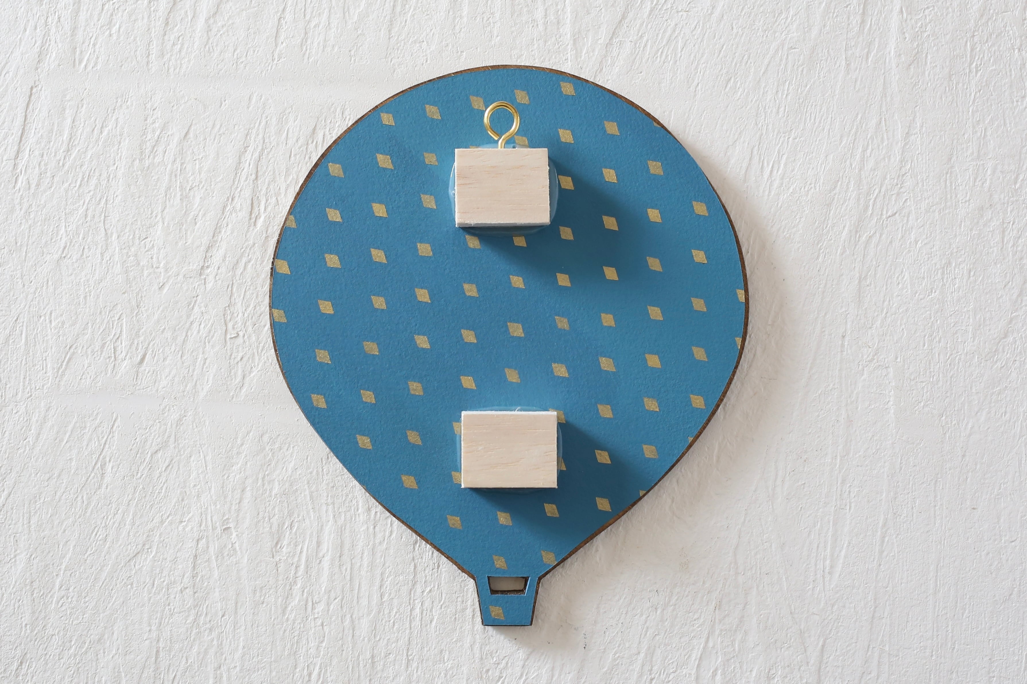 気球型に加工した木製板を土台に制作した手描きのアクリル画です。