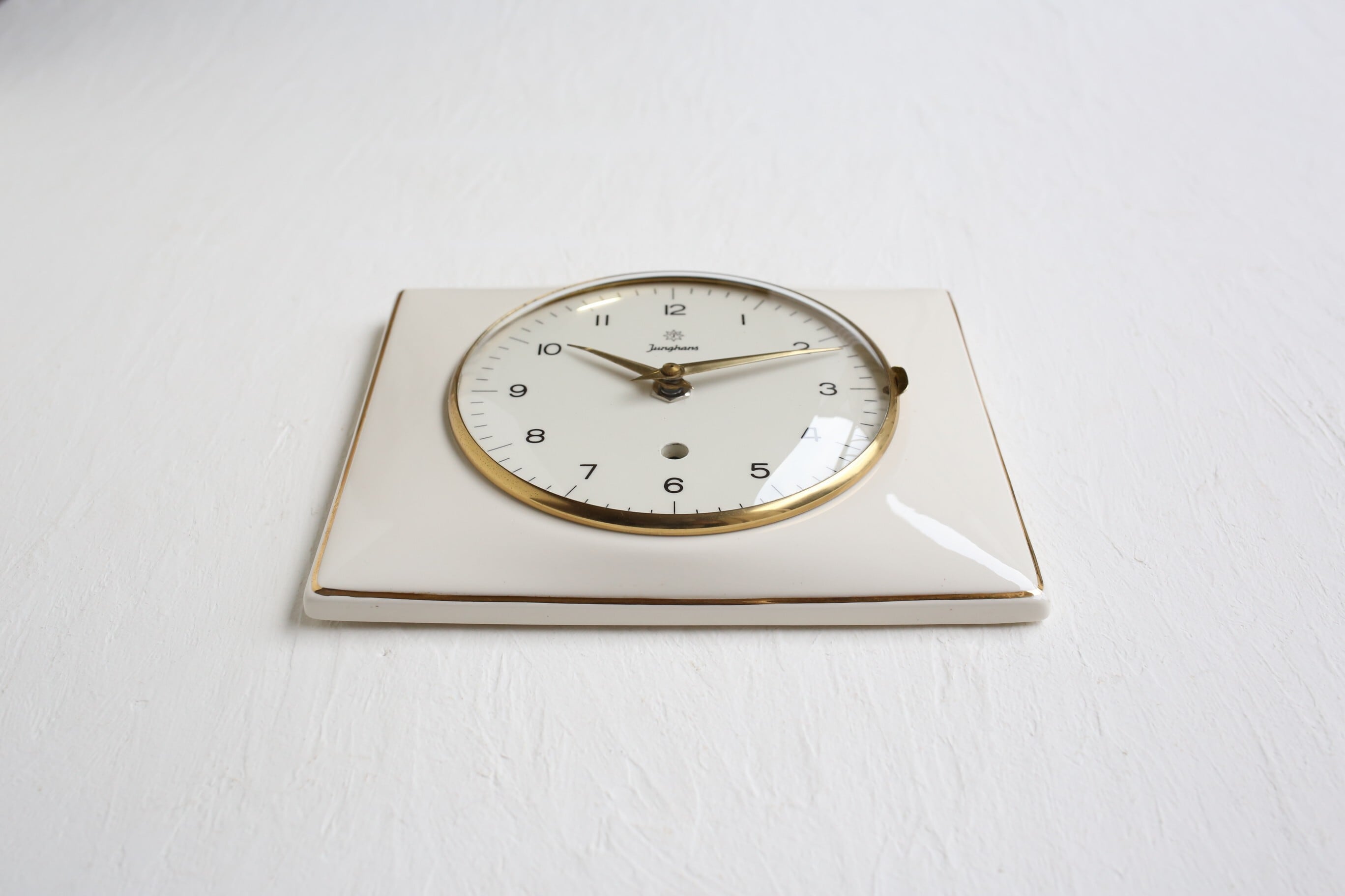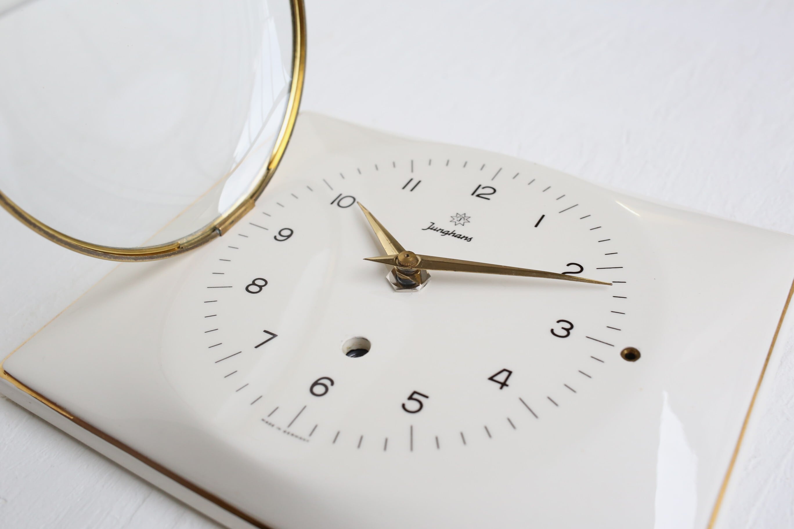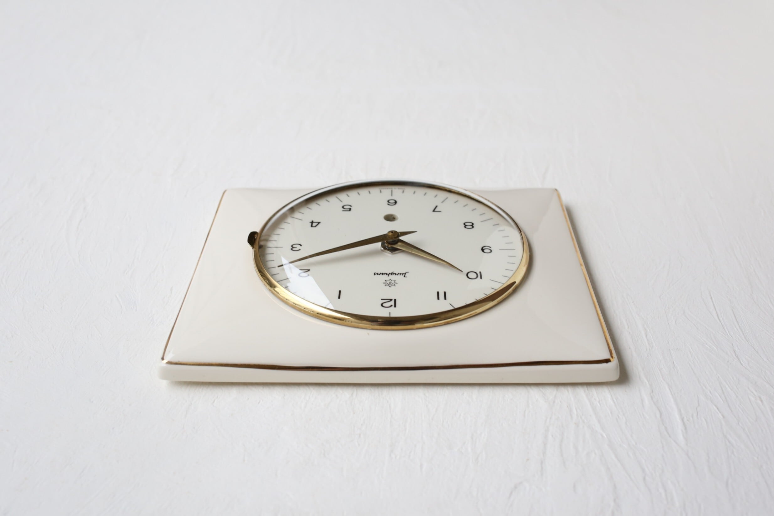 ドイツ アンティーク ヴィンテージ Junghans ユンハンス 陶器 掛時計 アイボリー×ゴールド(単3電池式クォーツ交換済)N-05184