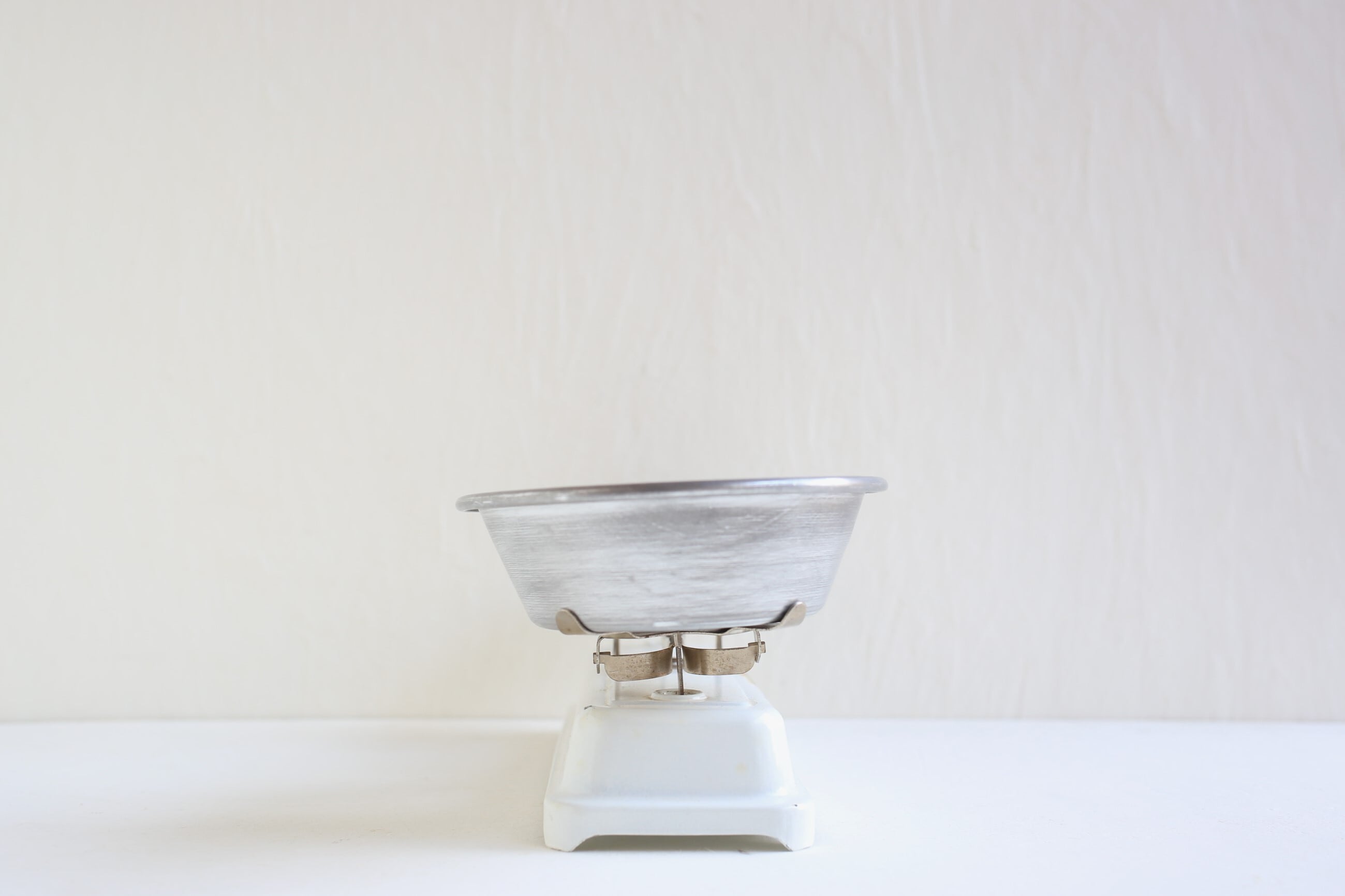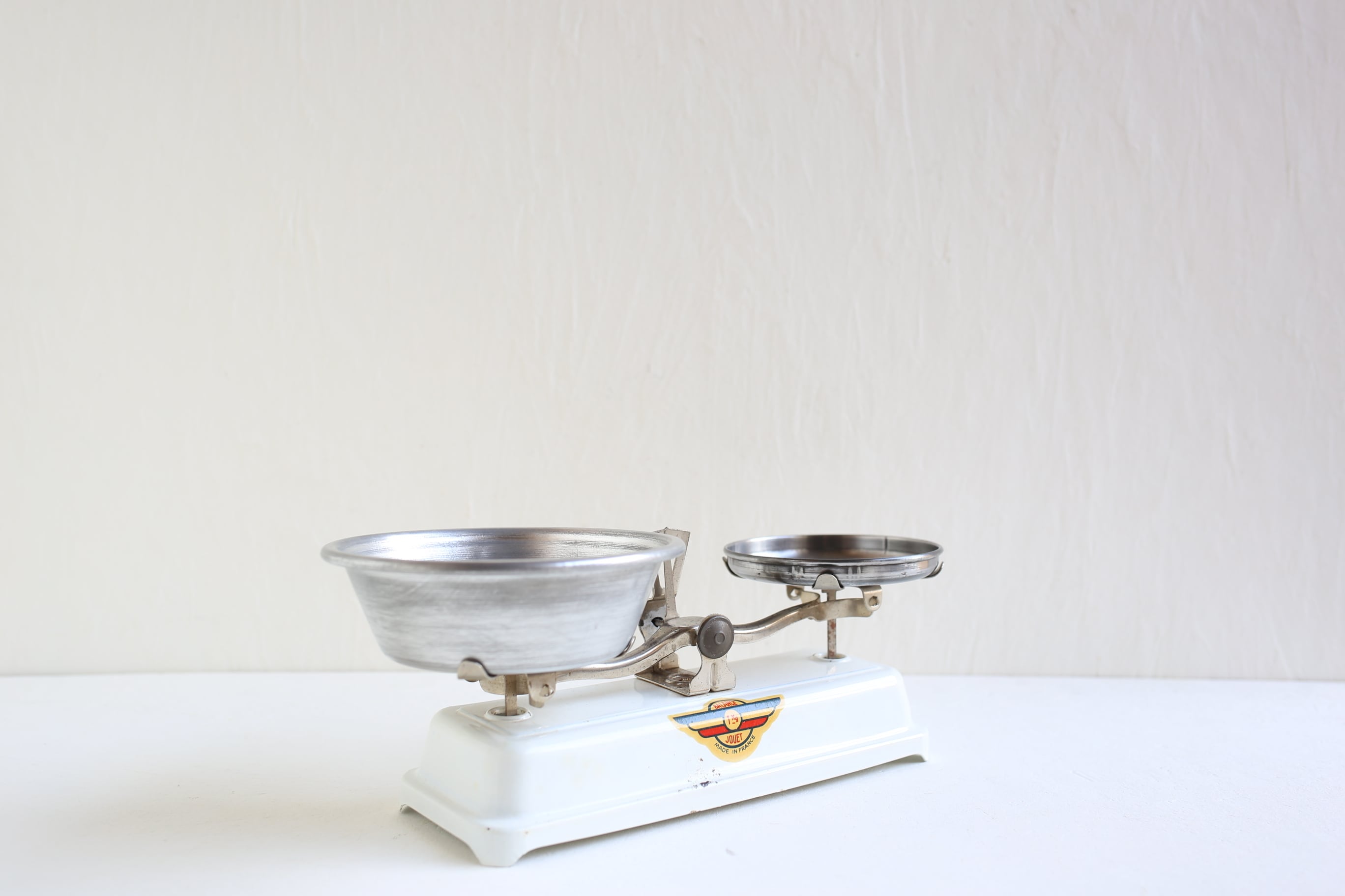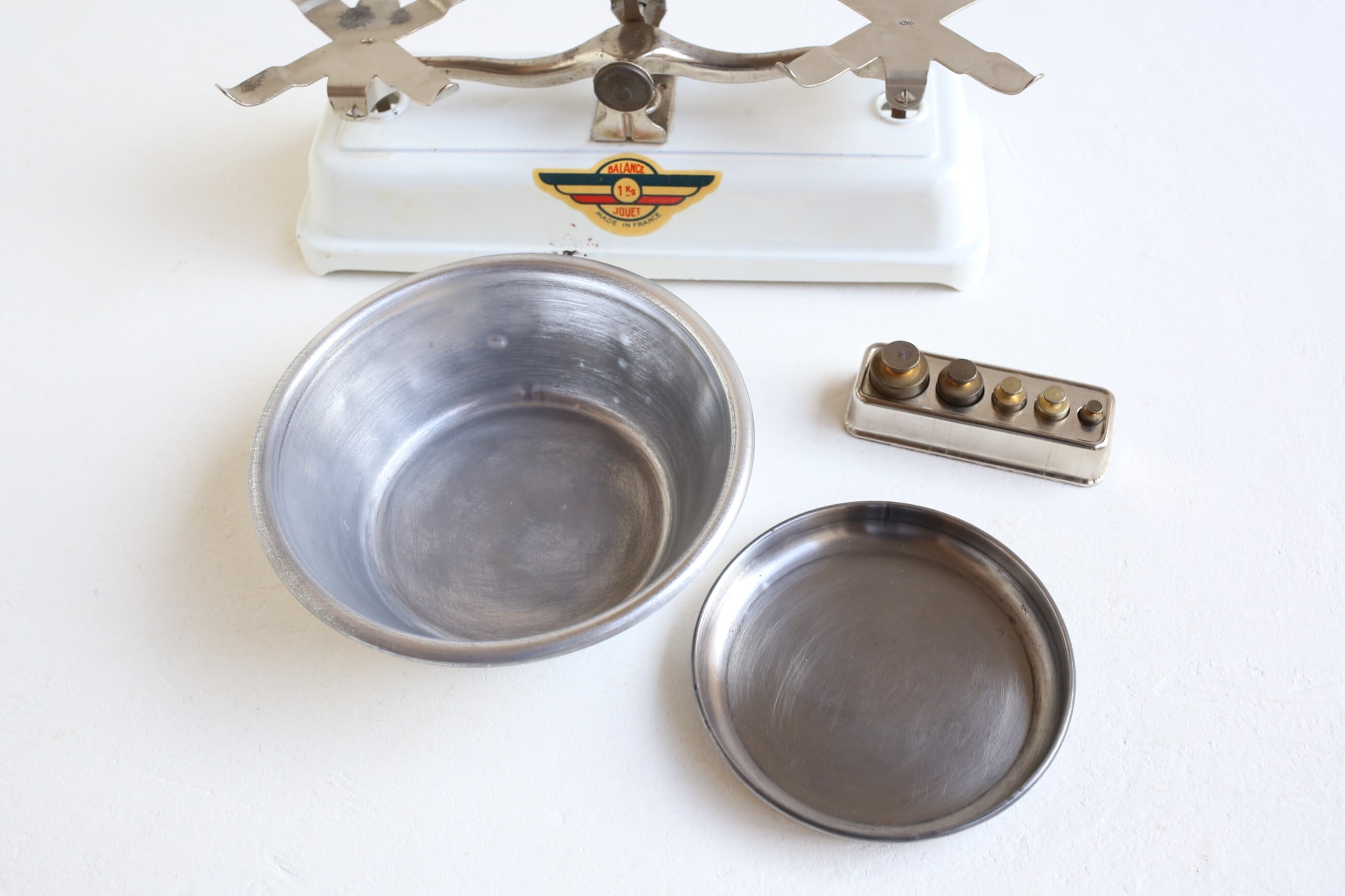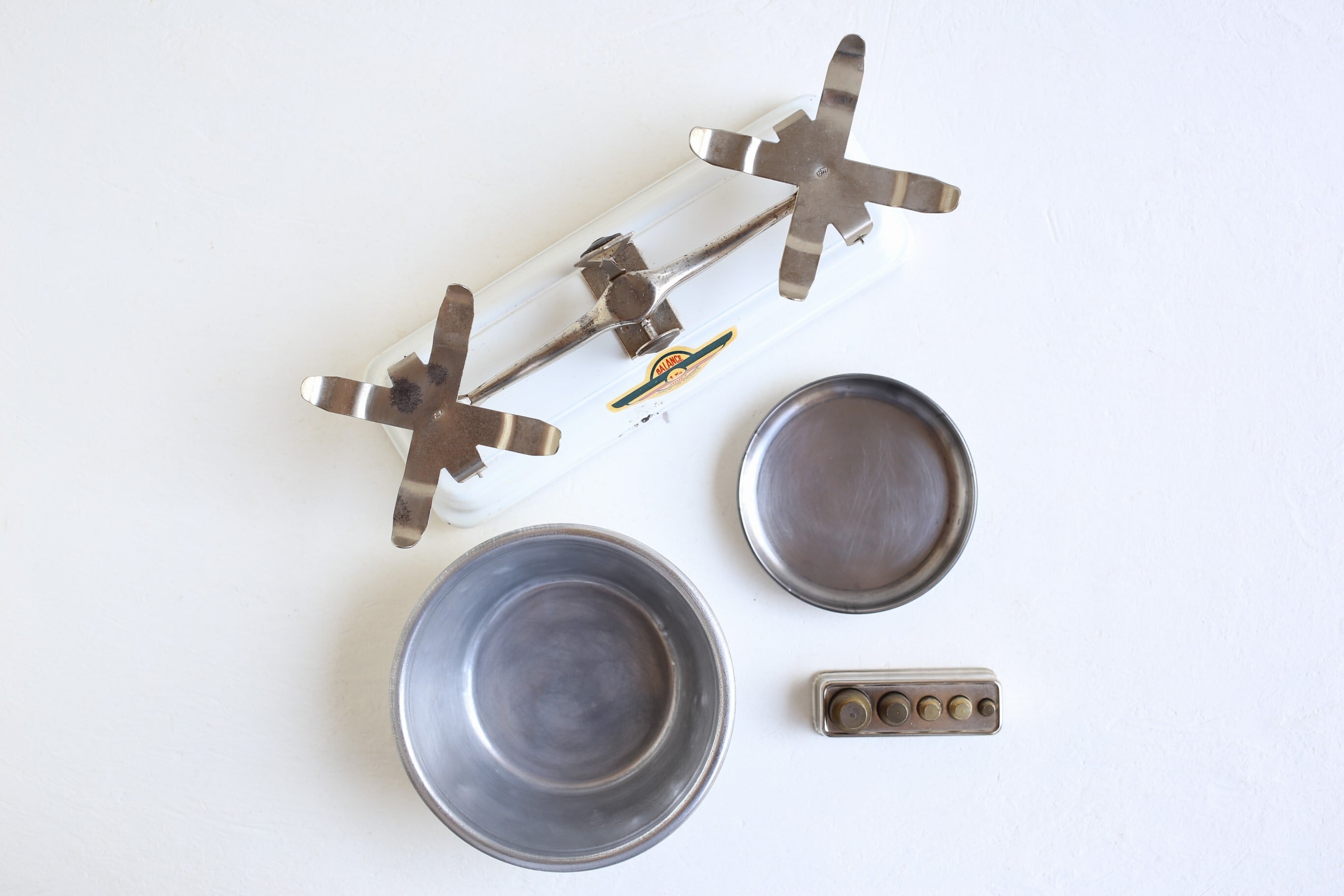 微細なスレやキズ、わずかにサビ、深いお皿に小さなアタリなどありますが、全体的にはオリジナルのペイントの状態も良く、ロゴのシールや分銅セットが残った良い状態です。