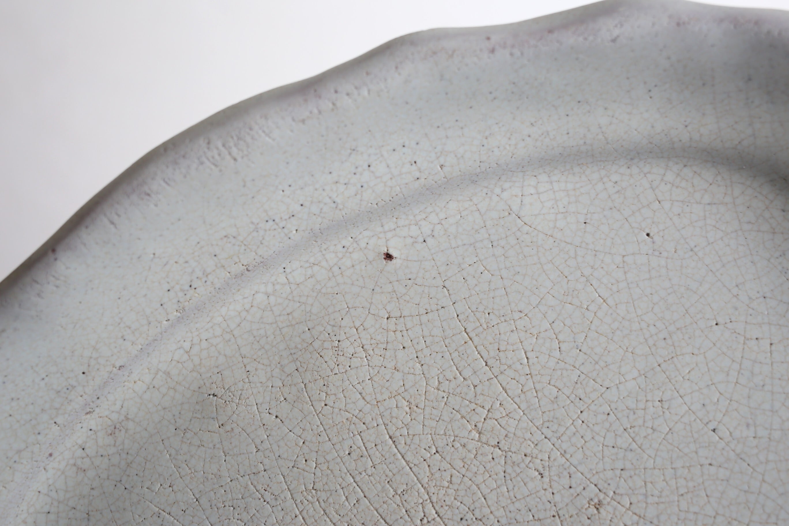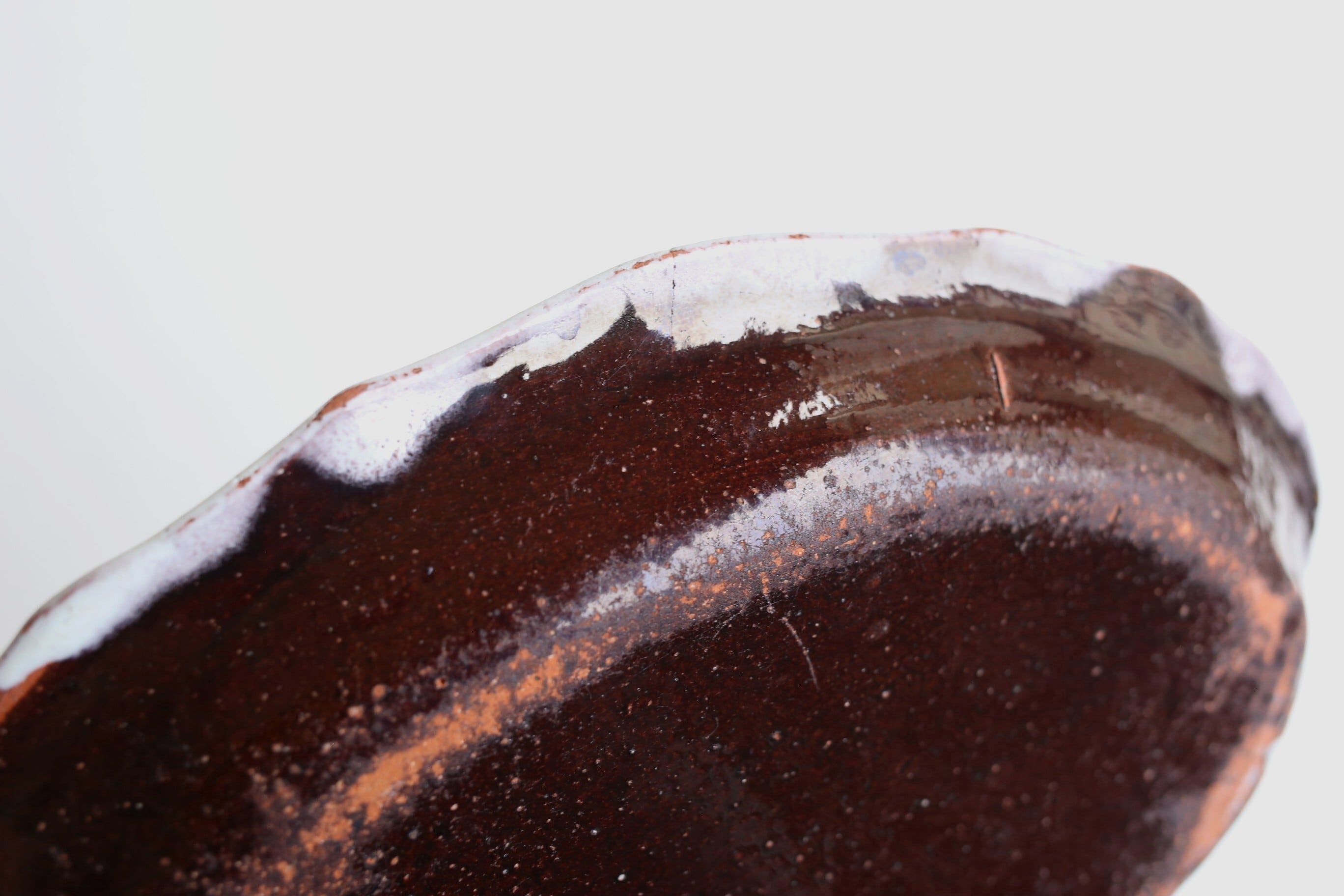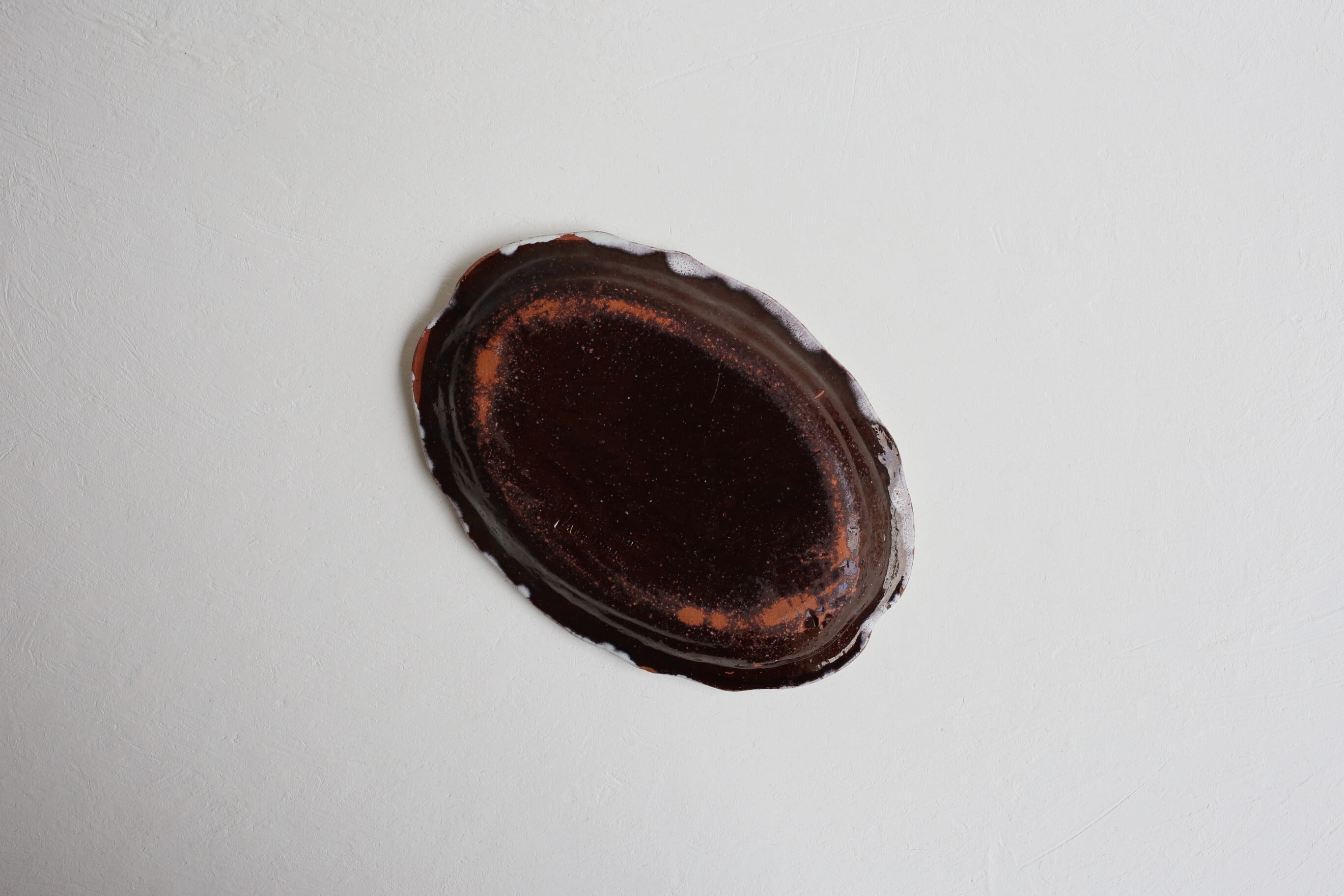 キュノワールはテラコッタ(赤レンガのような土)の上に表面に少し青みのある白い釉薬と裏面に黒色(こげ茶色)の釉薬をたっぷりとかけられて焼かれたものです。