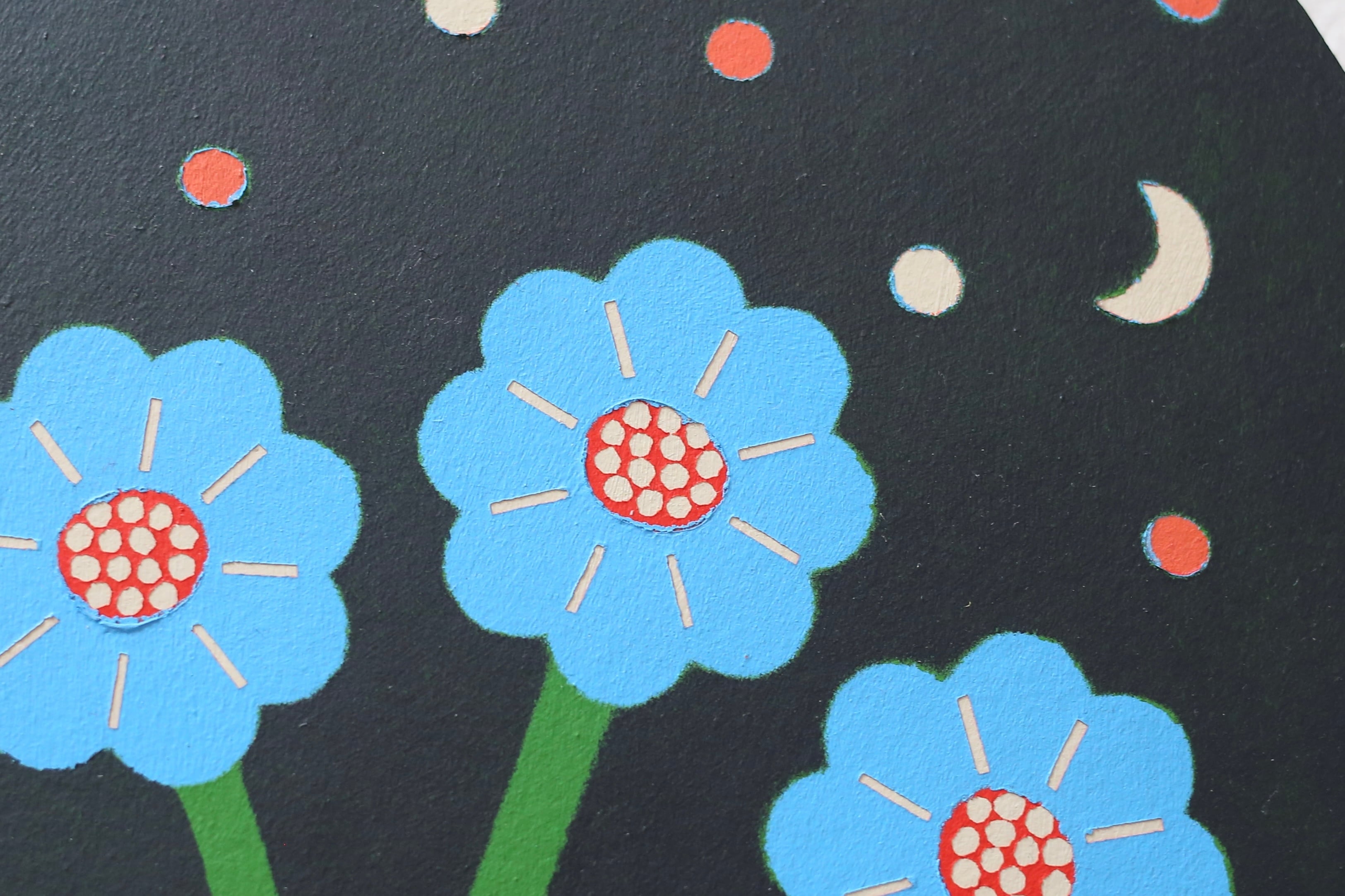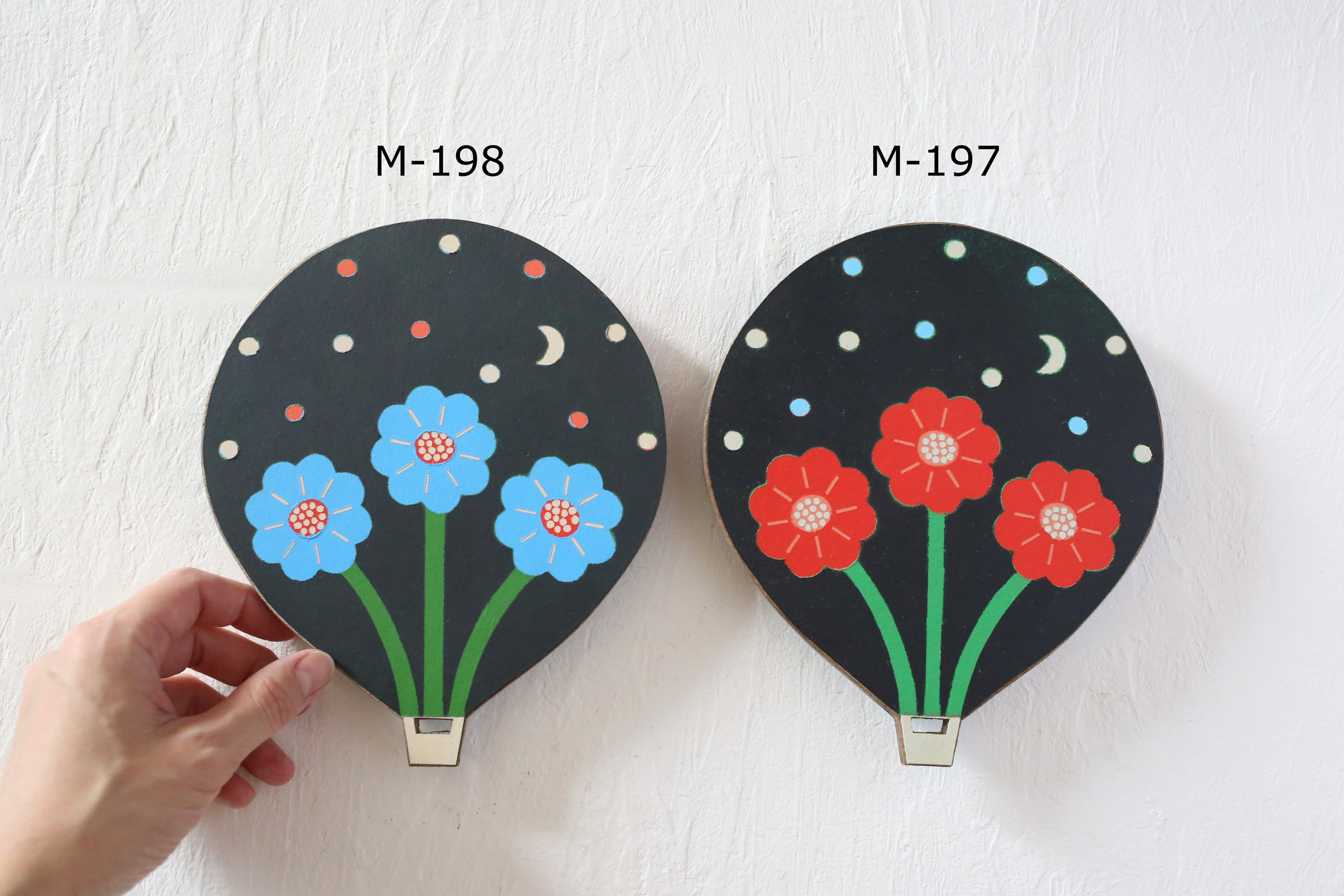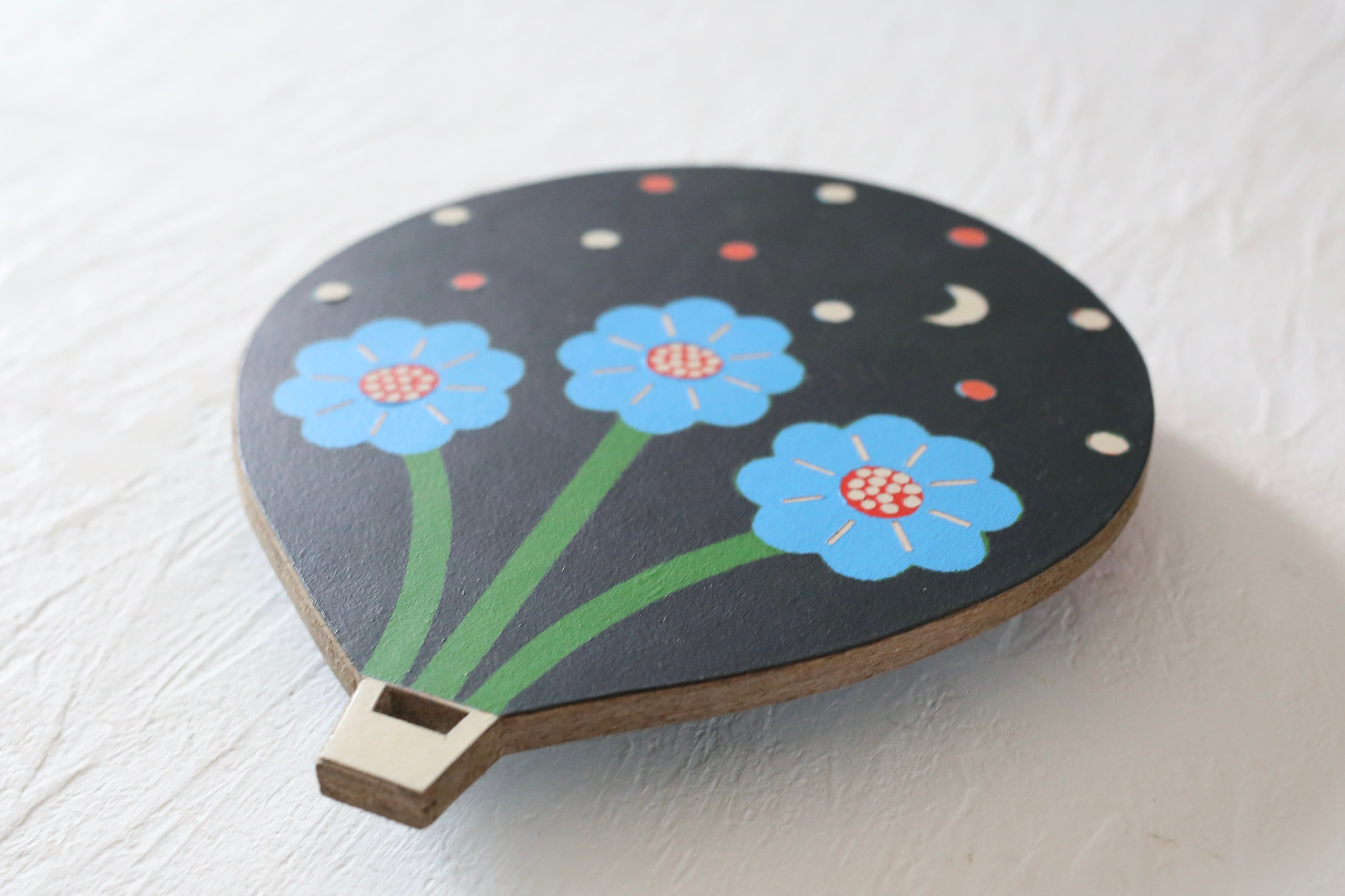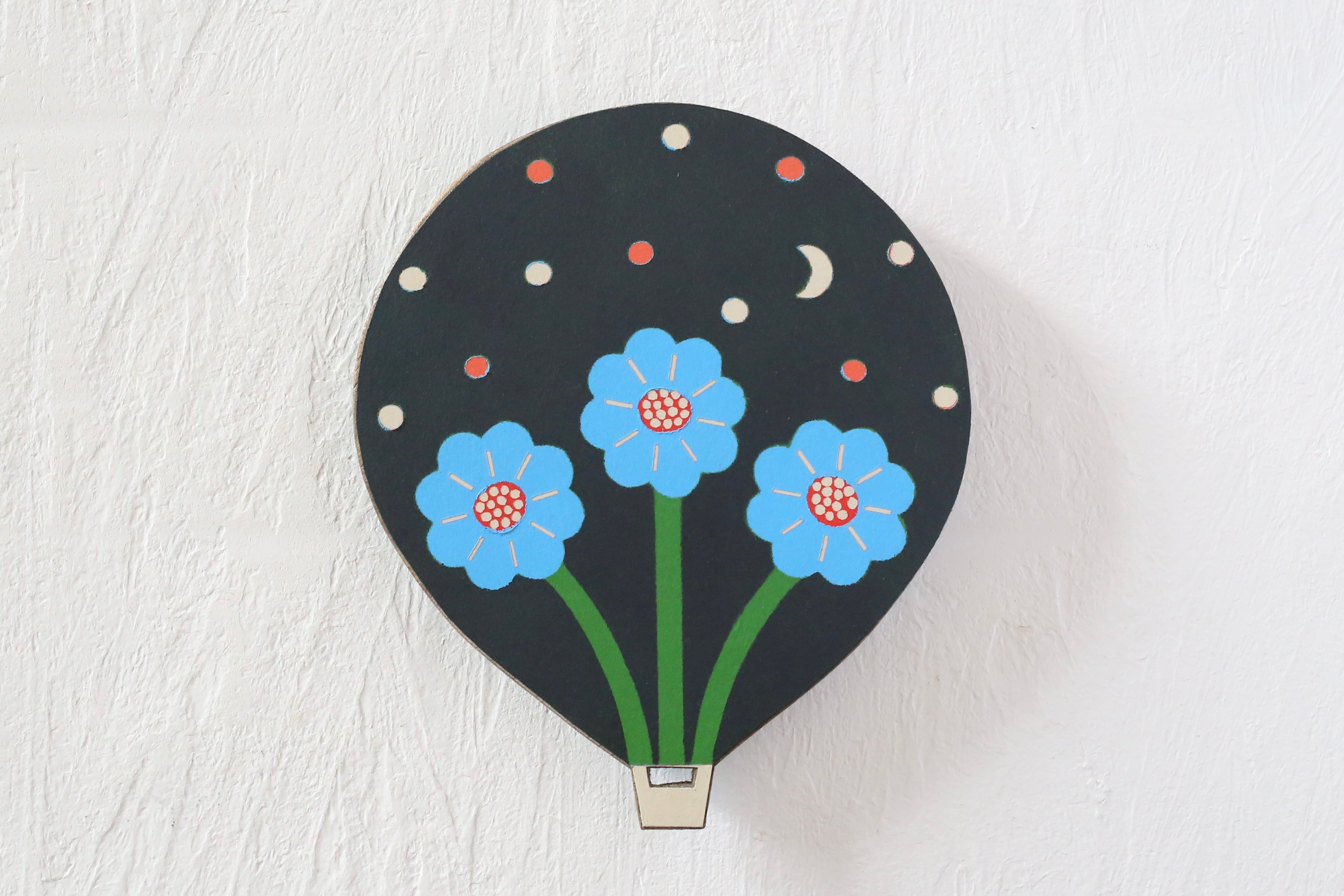 気球型に加工した木製板を土台に制作した手描きのアクリル画です。
