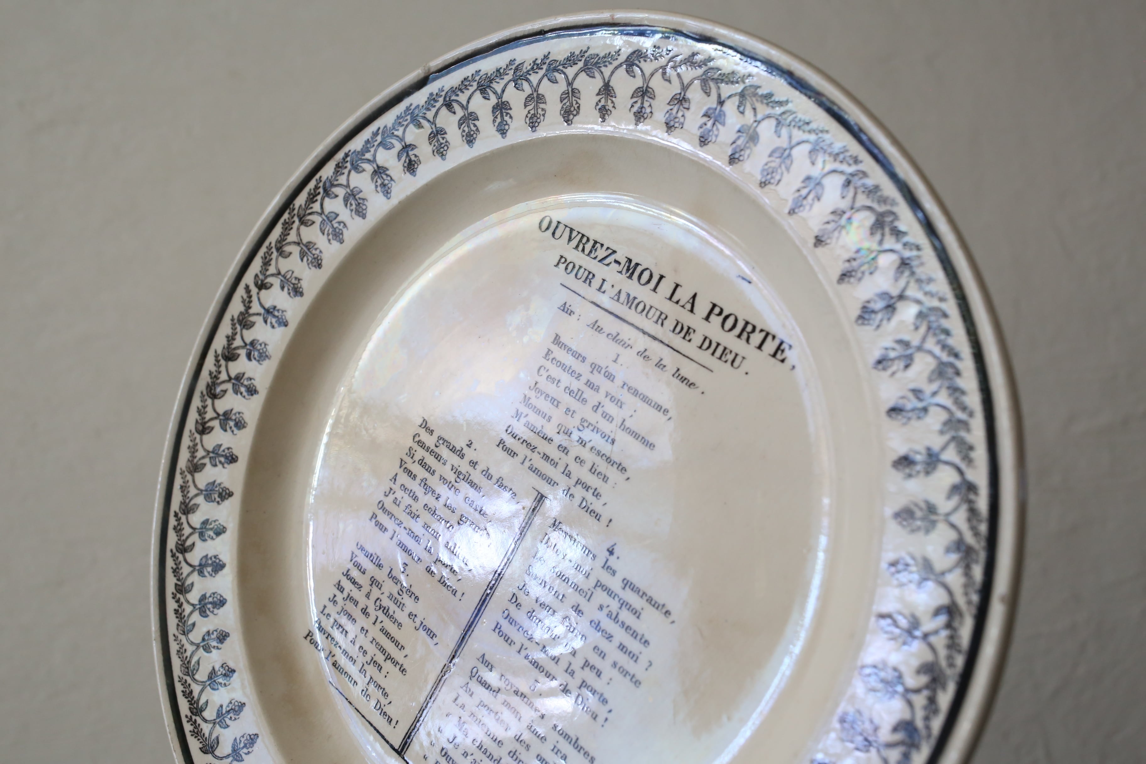 アイボリーのファイアンスフィーヌに光にかざすと玉虫色に輝く当時の特徴的な美しい釉薬がかけられています。