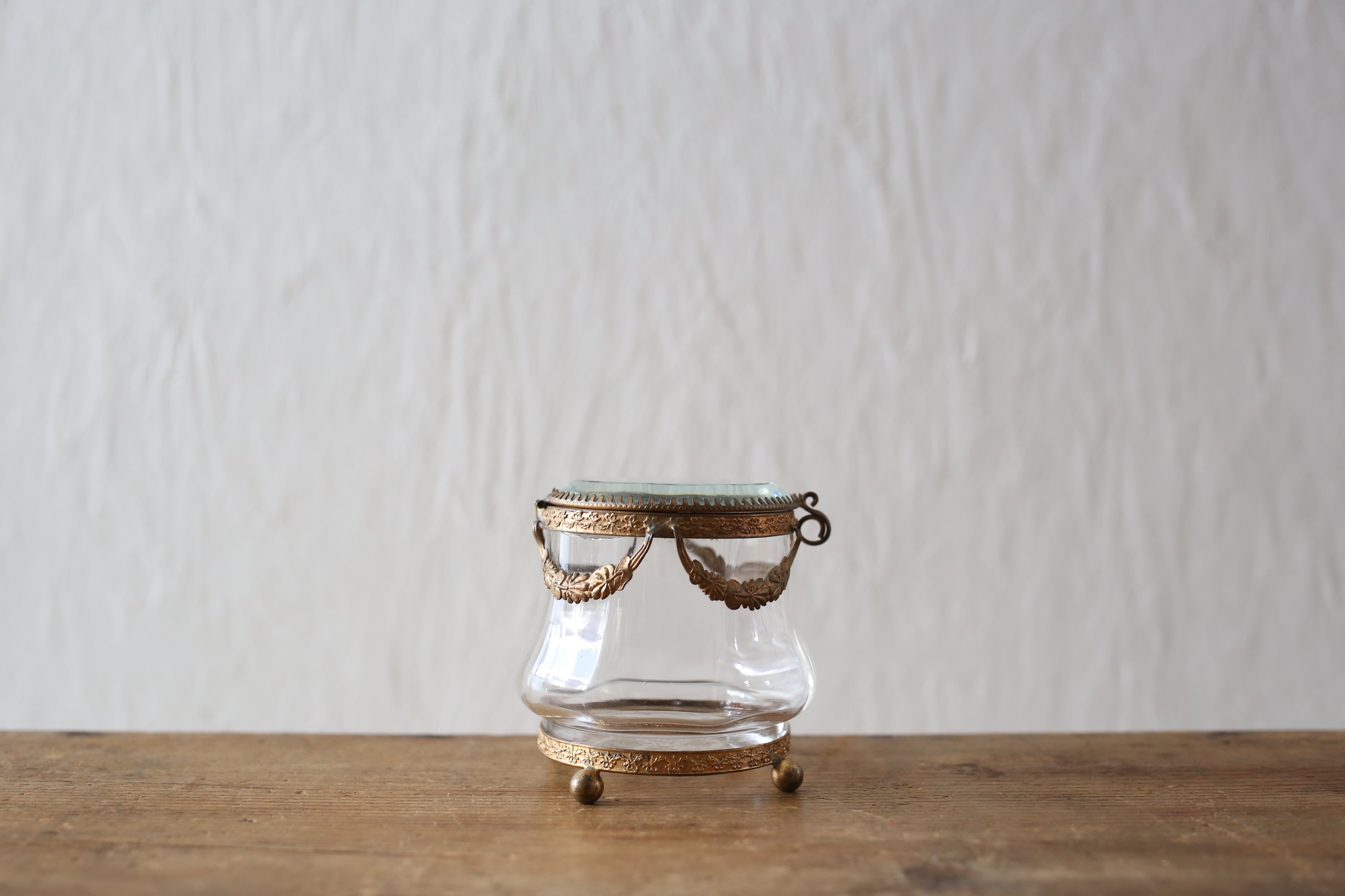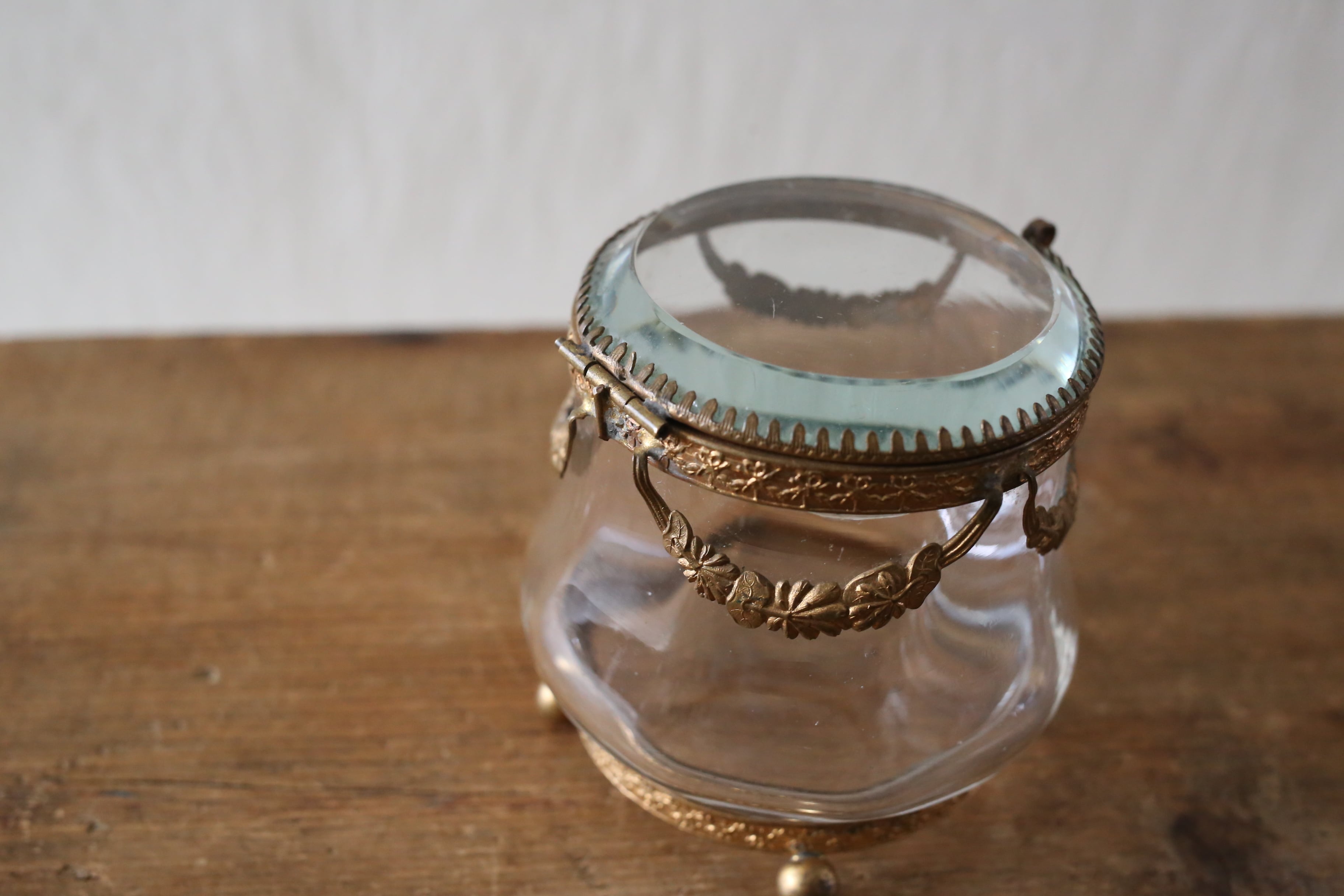 オルモン装飾とベベルガラスのジュエリーボックスの中でも珍しい丸いフォルムが優美な逸品です。