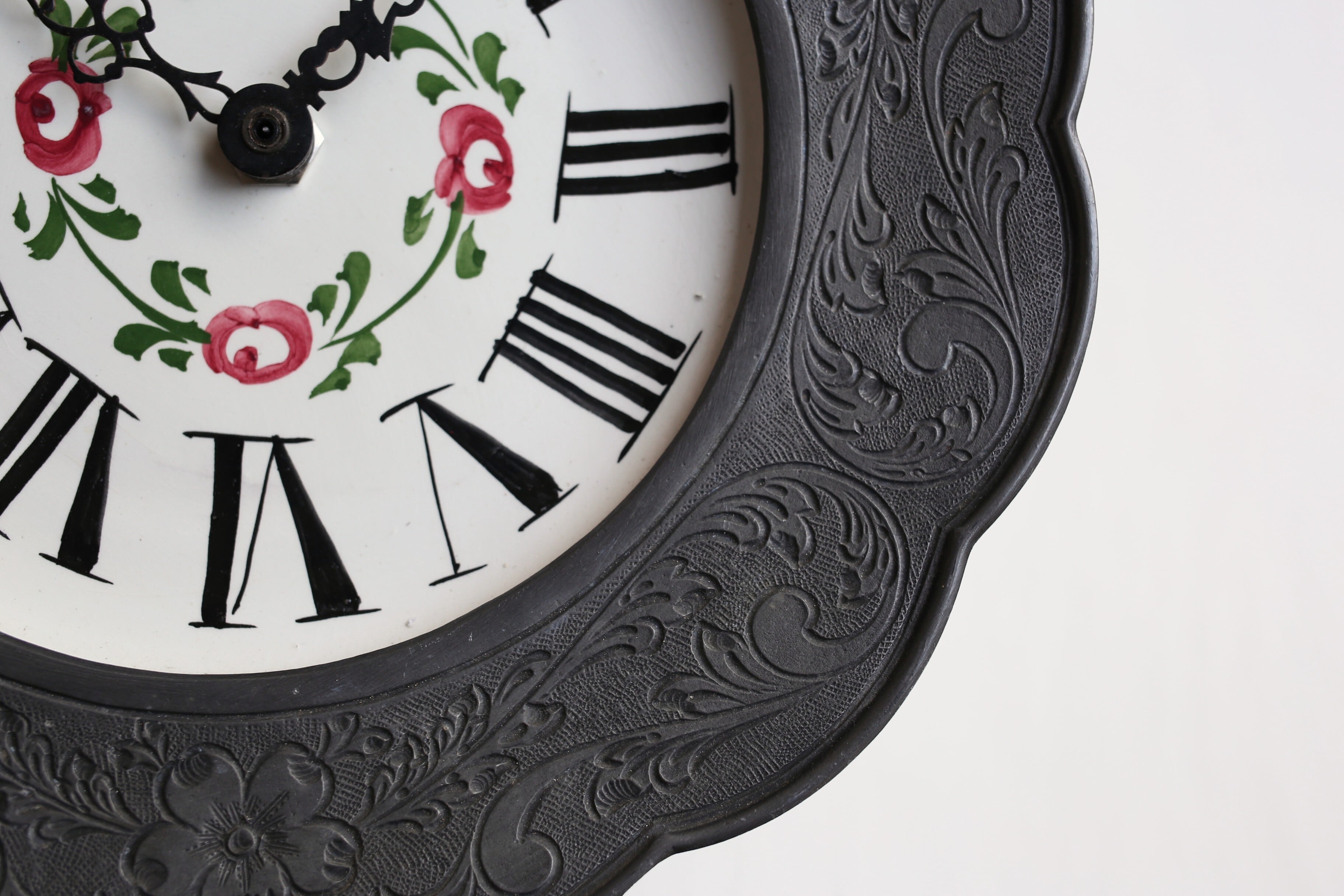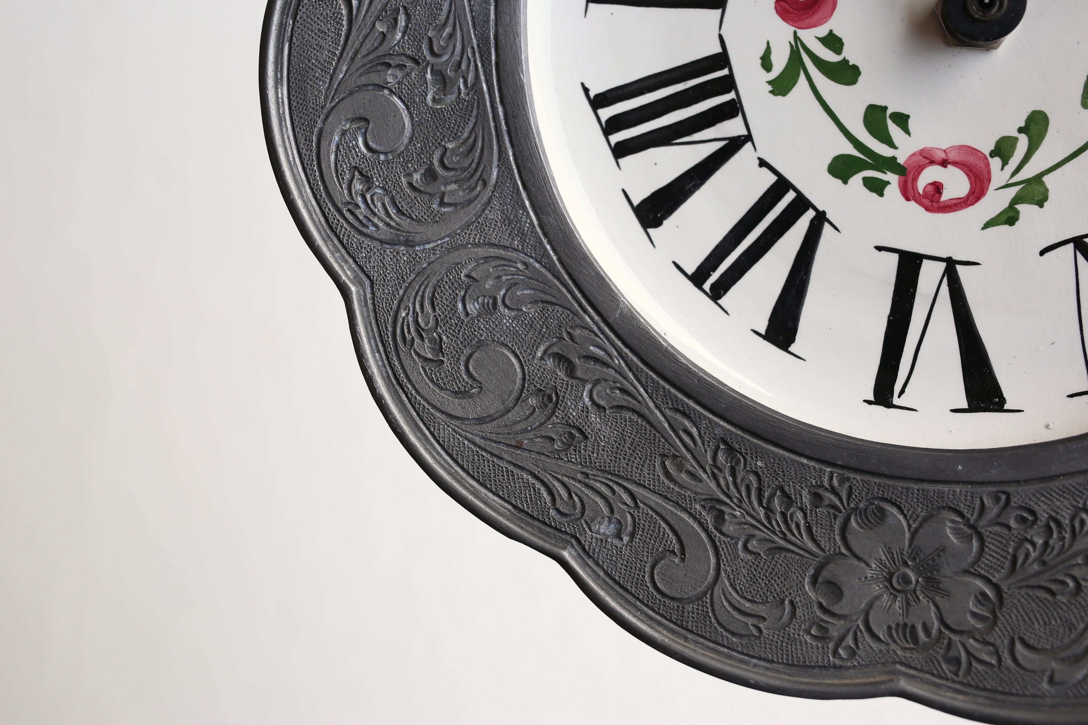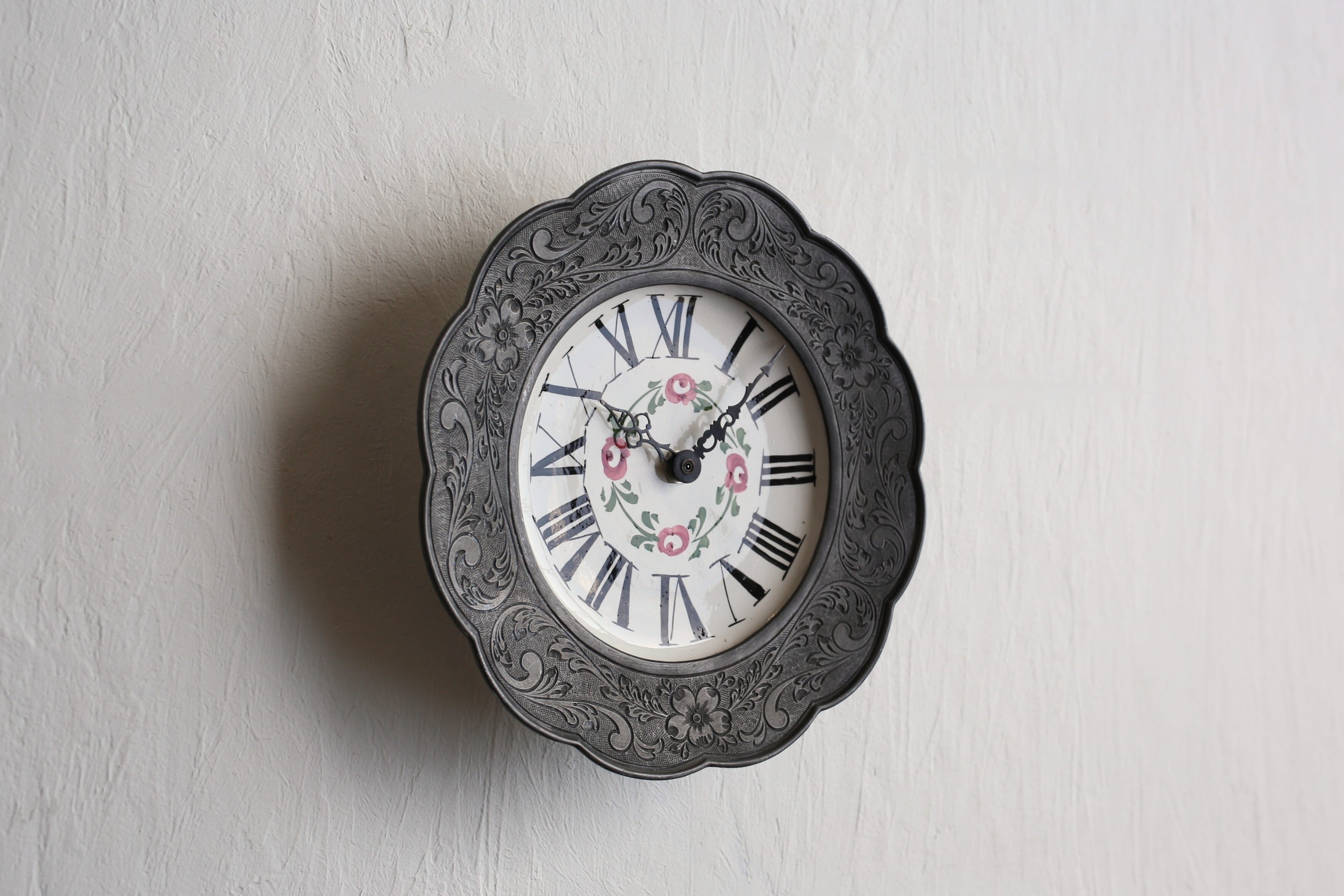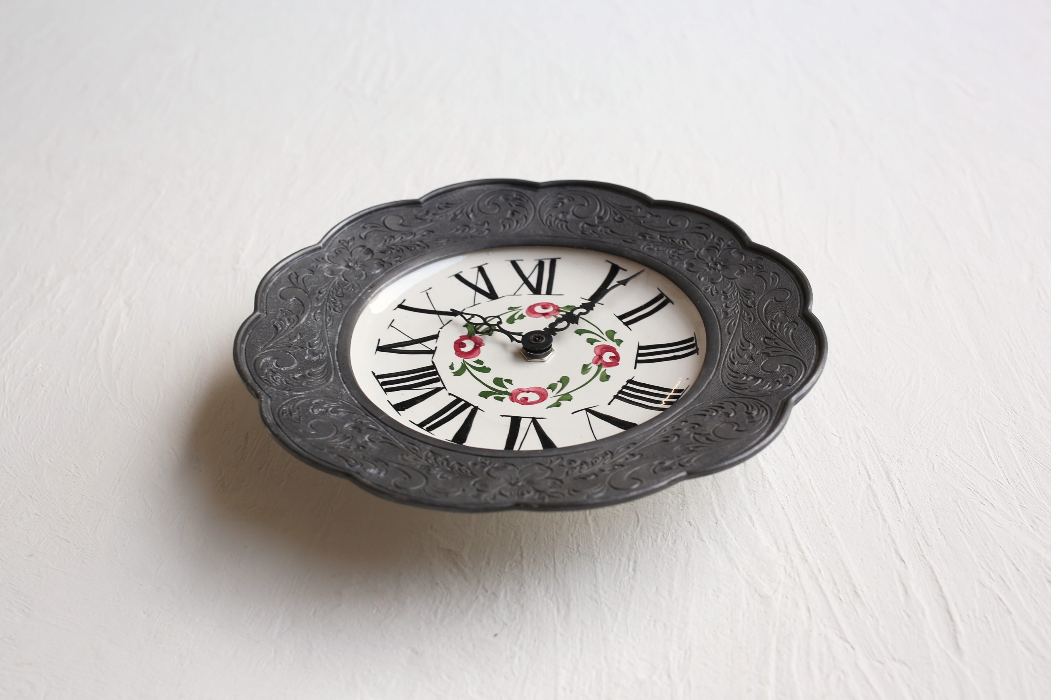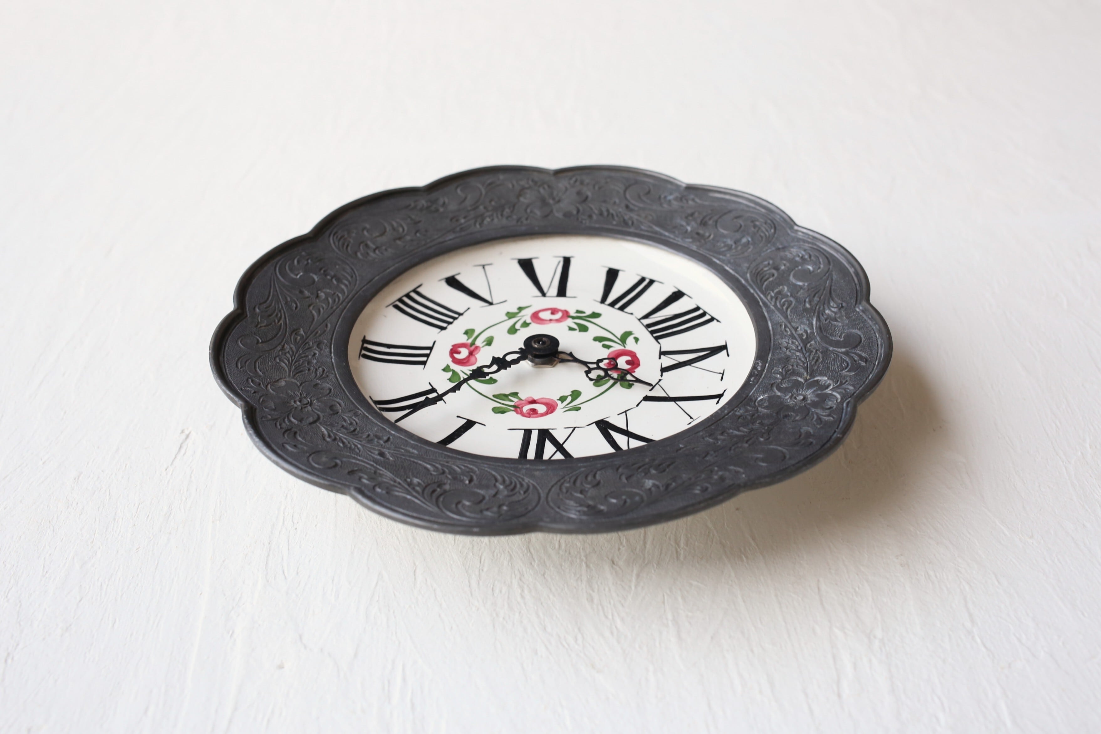 フランス アンティーク ヴィンテージ 掛時計 エタン×陶器 花柄(単3電池式クォーツ交換済)N-06564