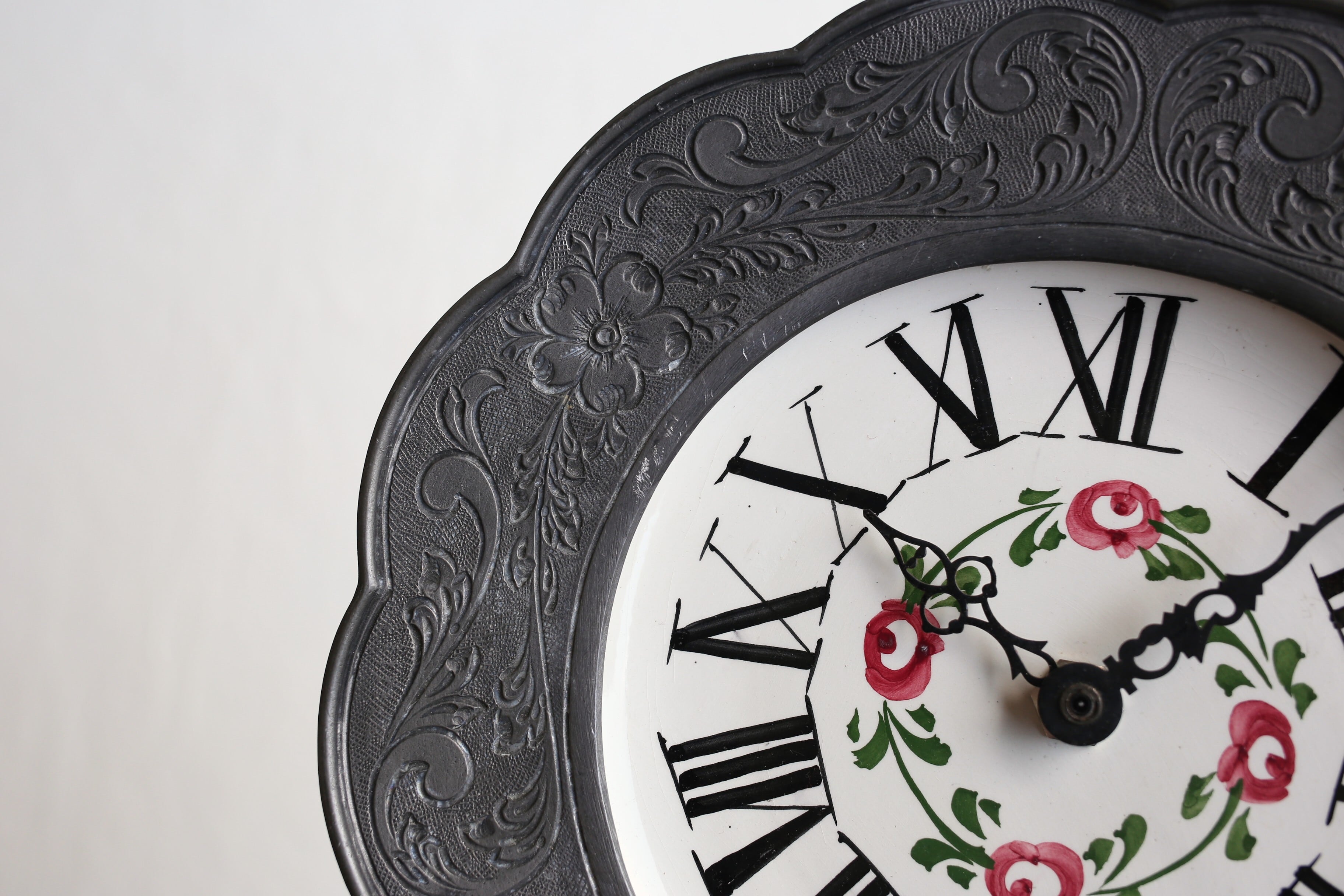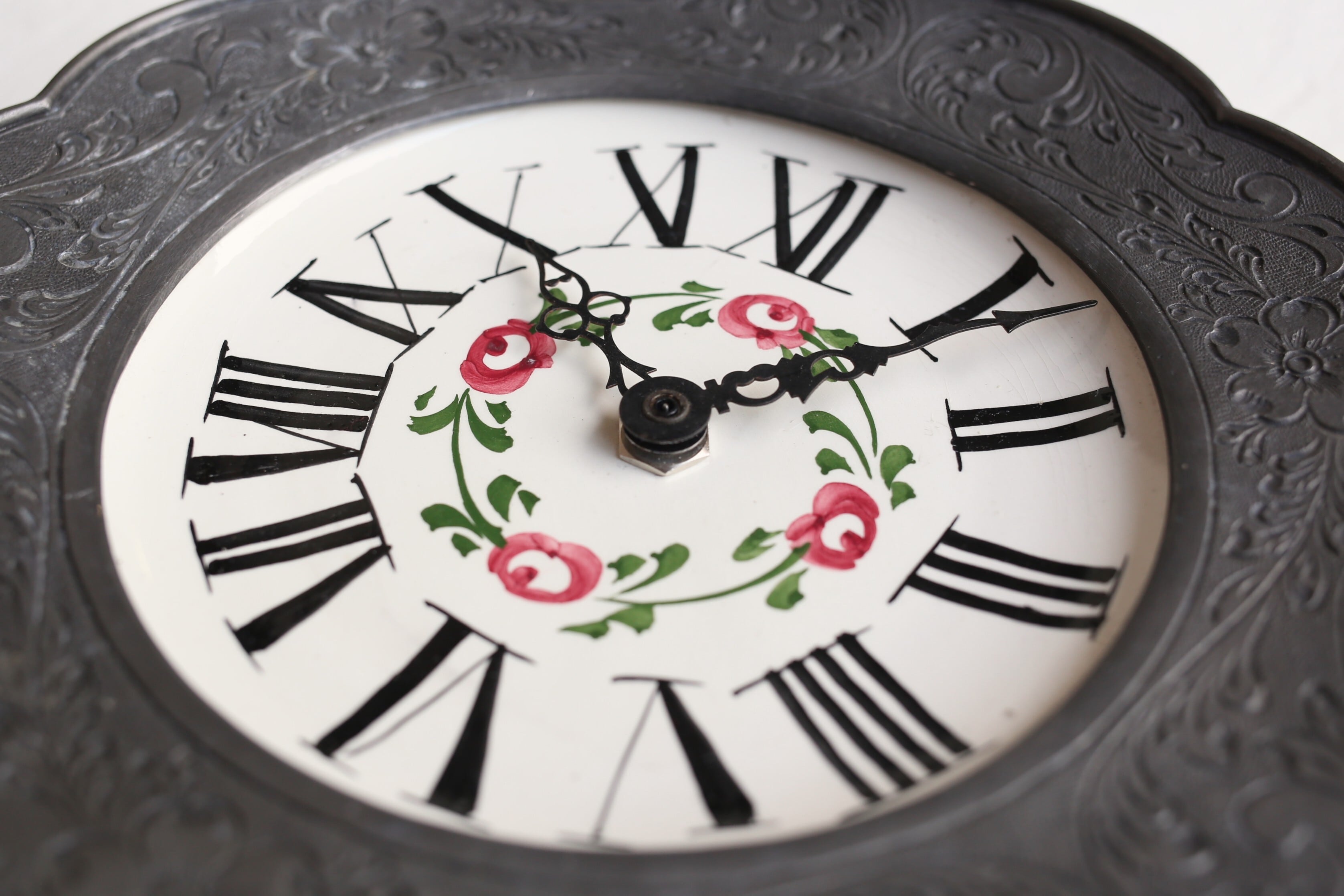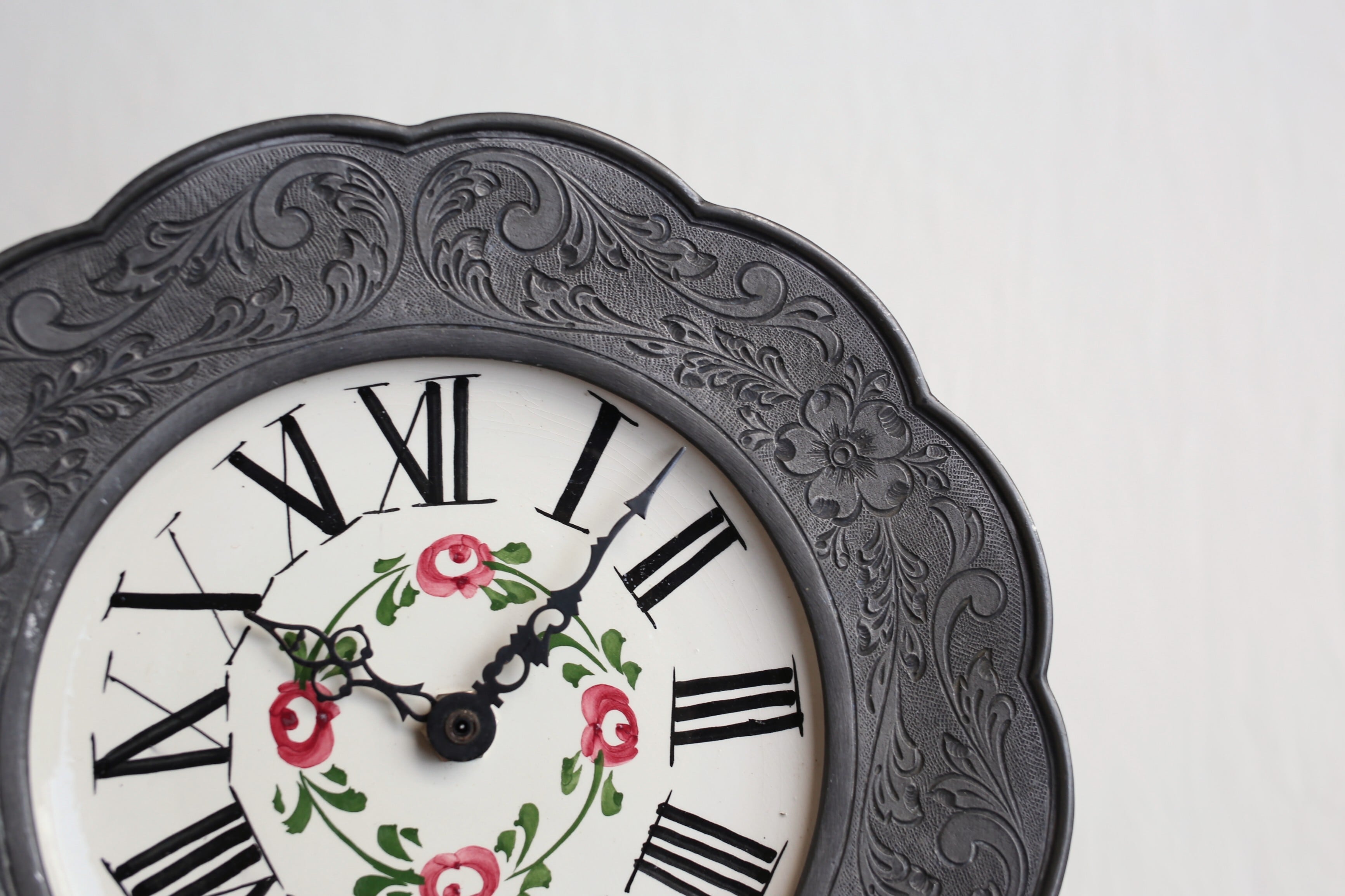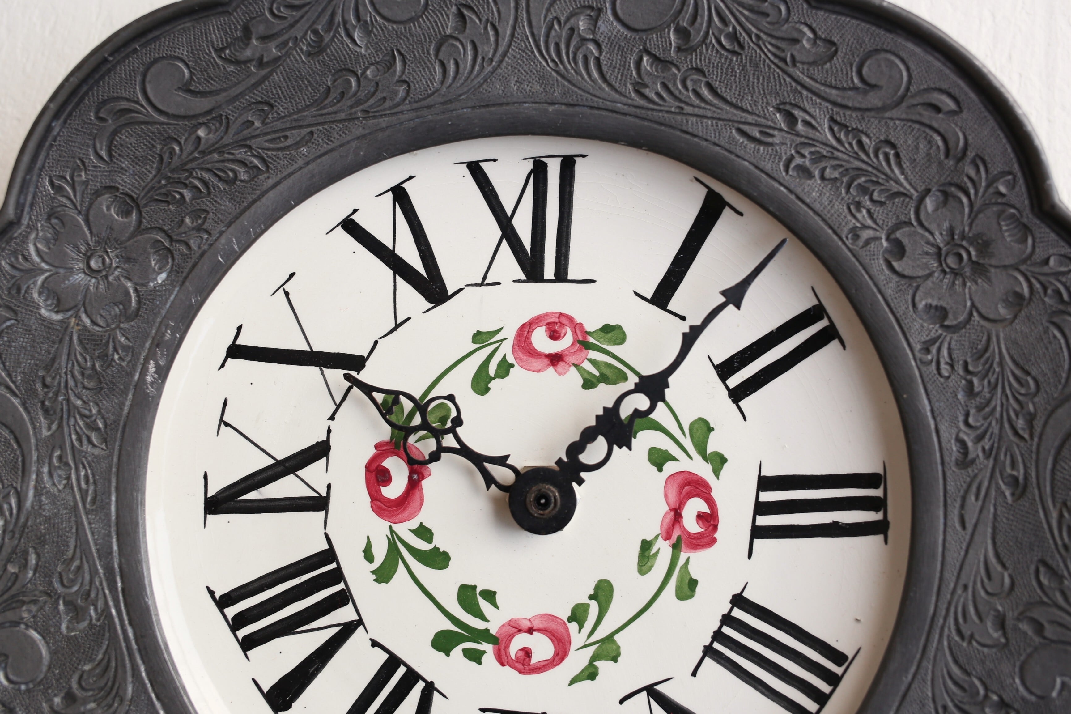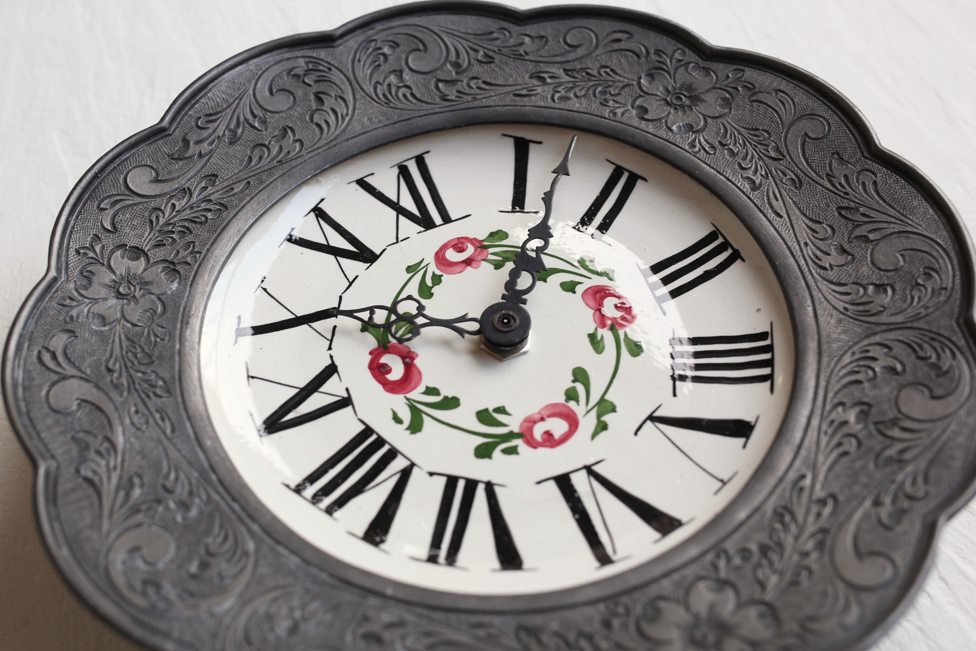 フランス アンティーク ヴィンテージ 掛時計 エタン×陶器 花柄(単3電池式クォーツ交換済)N-06564