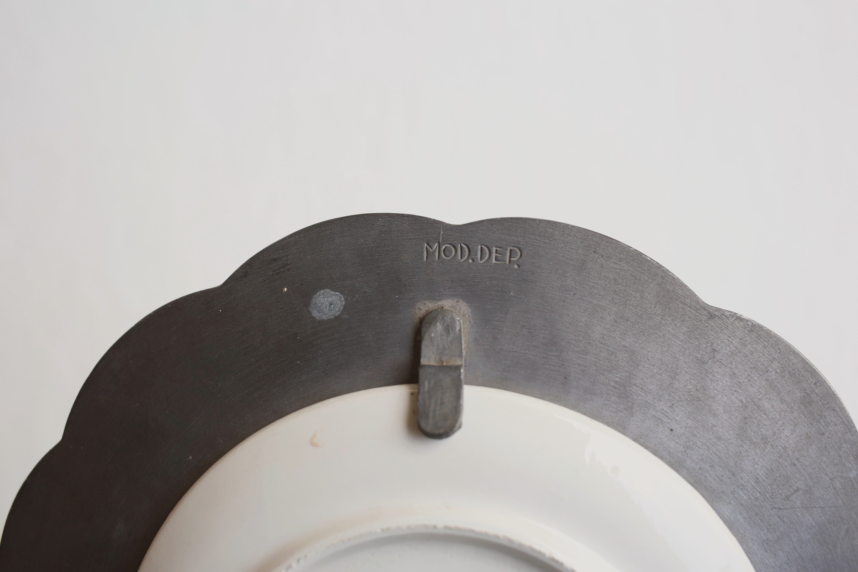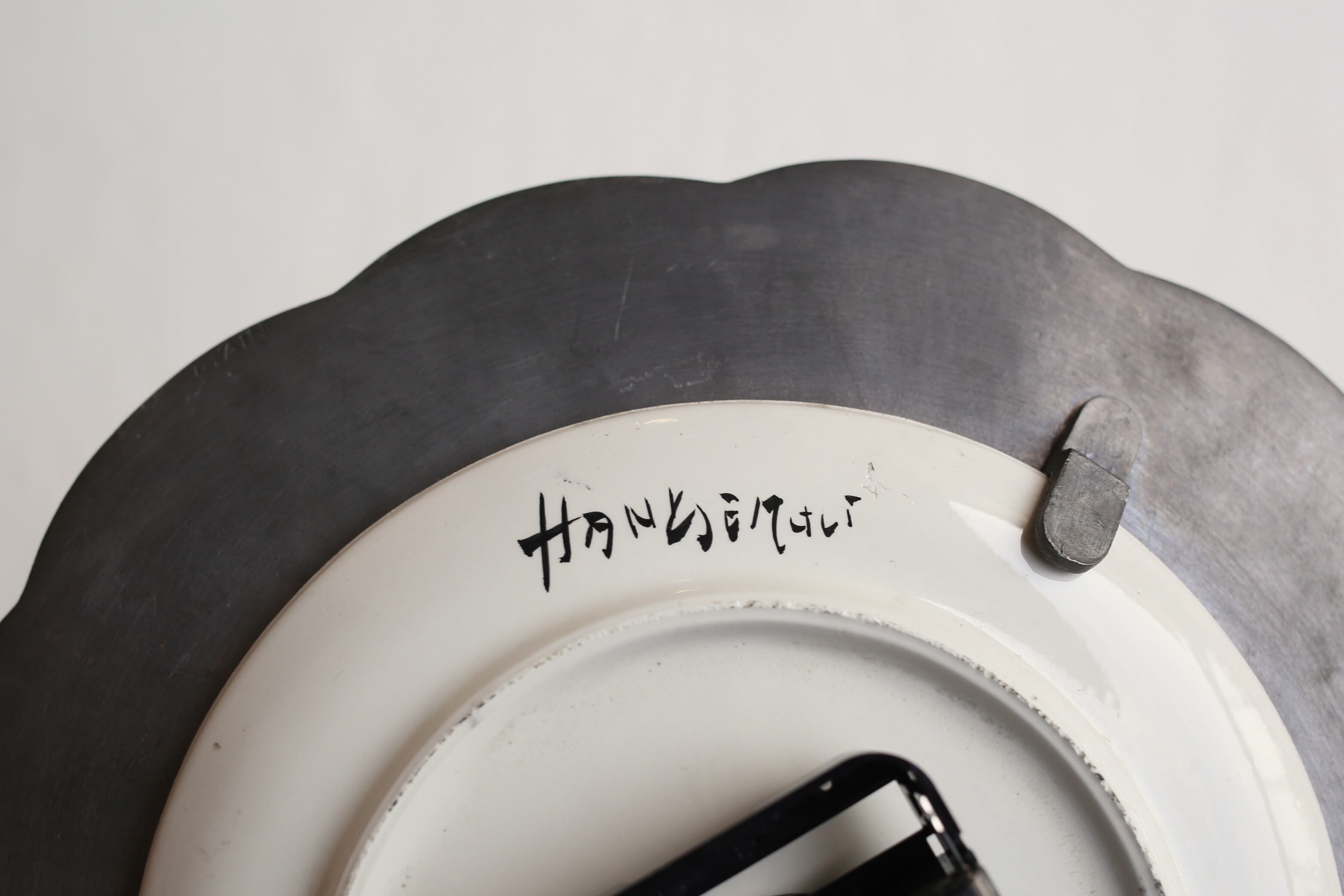 エタン(ピューター)に陶器がはめ込まれた飾り皿はたまに見かけますが、掛時計になっているものは初めて見ました。