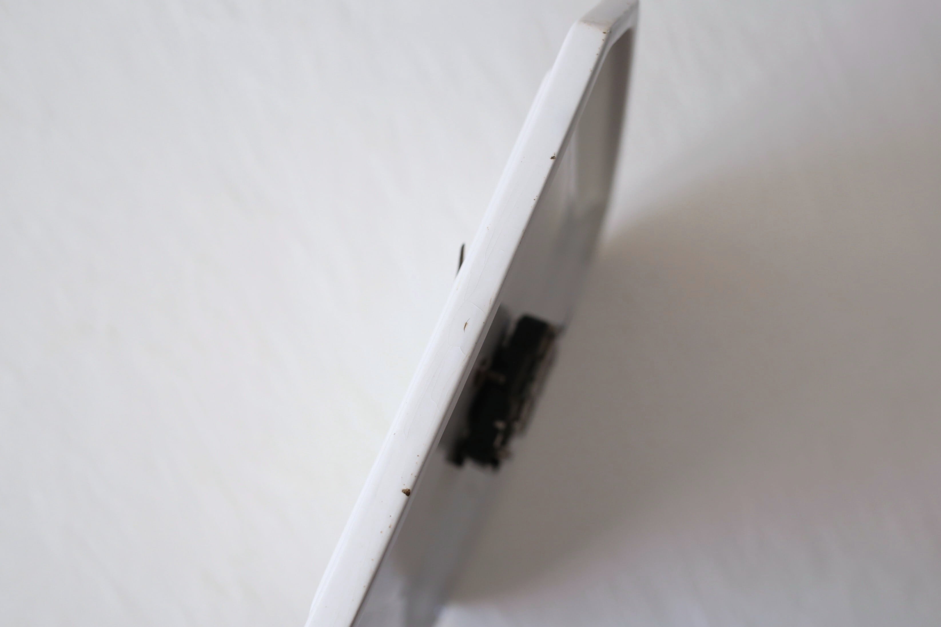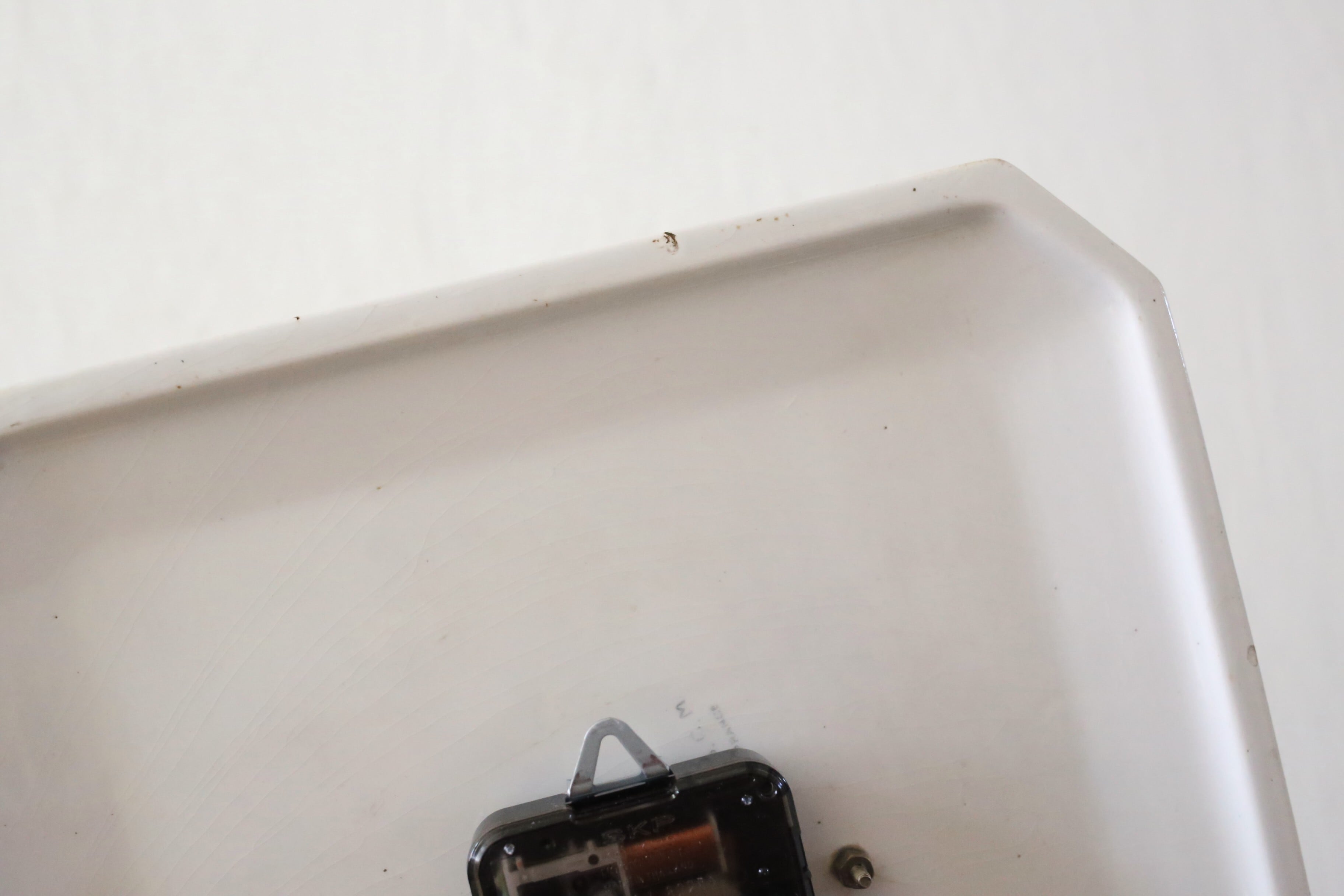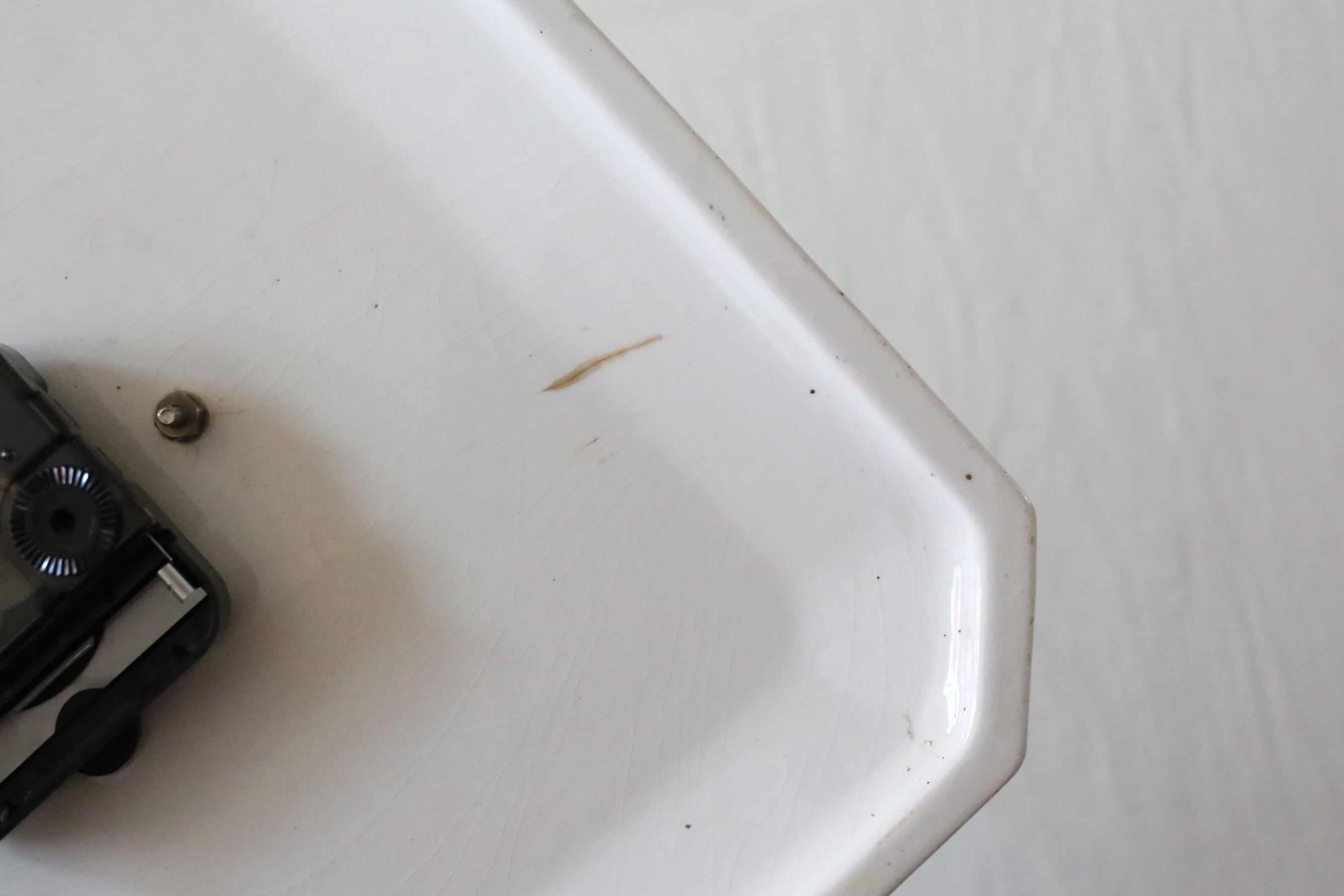 スチールの針に多少のサビやペイントの剥離、陶器に微細なキズやスレ、わずかにシミや裏側の縁に薄いチップはありますが、全体的には大きなダメージもなく良い状態です。