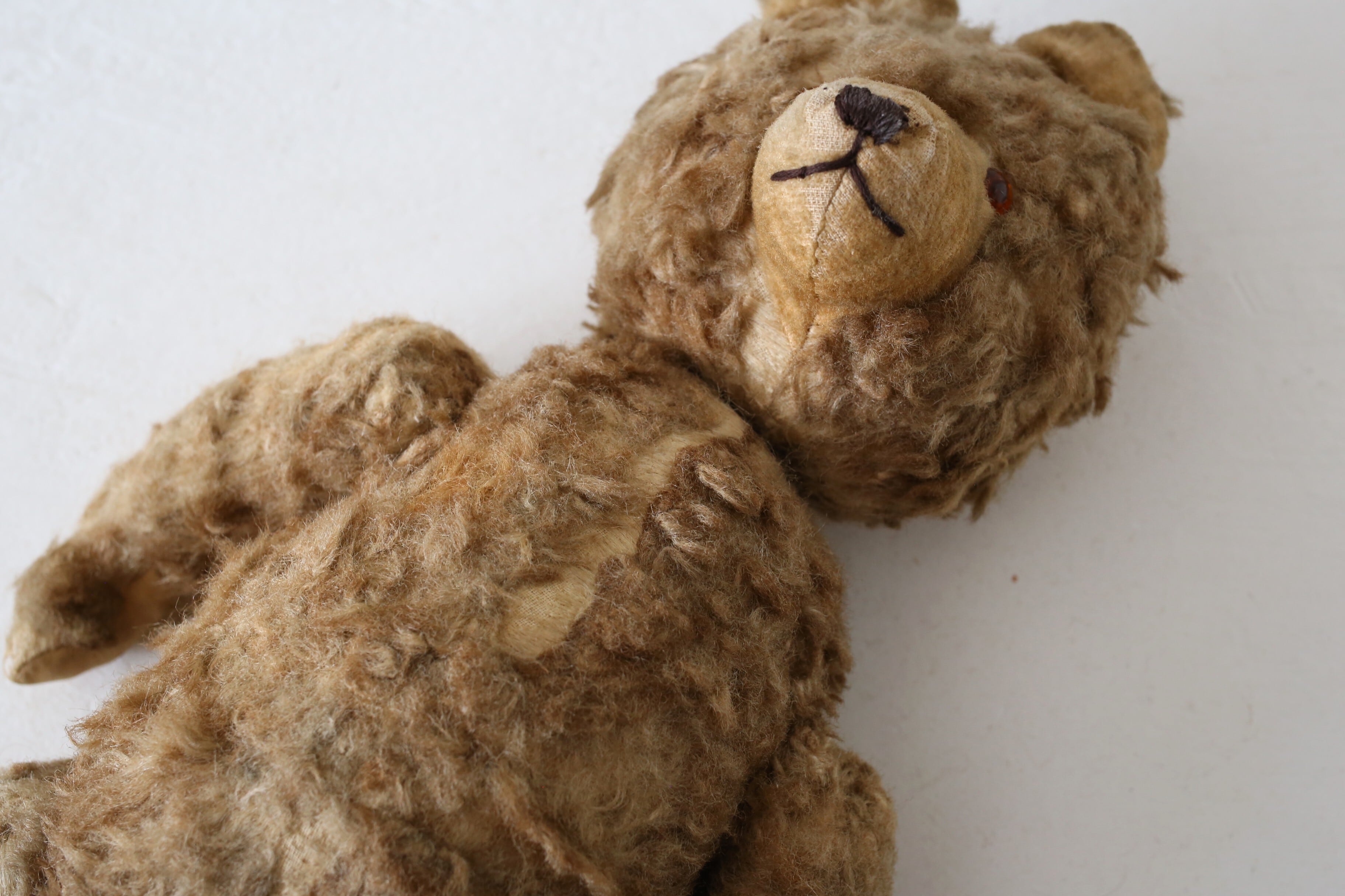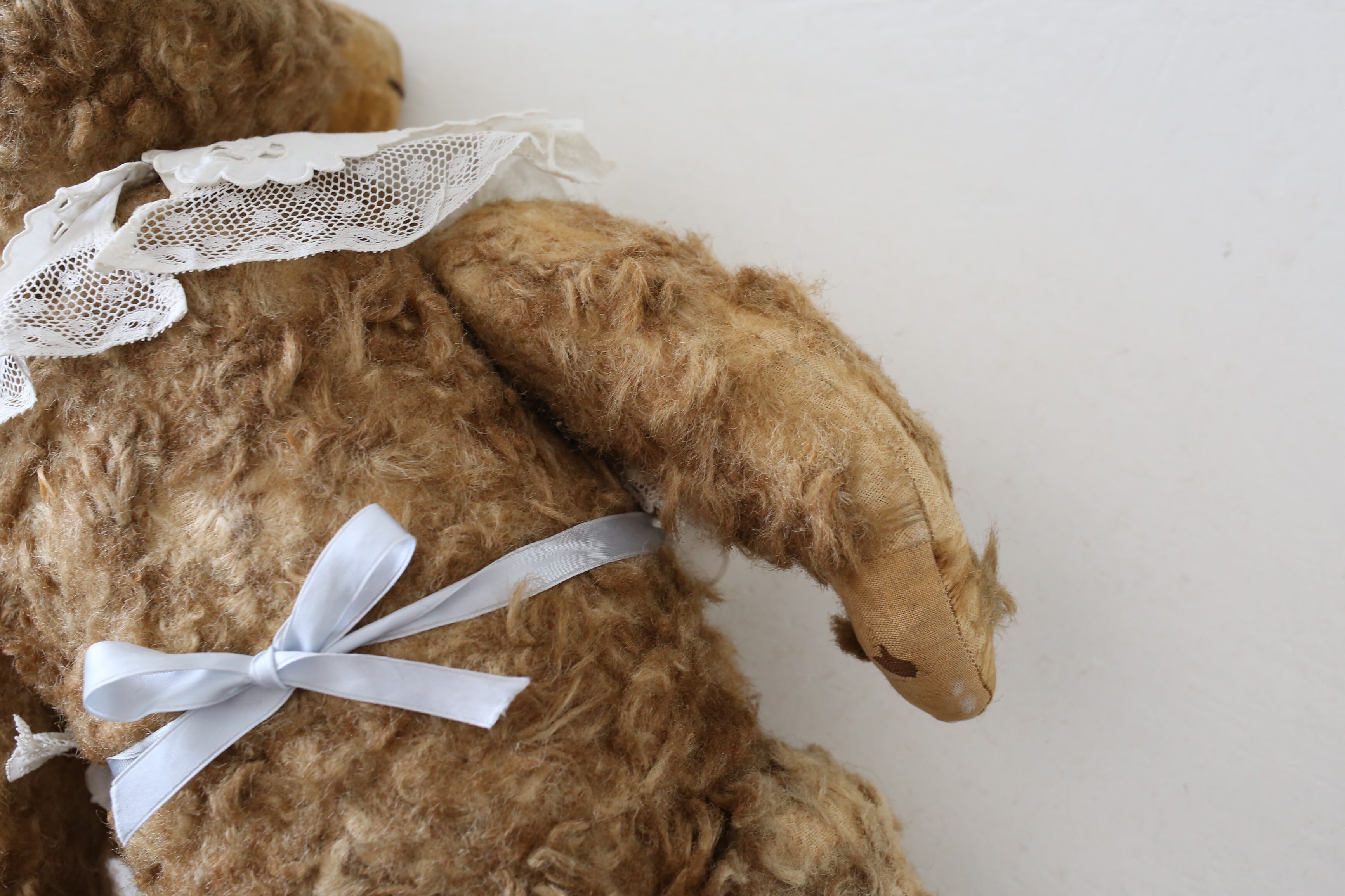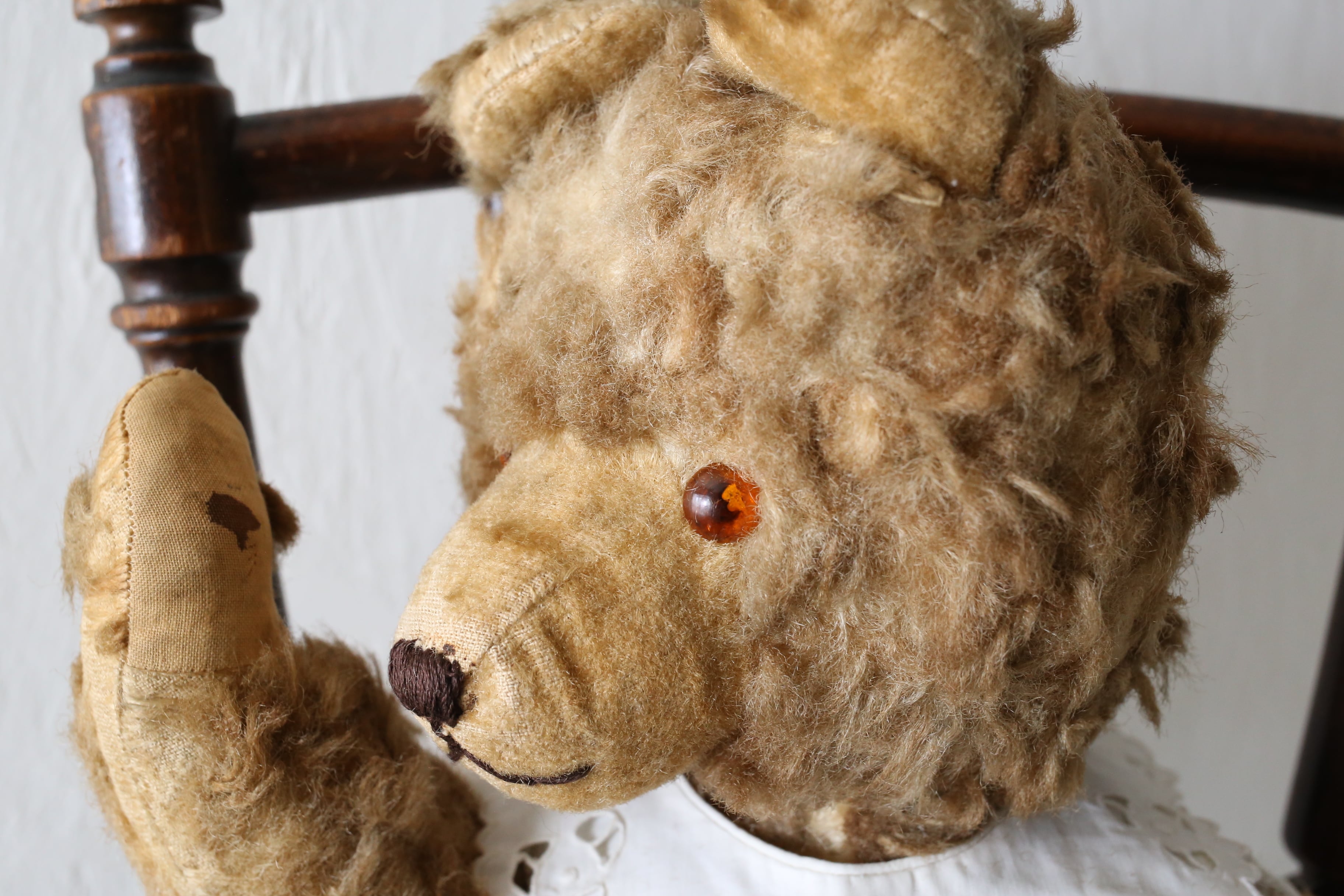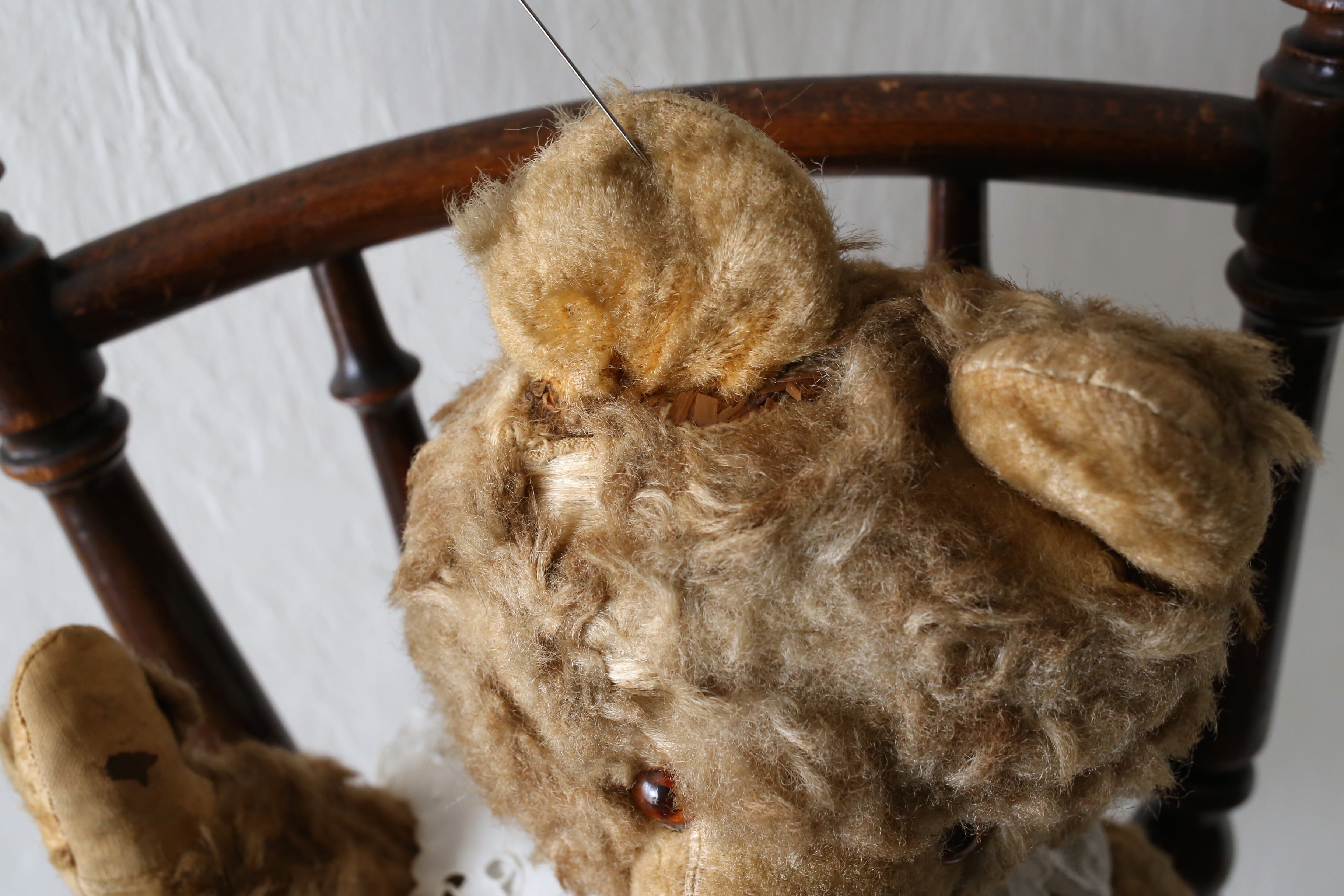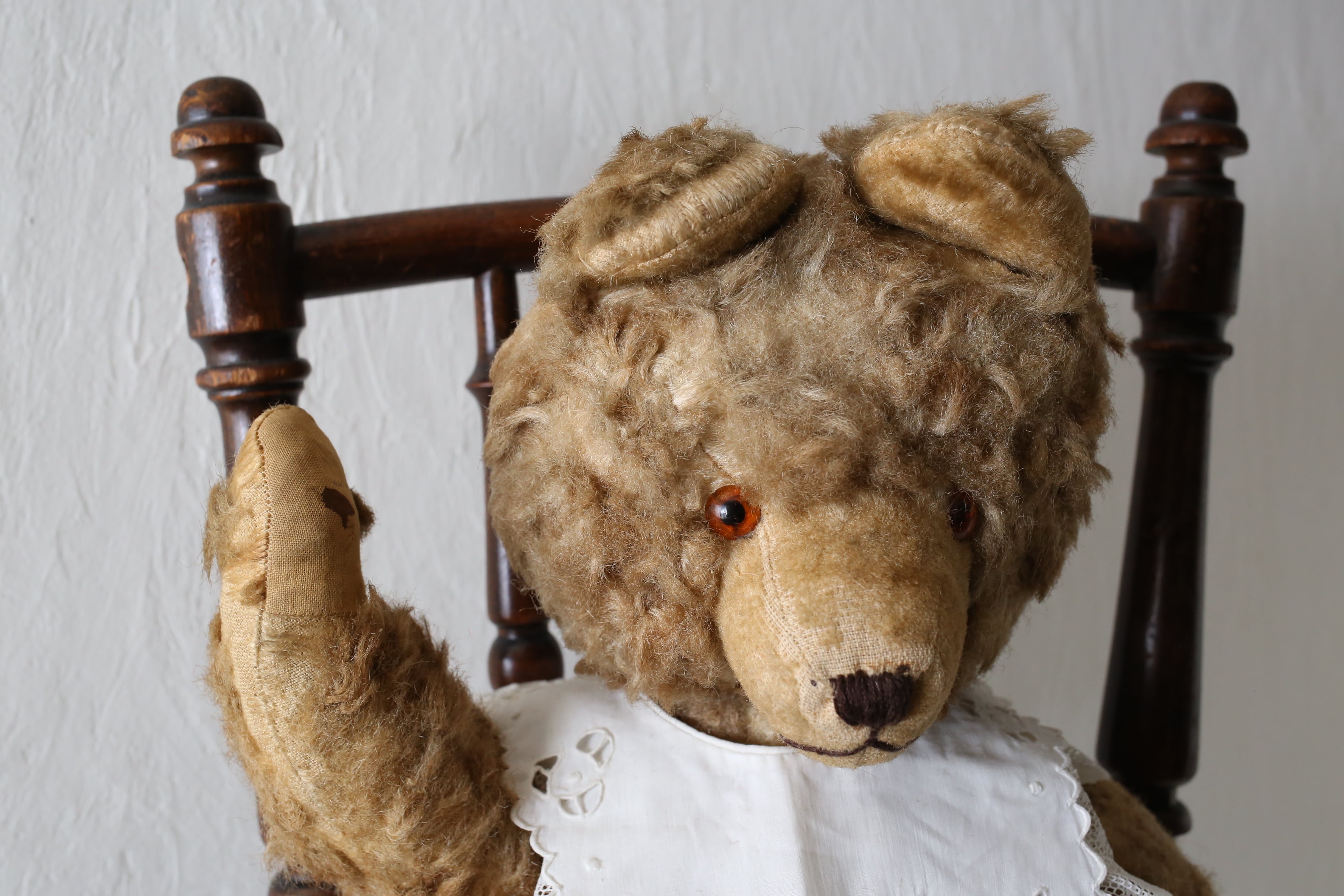 その他に右手のシミやところどころにモヘアロスがありますが、長く可愛がられてきたくたっとした佇まいなどたまらなく愛らしいベアです。