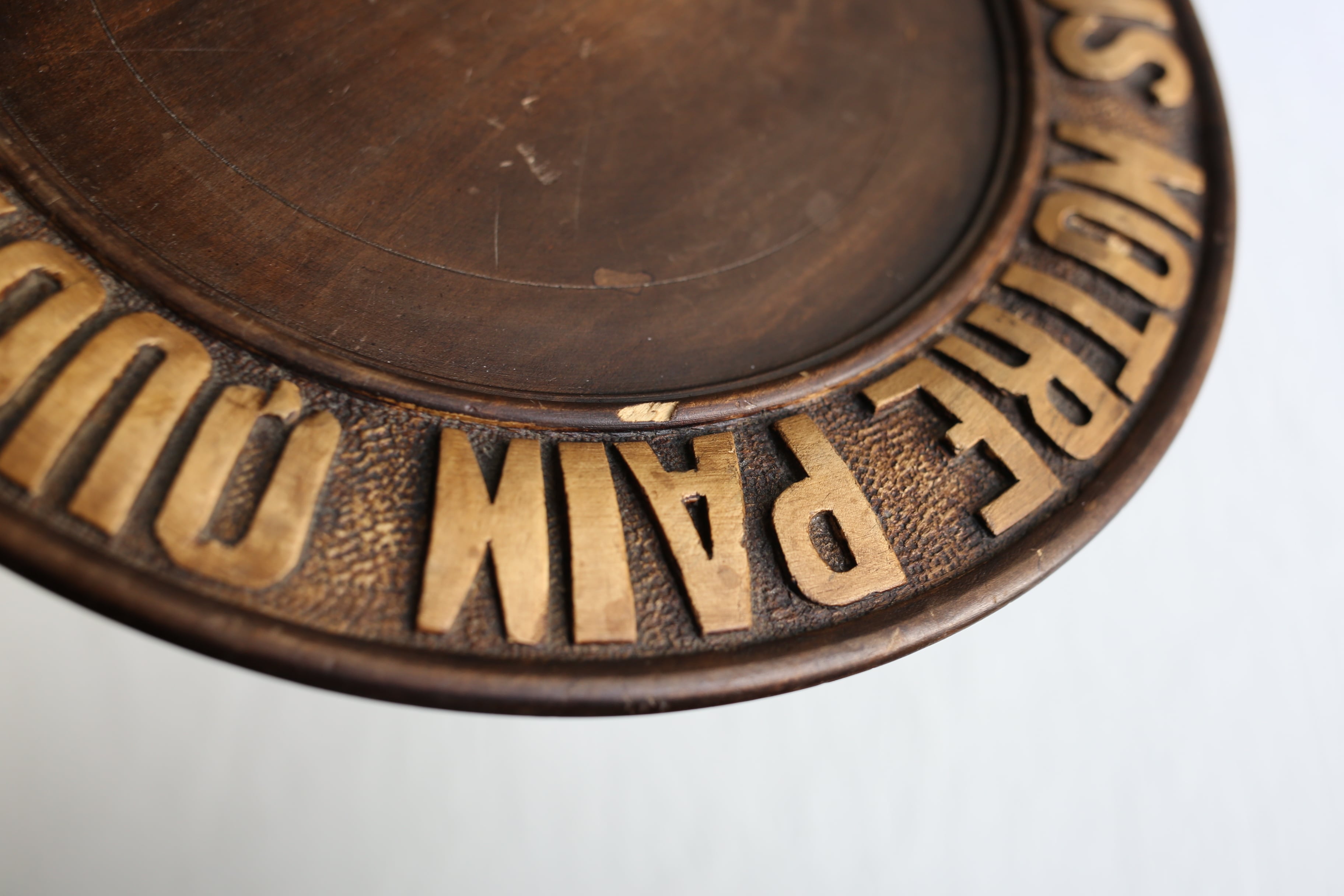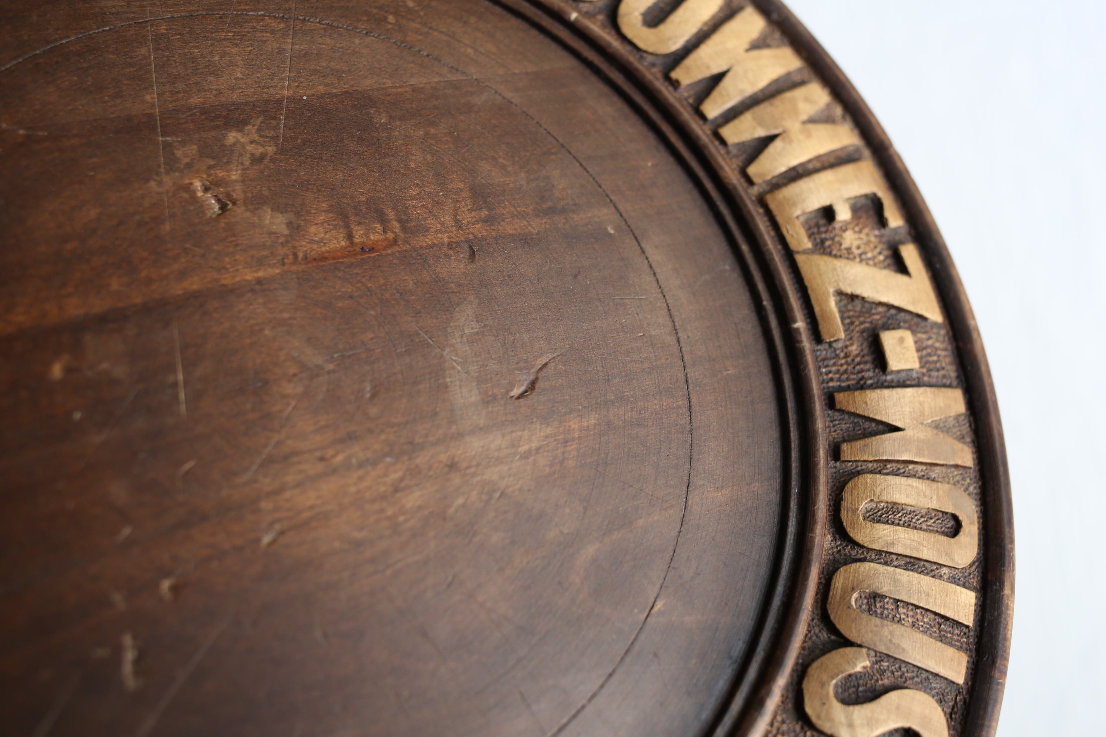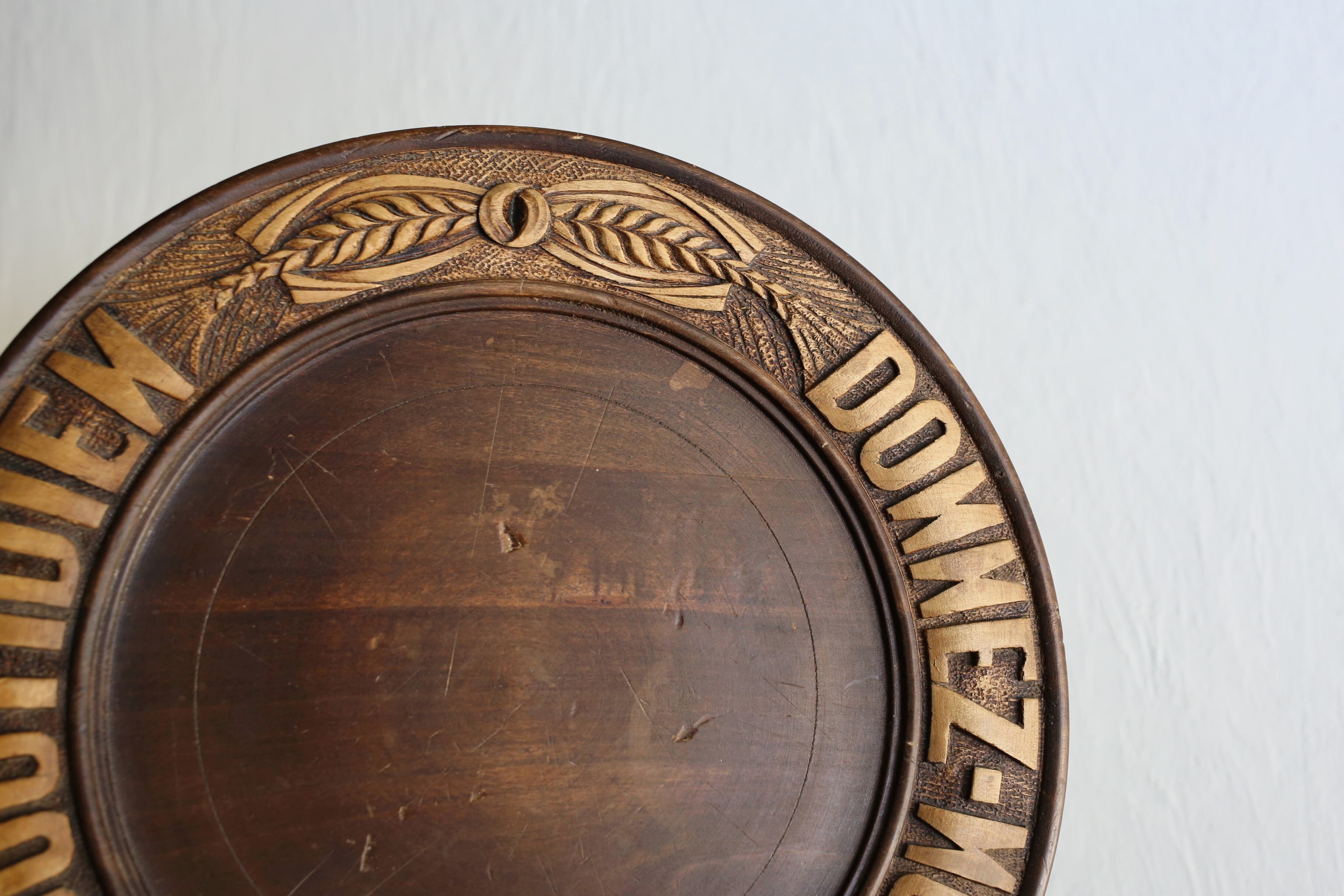 しっかりと削り出された文字や小麦をモチーフにしたリボンのような柄のデザインに深みを増した木製ならではの趣きがあるとても素敵な一枚です。