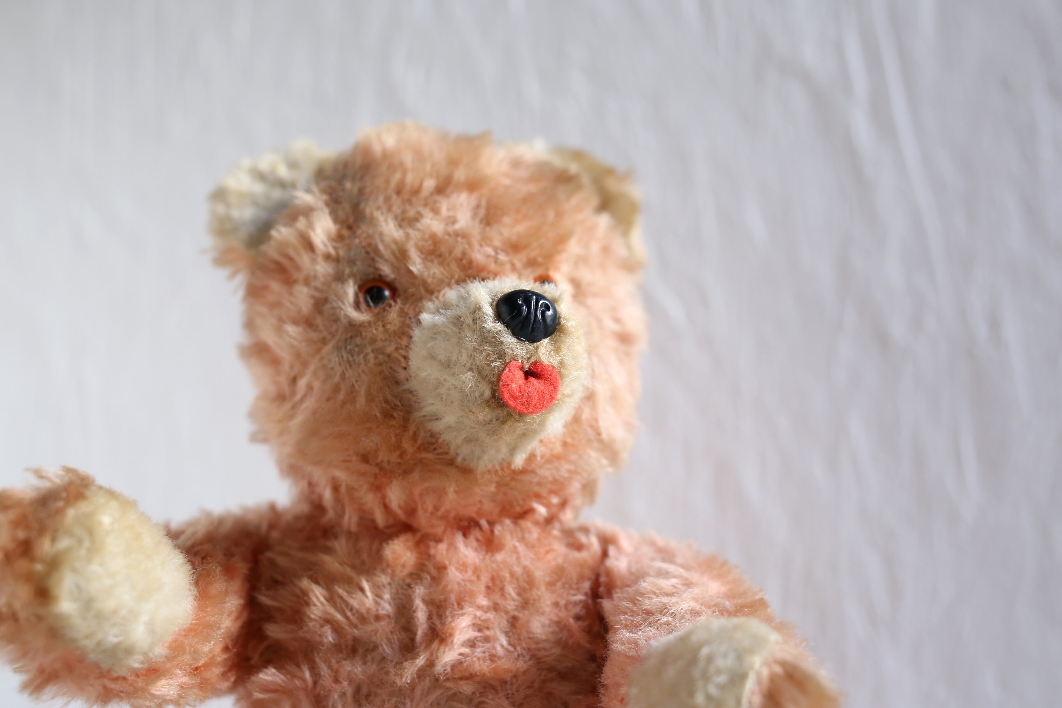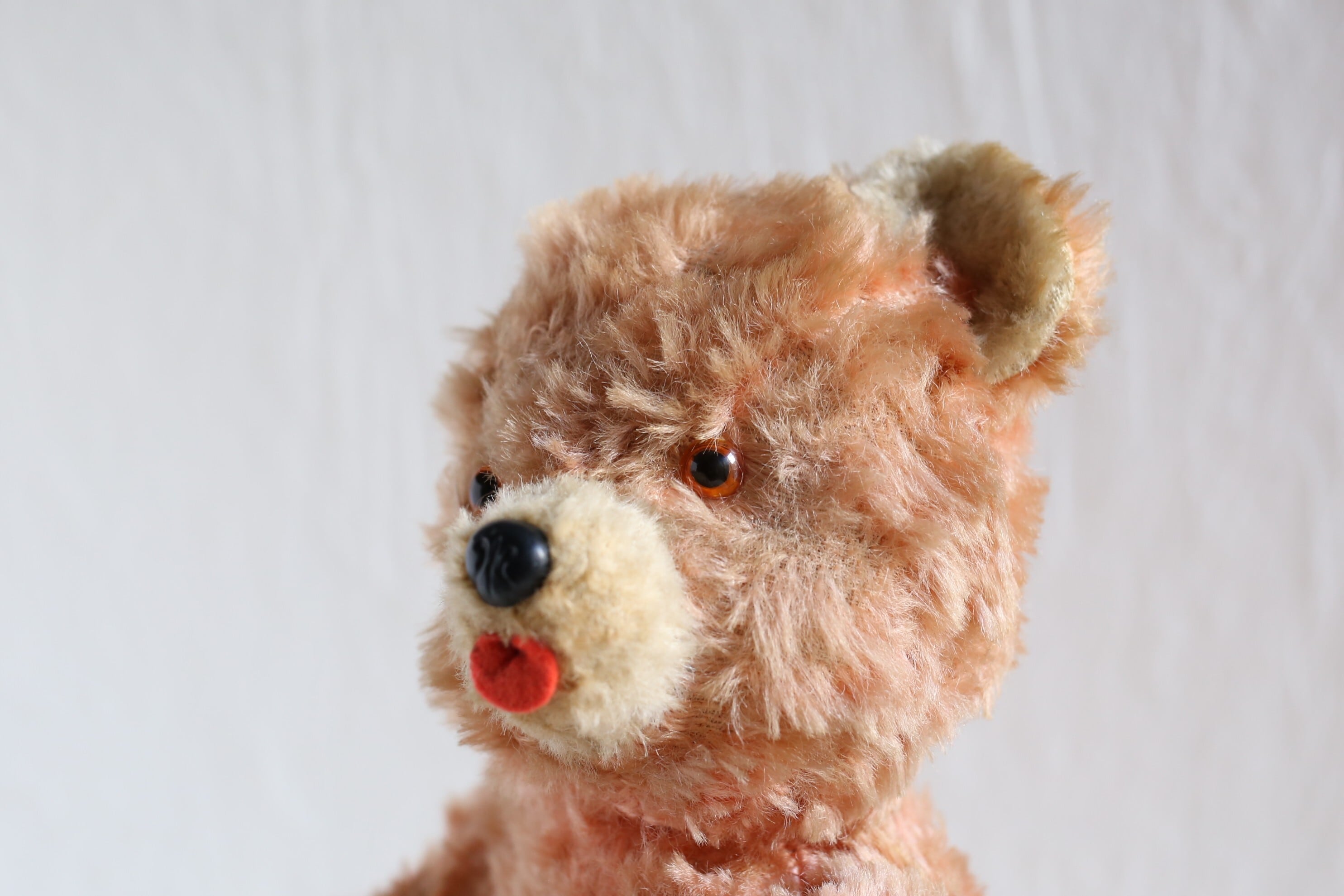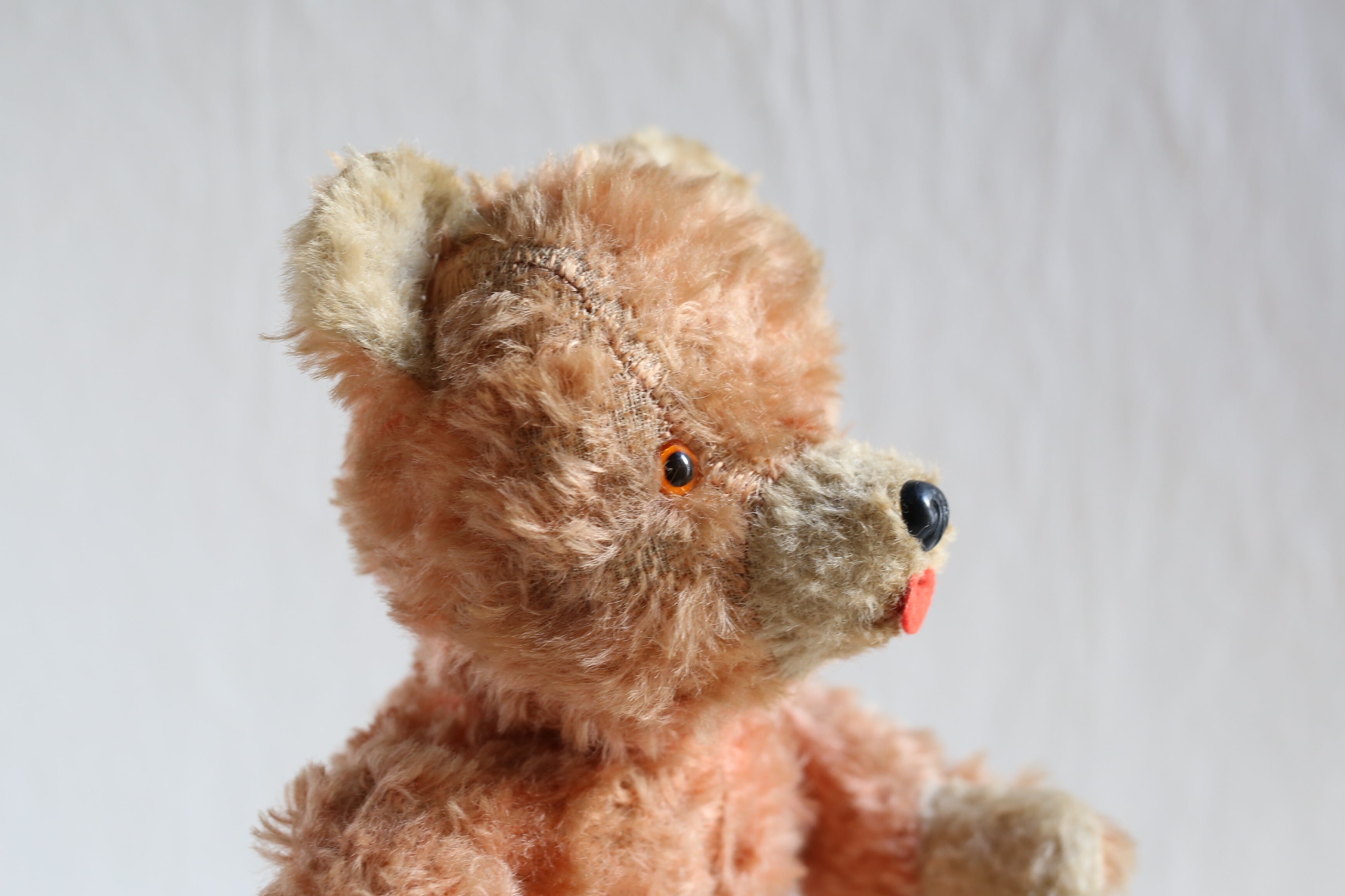 珍しいオレンジがかったピンクのコーラルカラーで、大きめの赤い舌を出してキョトンとしたような表情が可愛いベアです。