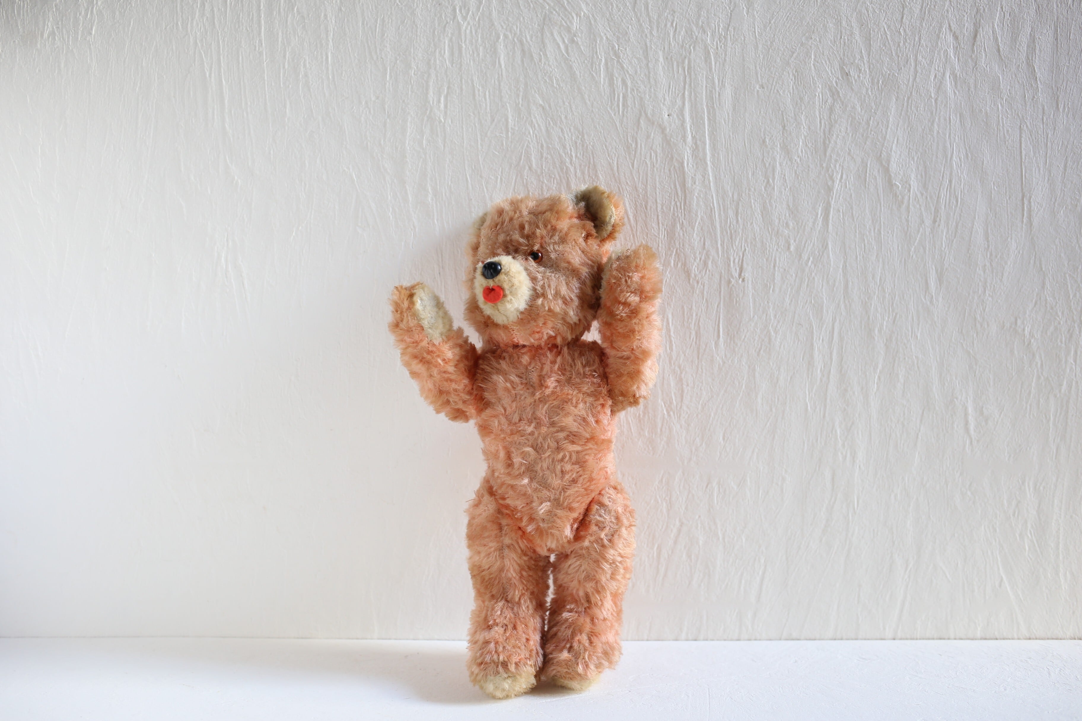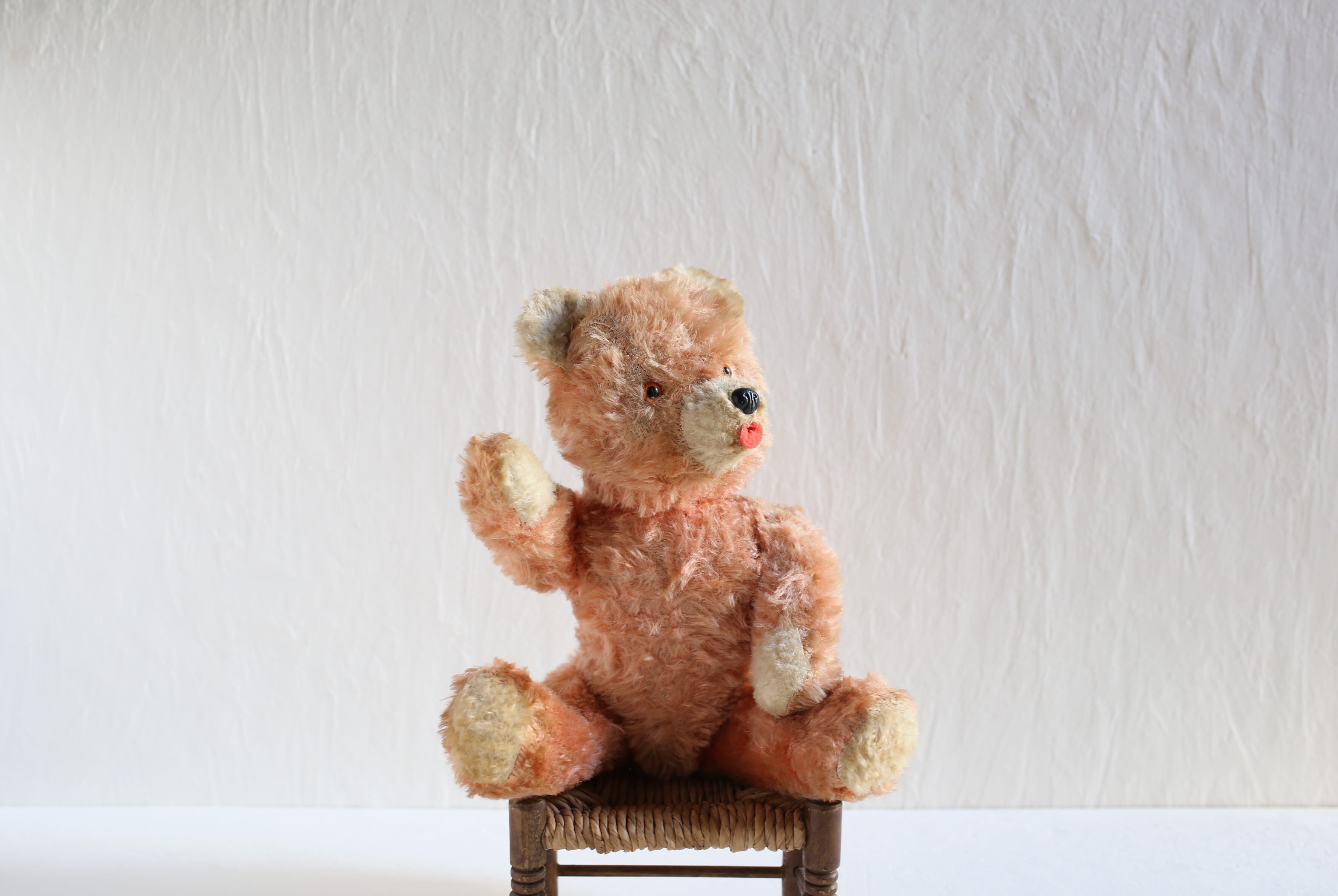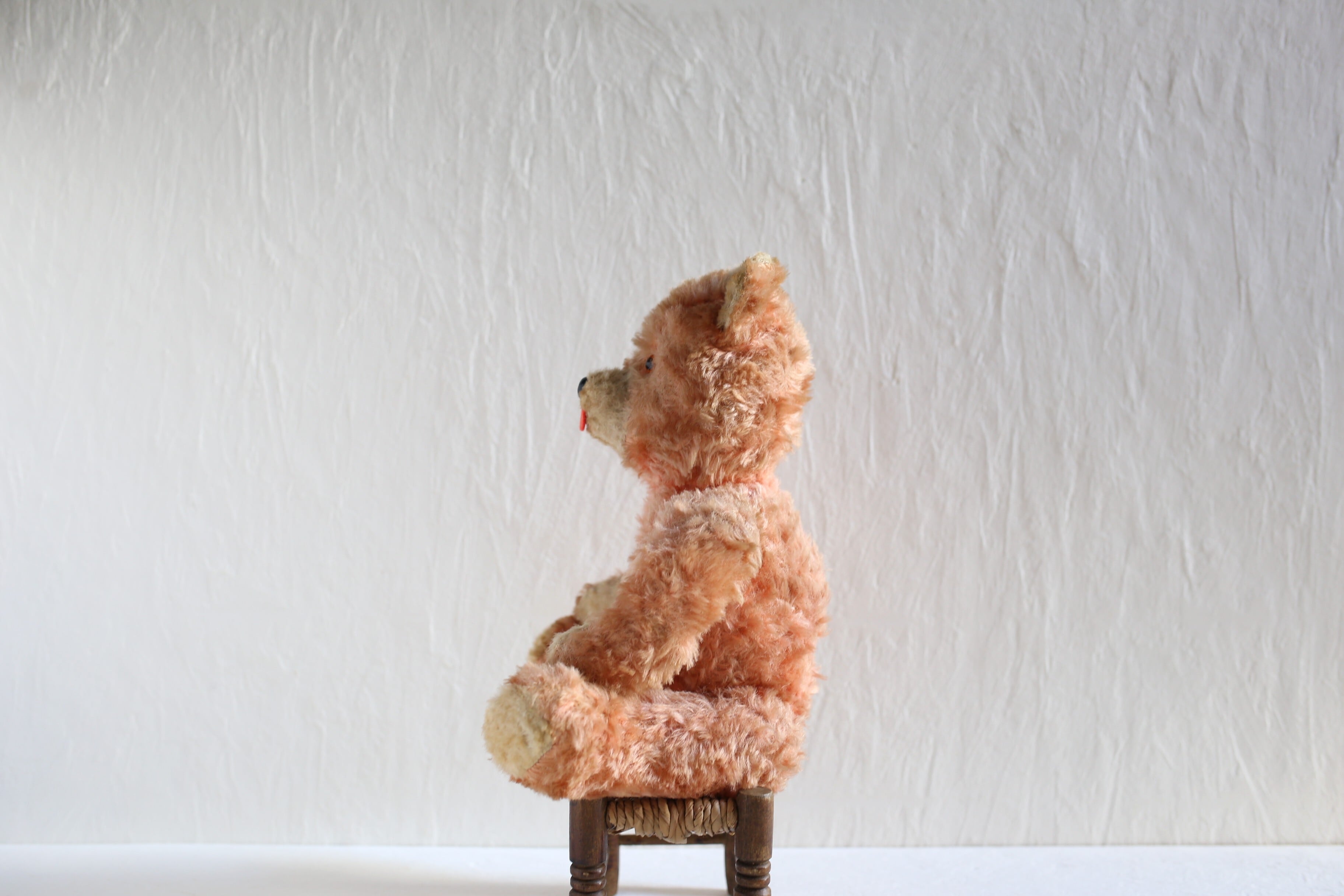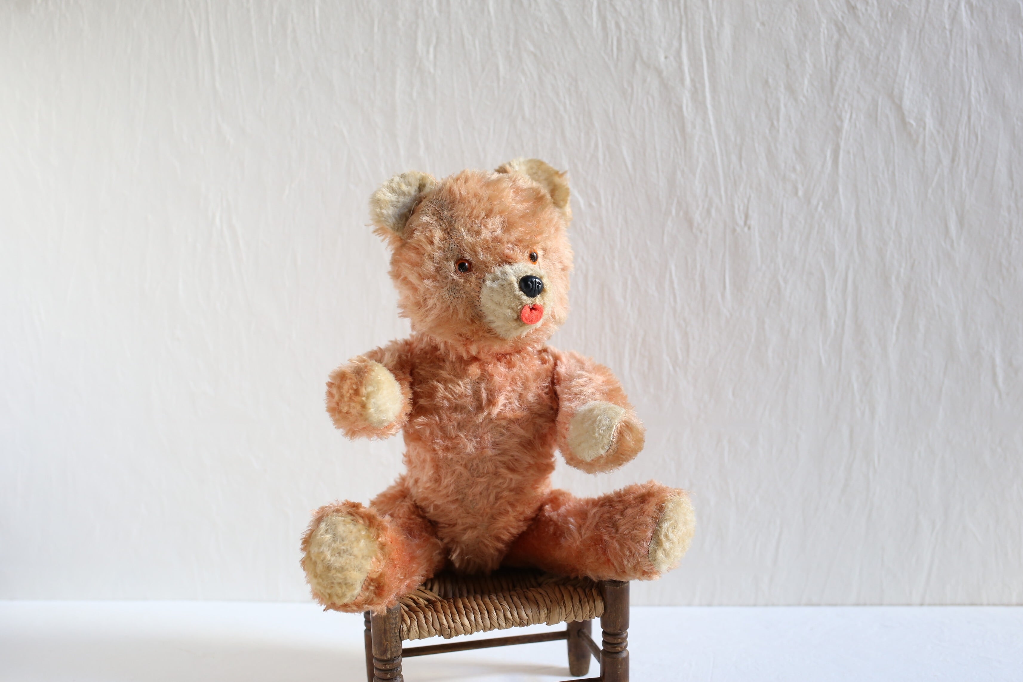 珍しいオレンジがかったピンクのコーラルカラーで、大きめの赤い舌を出してキョトンとしたような表情が可愛いベアです。