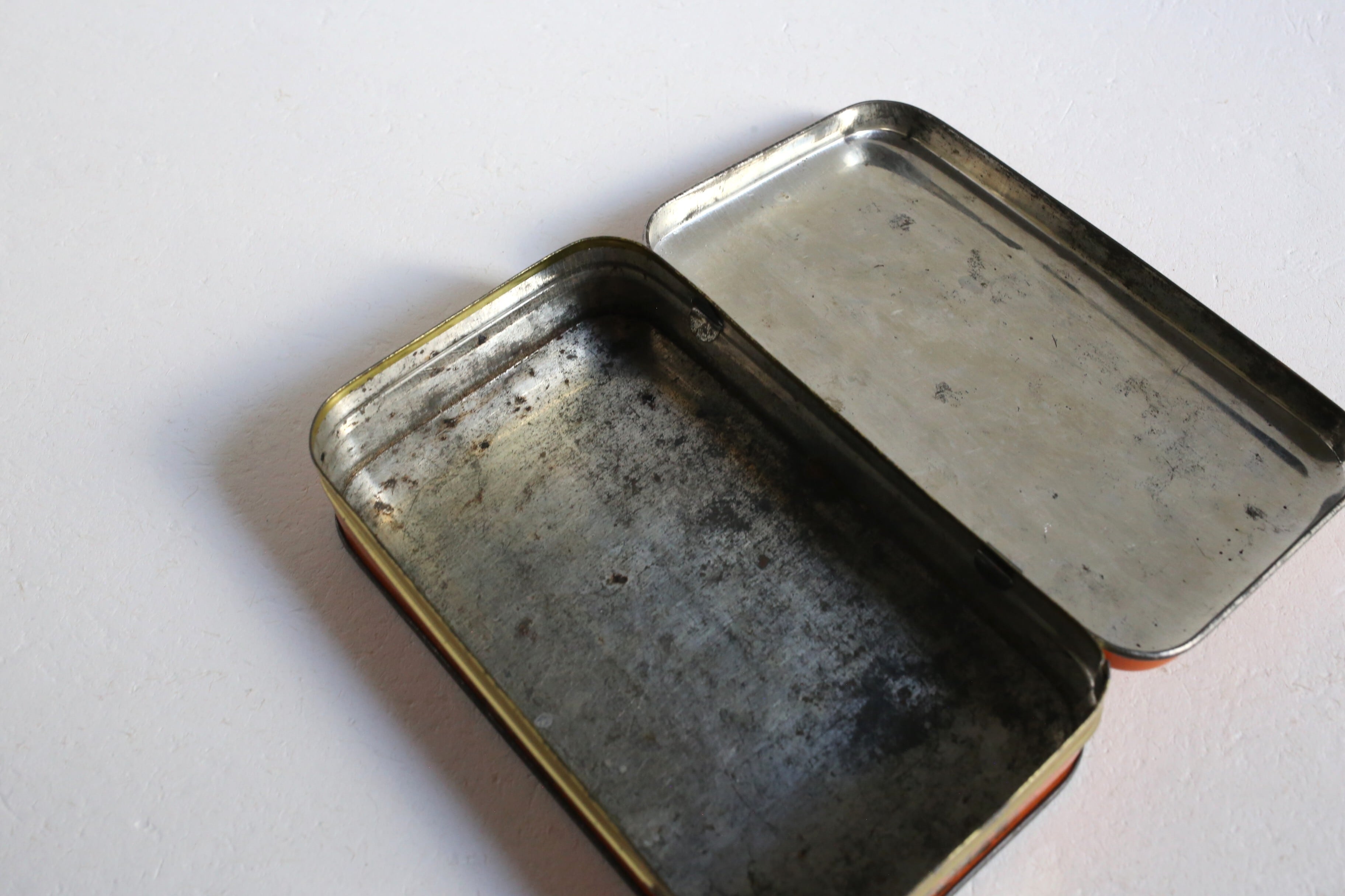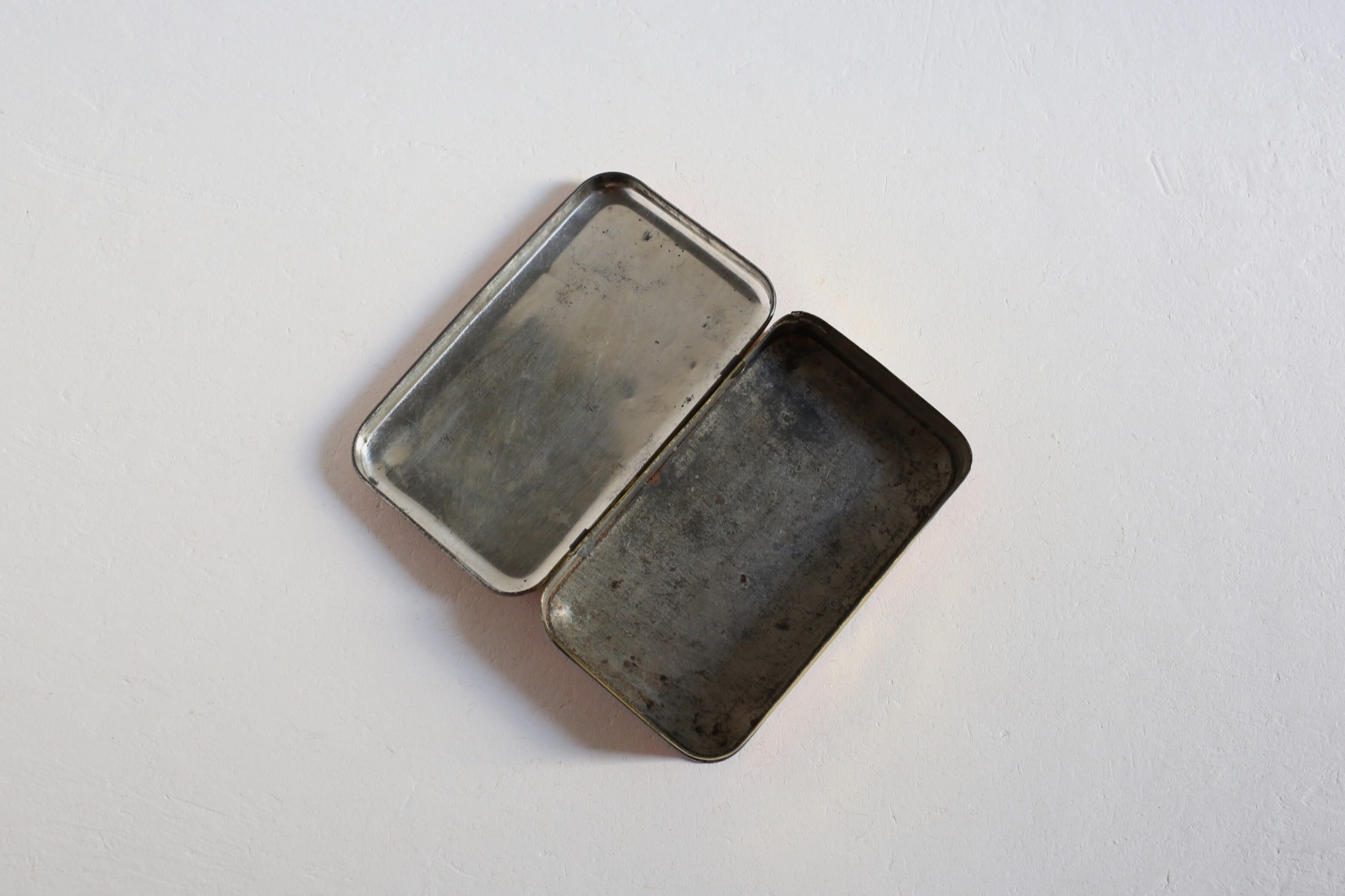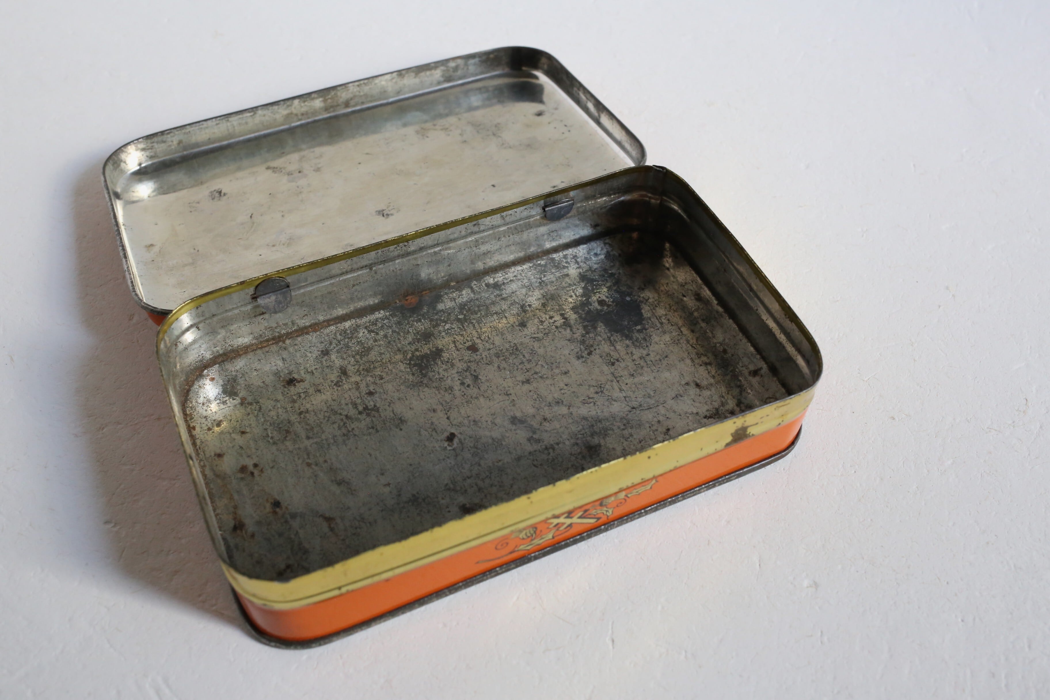 クスミやキズ、わずかにサビや小さなアタリはありますが、ブリキ缶ならではの趣きがあり、