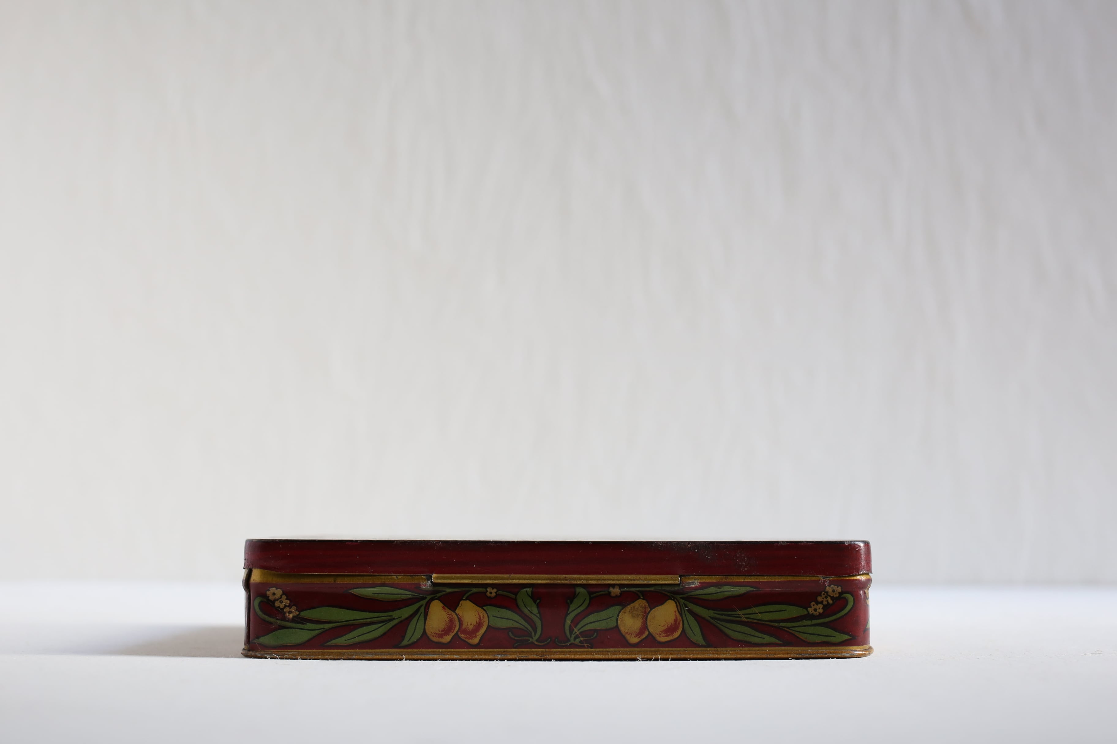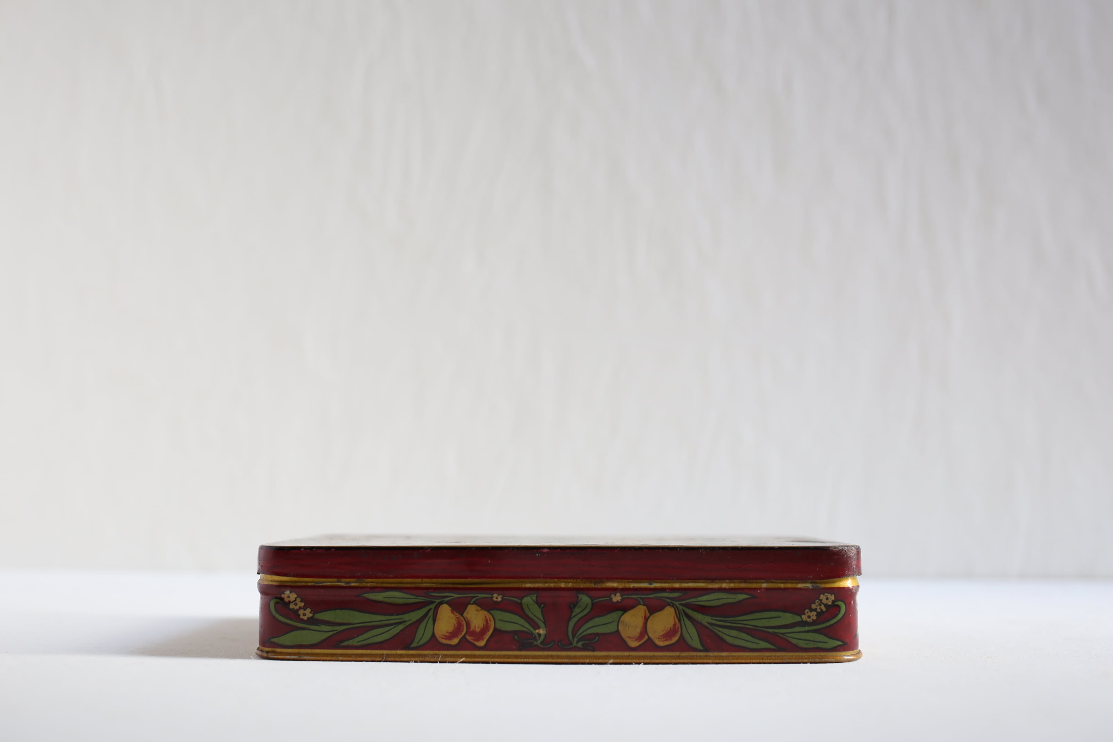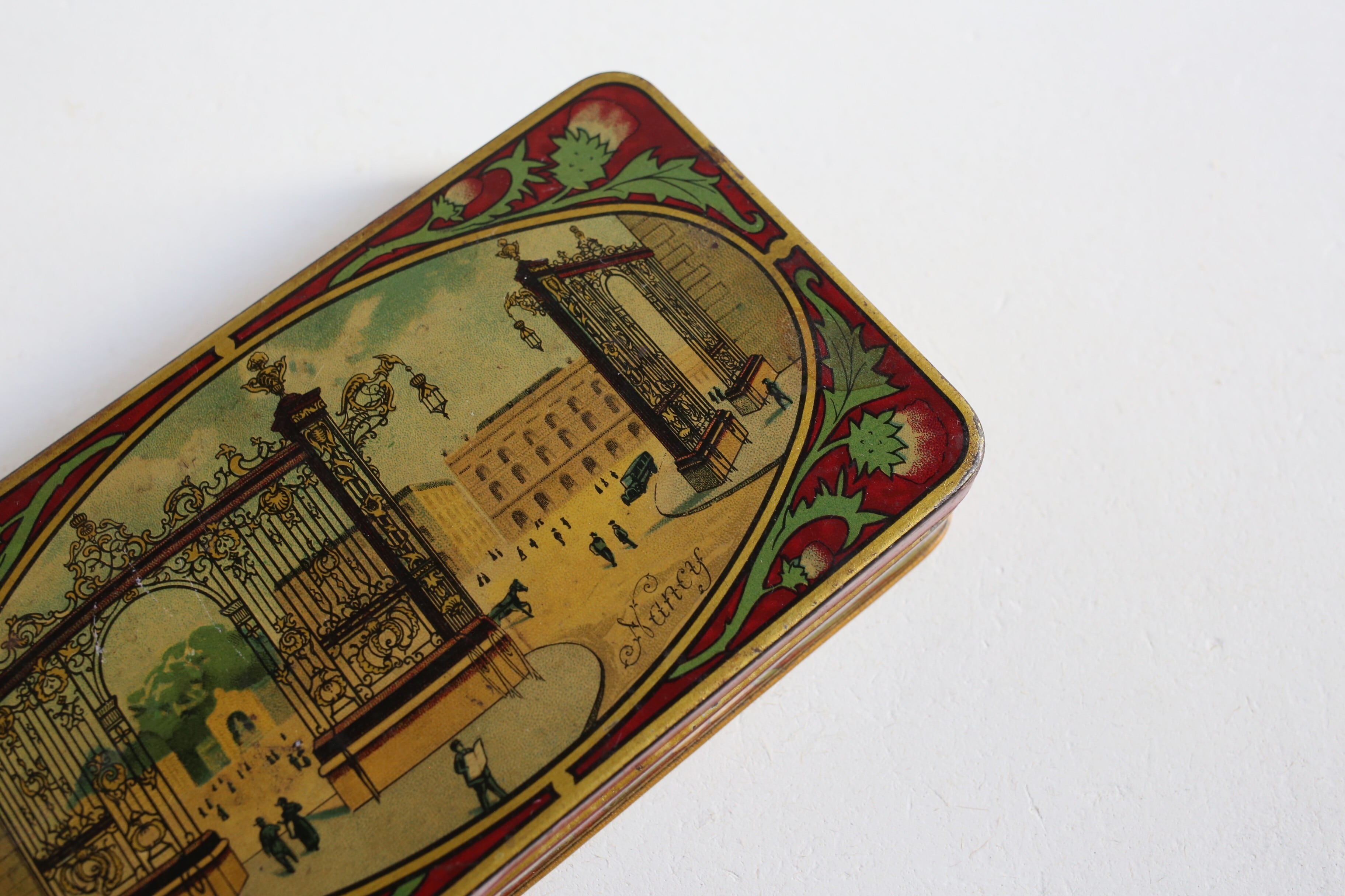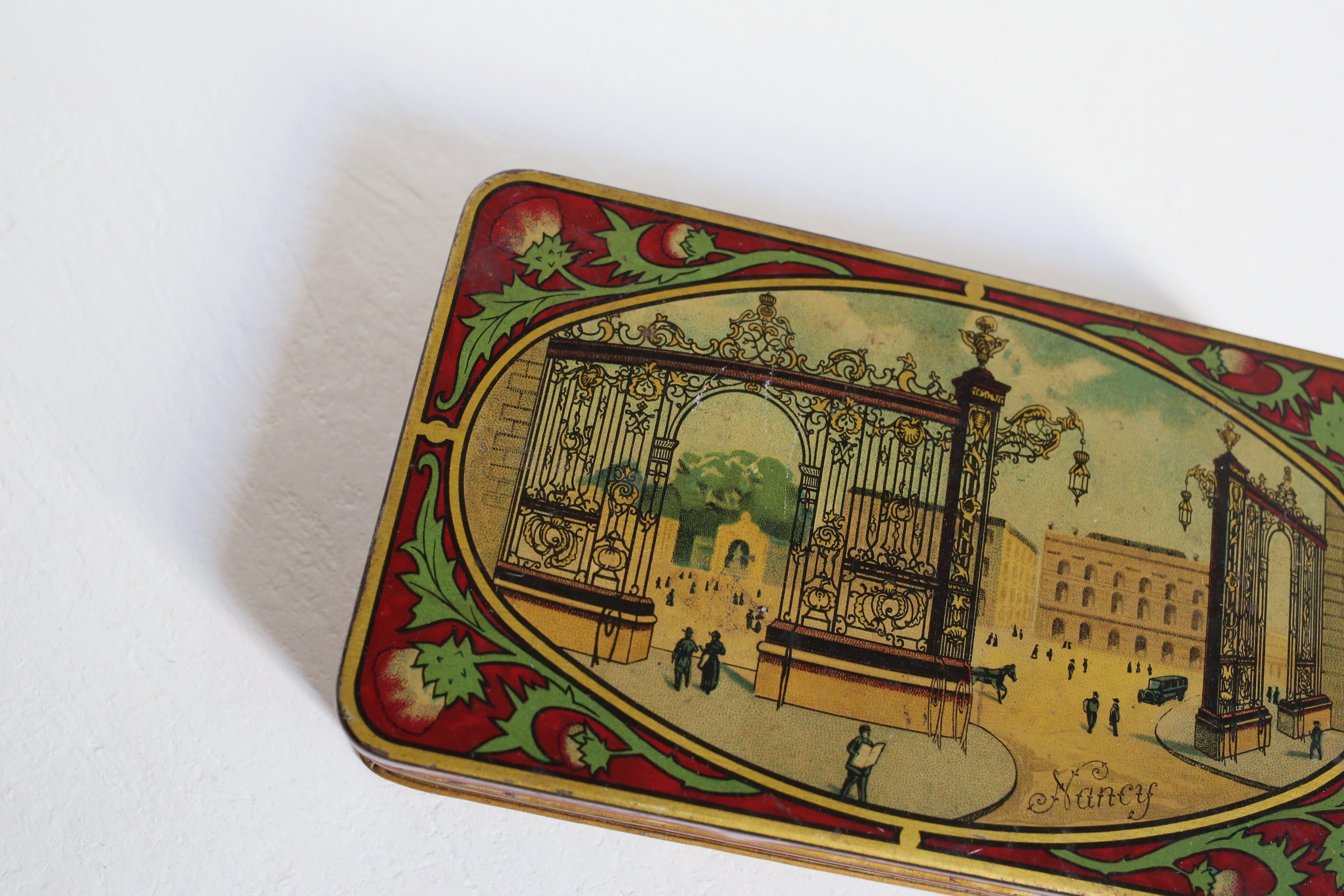 アールヌーボー発祥の地と言われるロレーヌ地方のナンシーらしく、アールヌーボーの絵柄やシックな色合いが素敵な缶です。