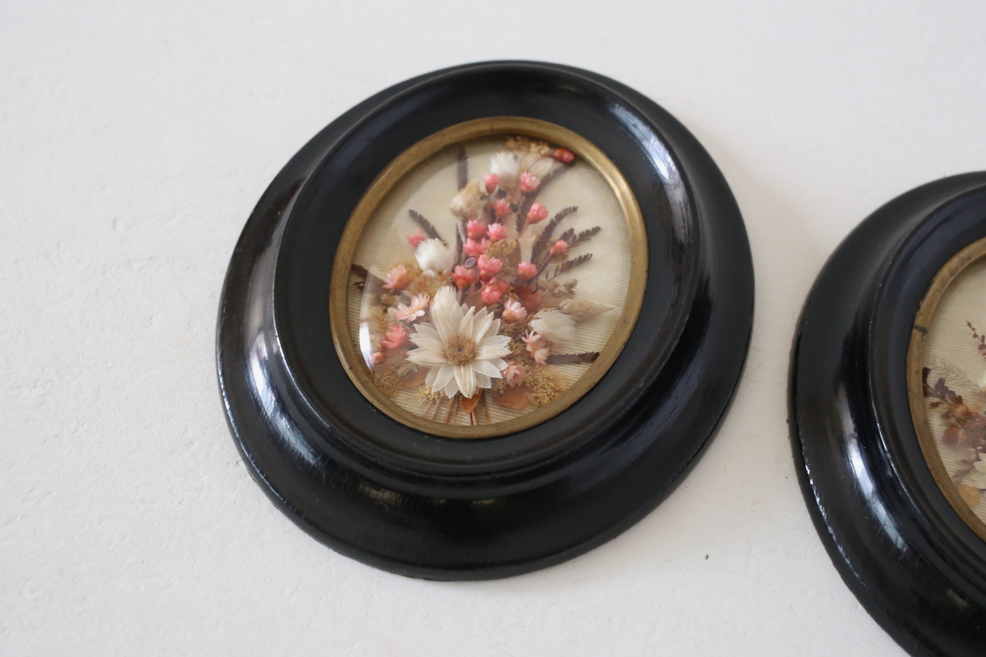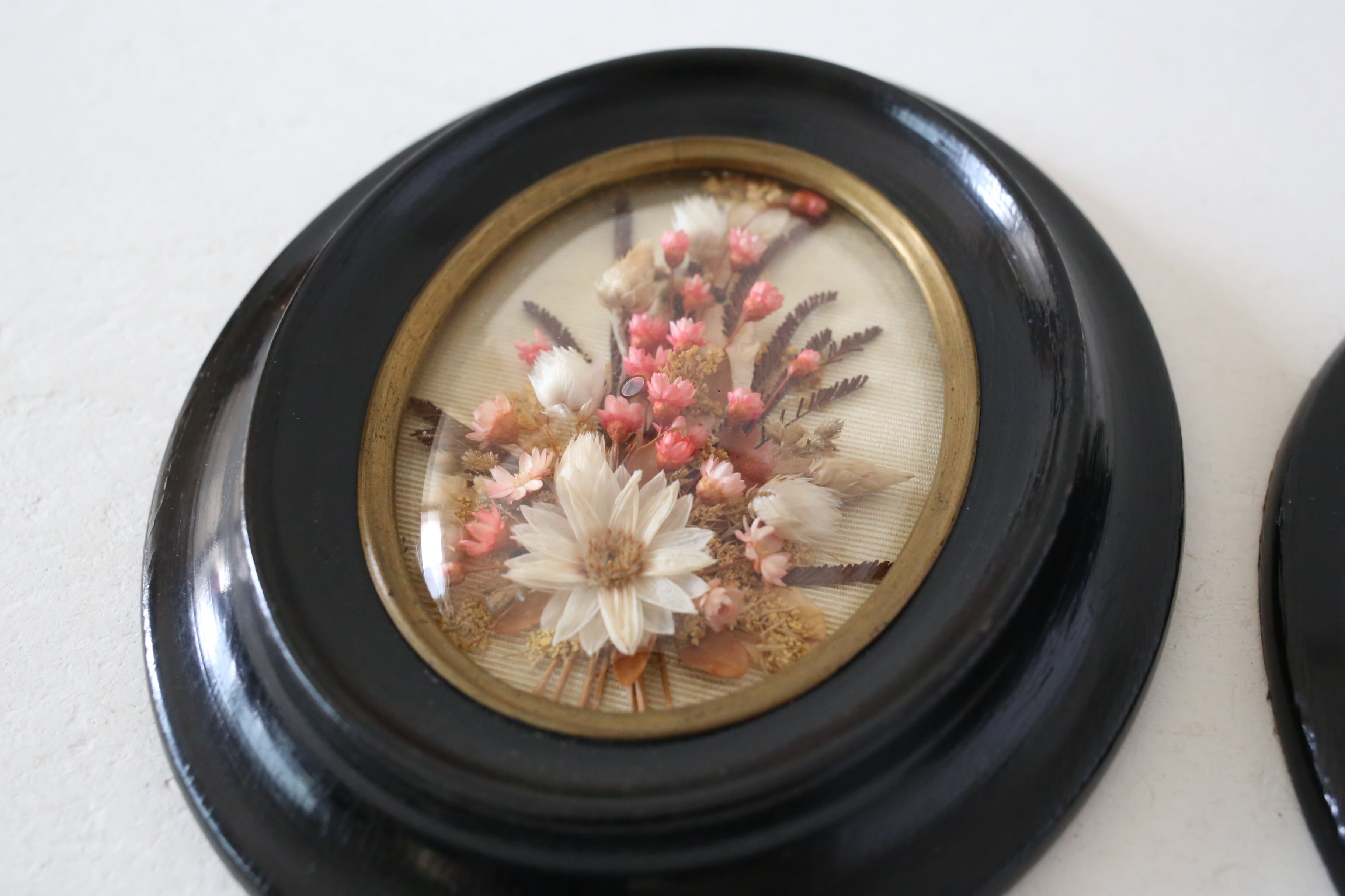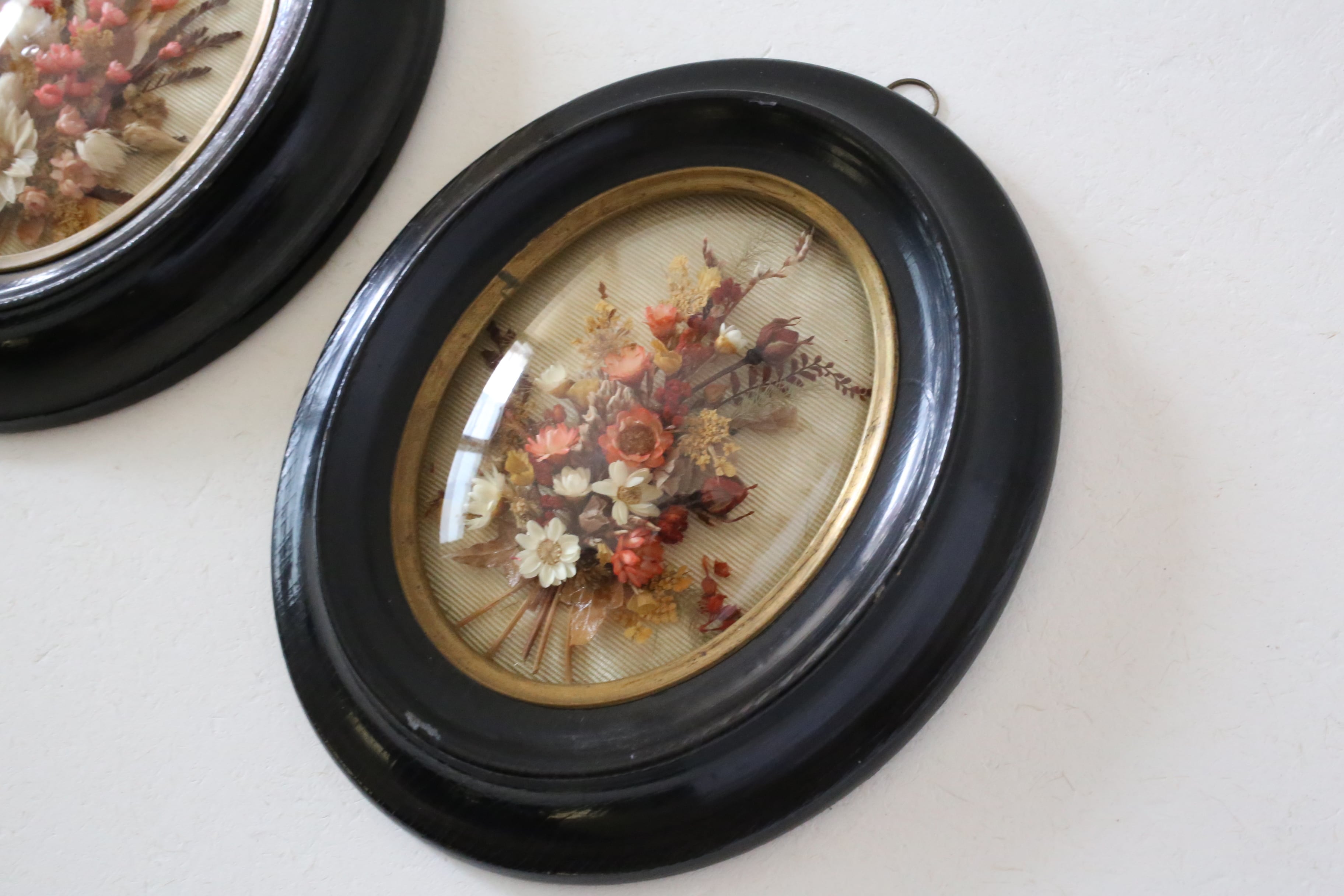 漆黒のフレームに金縁とドーム状のガラスがはめ込まれ、内側には小さなブーケが入った素敵な壁飾りです。