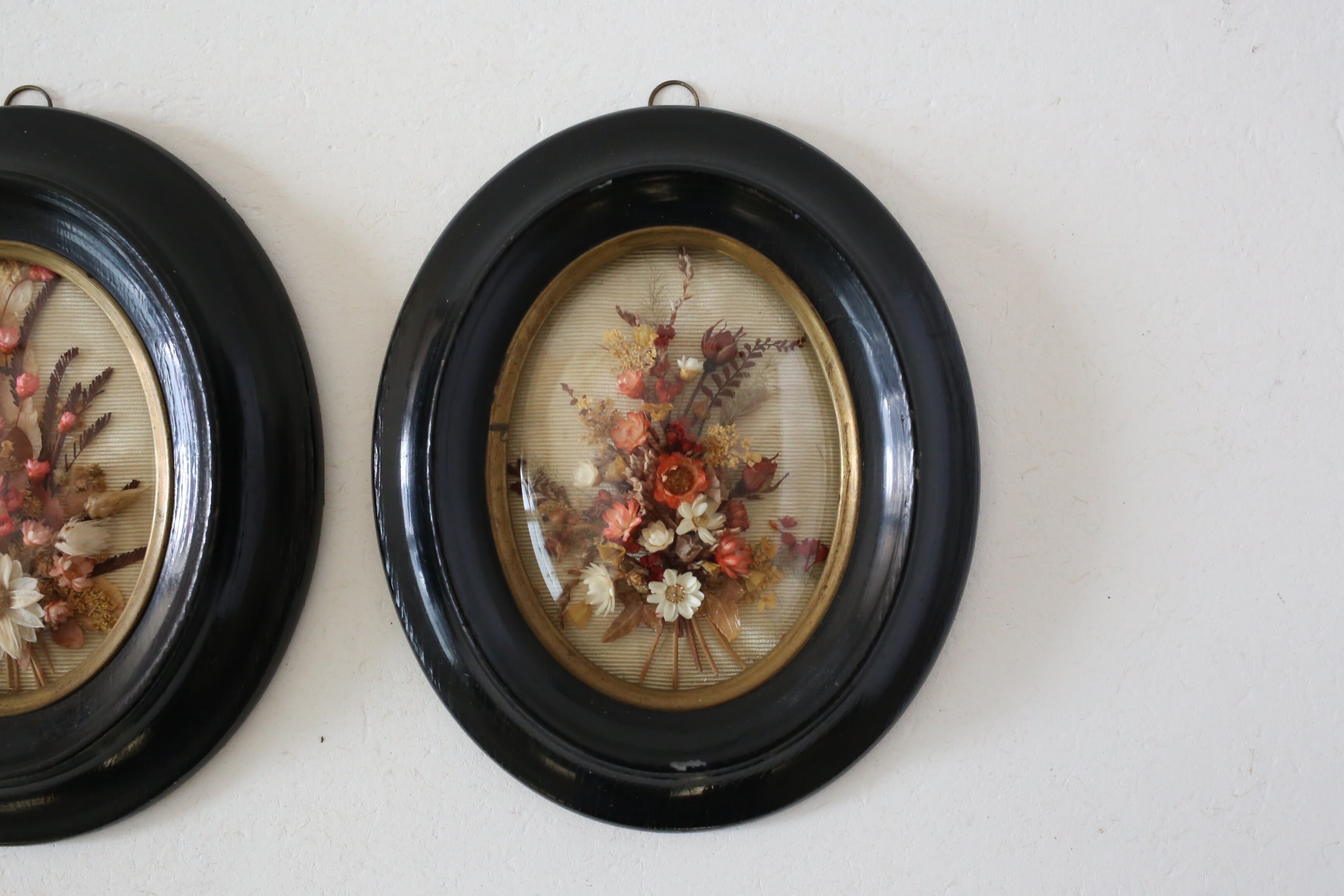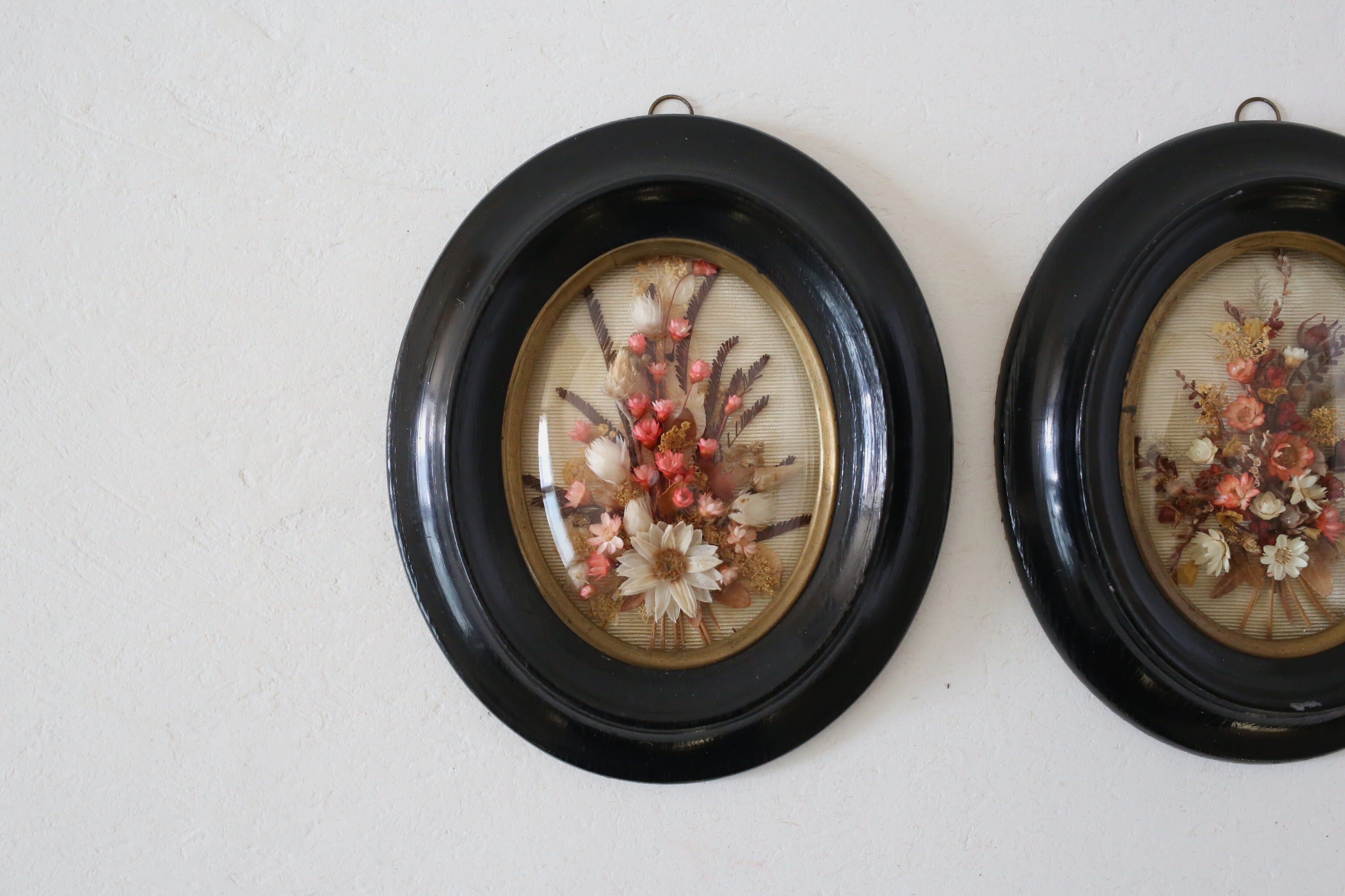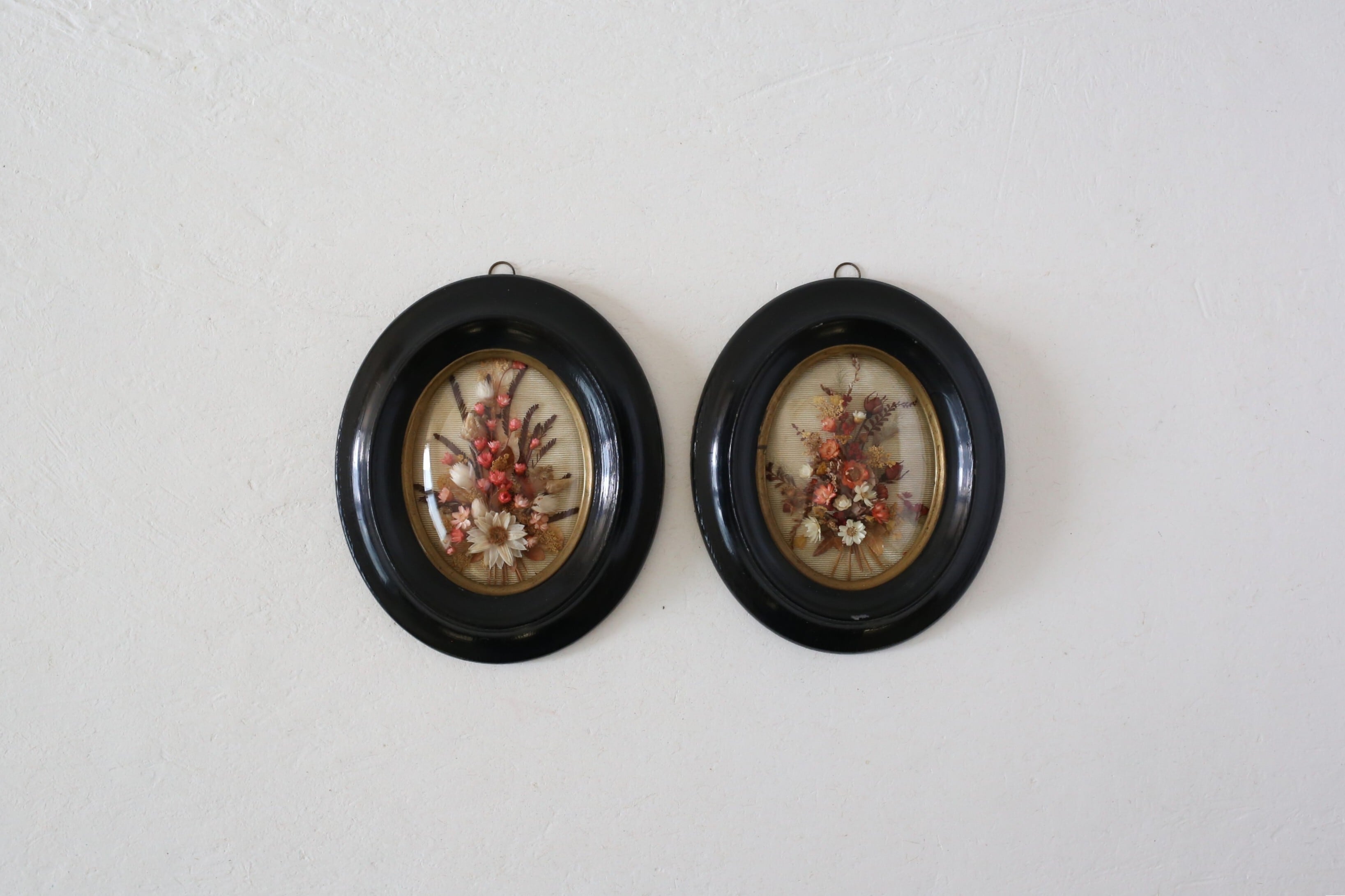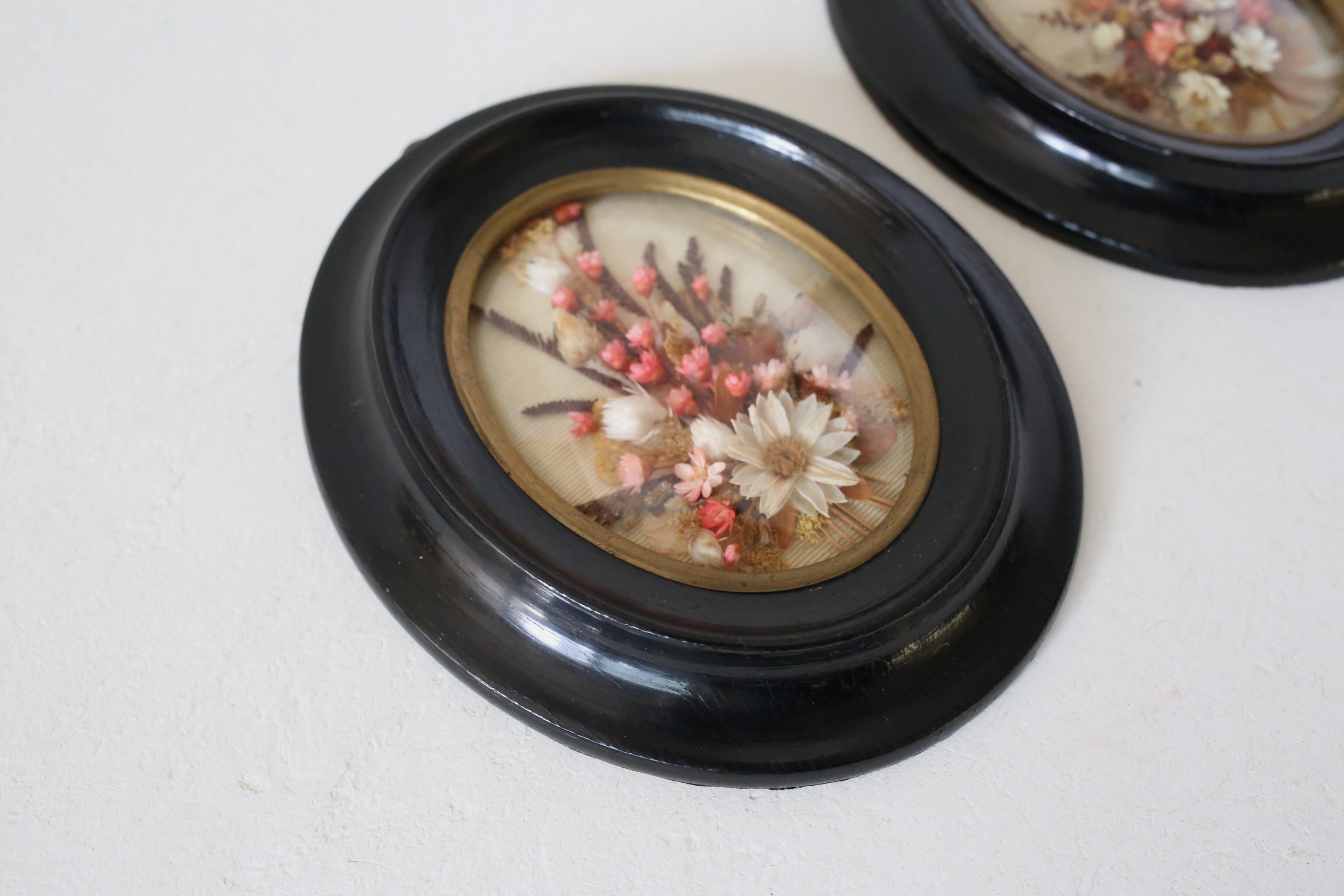 漆黒のフレームに金縁とドーム状のガラスがはめ込まれ、内側には小さなブーケが入った素敵な壁飾りです。