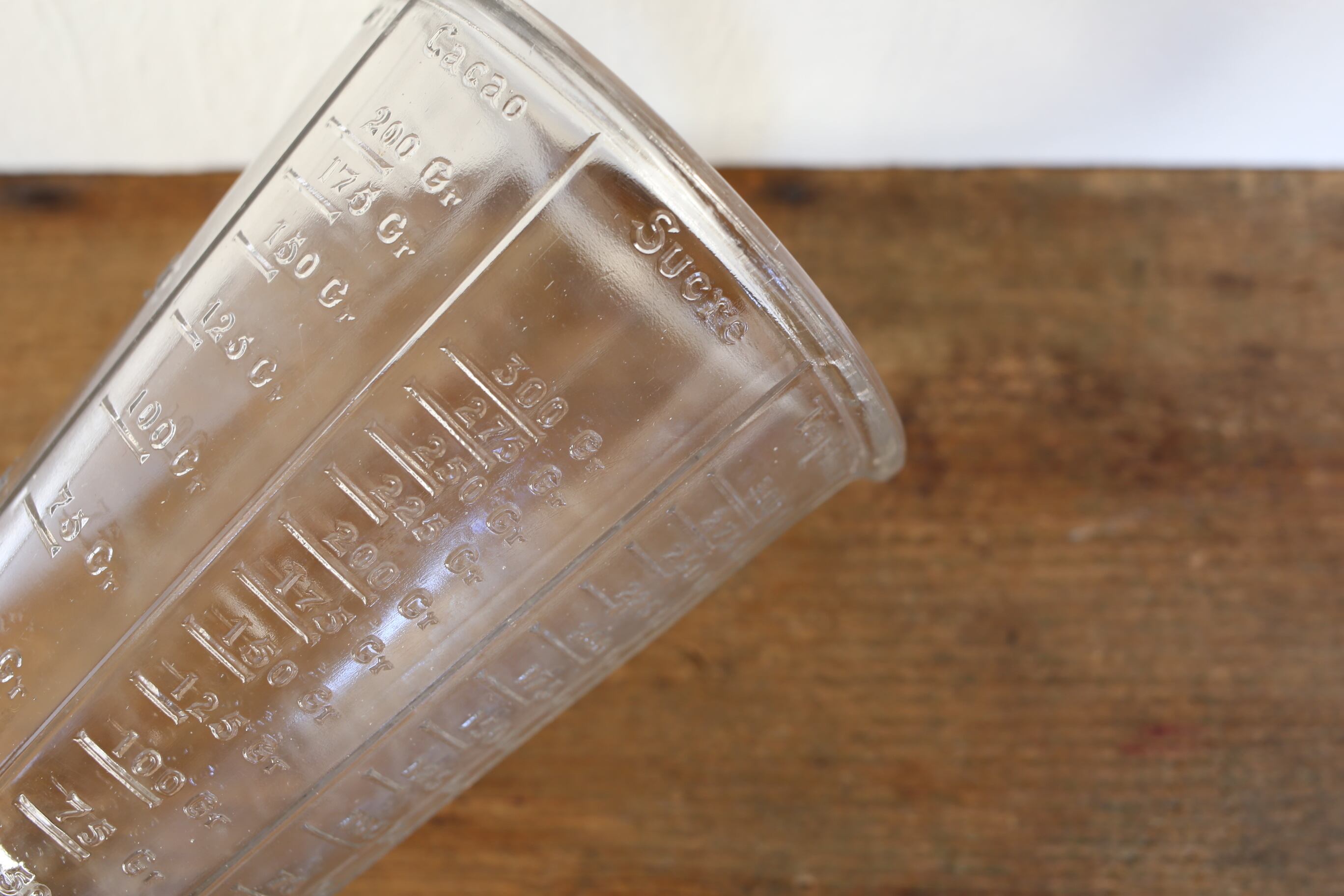 古いガラス製品ならではのガラスの揺れや気泡があり、厚いガラスの本体全体に細かく文字と数字、メモリが浮き出たとても雰囲気が良いメジャーカップです。