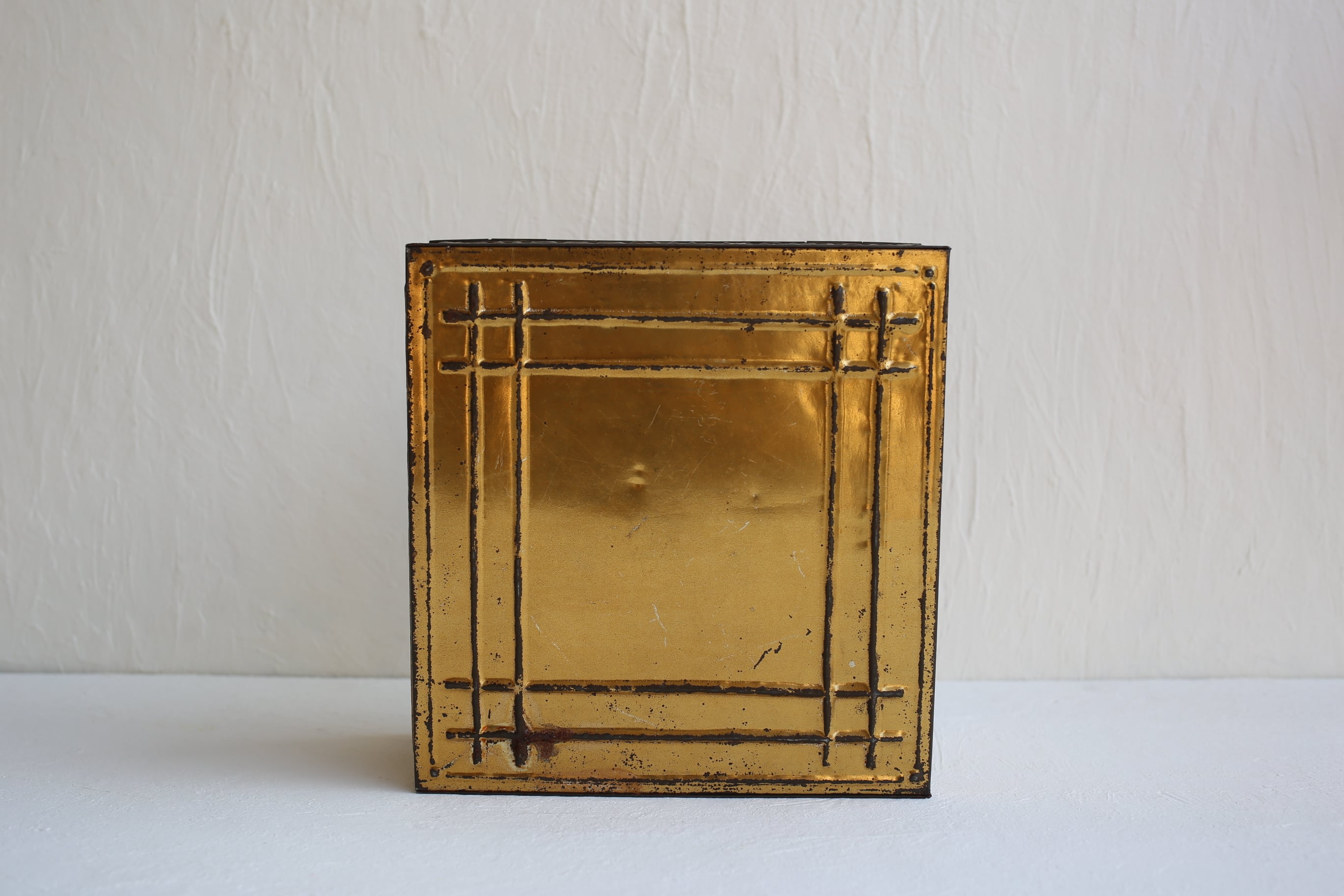 カゴの編み込みを思わせるポコポコとした地の蓋と側面に浮き上がるCHOCOLAT MENIERの文字、くすんだイエローゴールドの組み合わせが素敵な缶です。