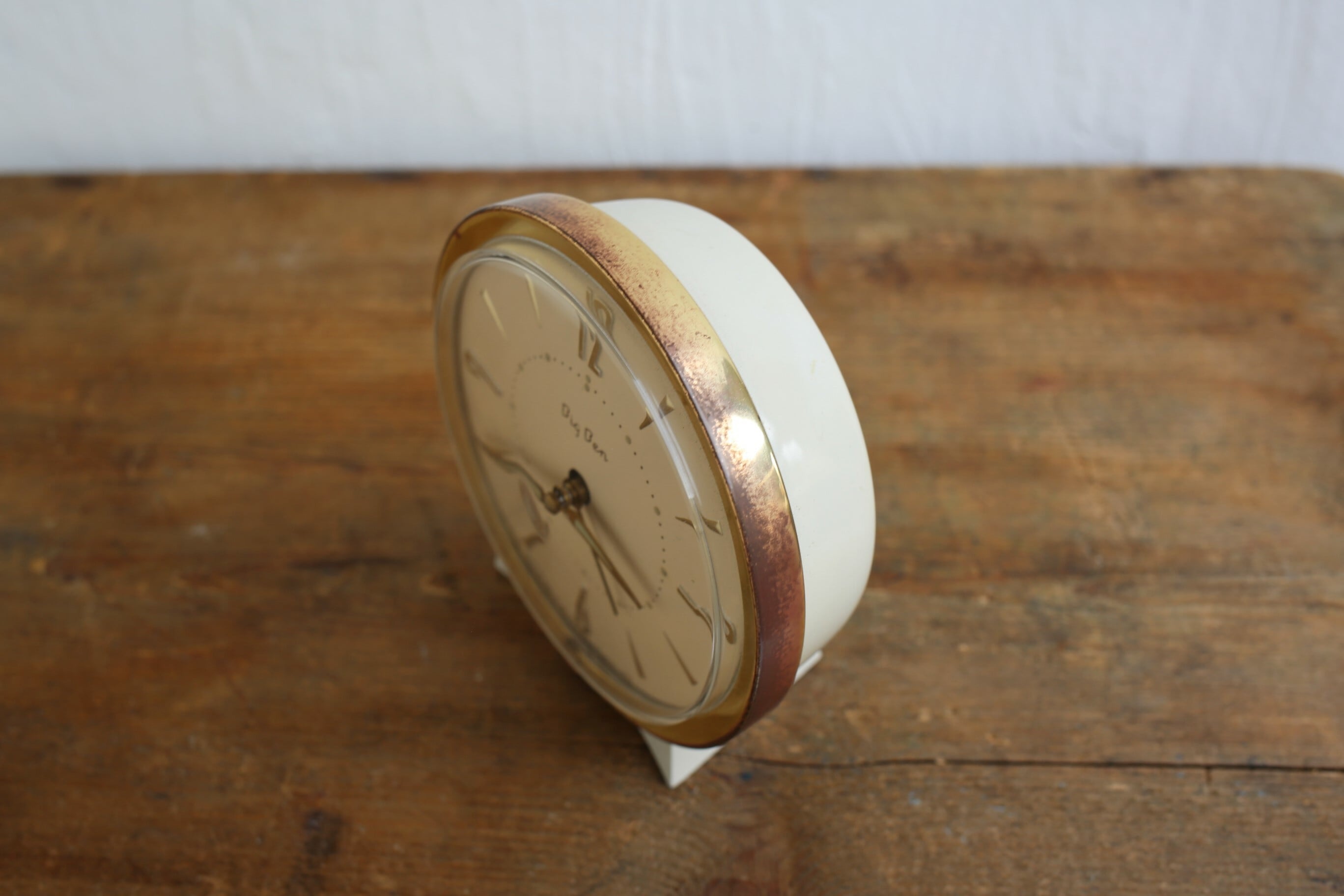 クリーム色とゴールドの組み合わせで一見シンプルですが、文字盤の数字やBig Benの文字の書体、プラスチックカバーの中心が少し尖るように盛り上がるデザイン、土台のカットなどミッドセンチュリー・モダンを感じさせる上品なデザインです。