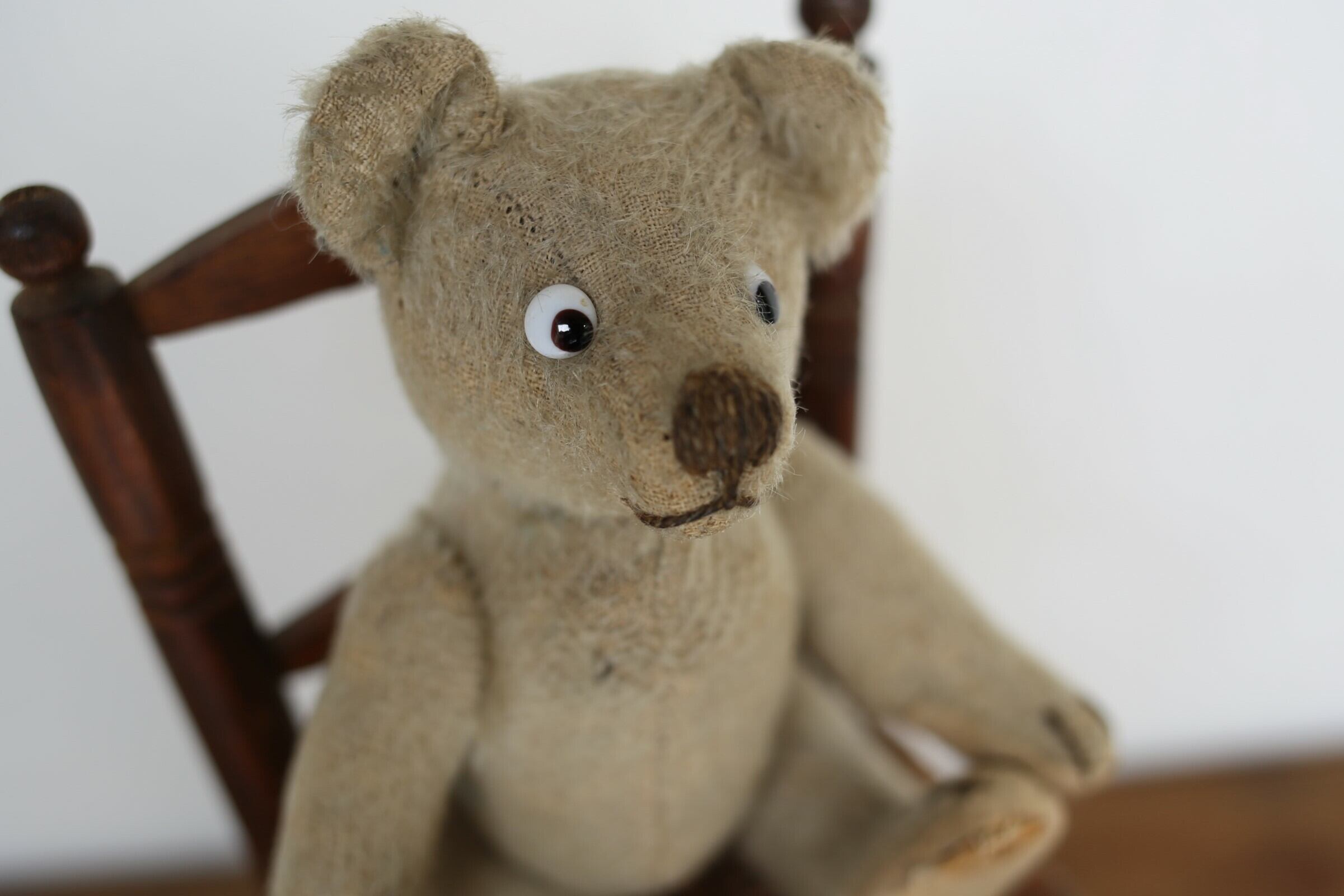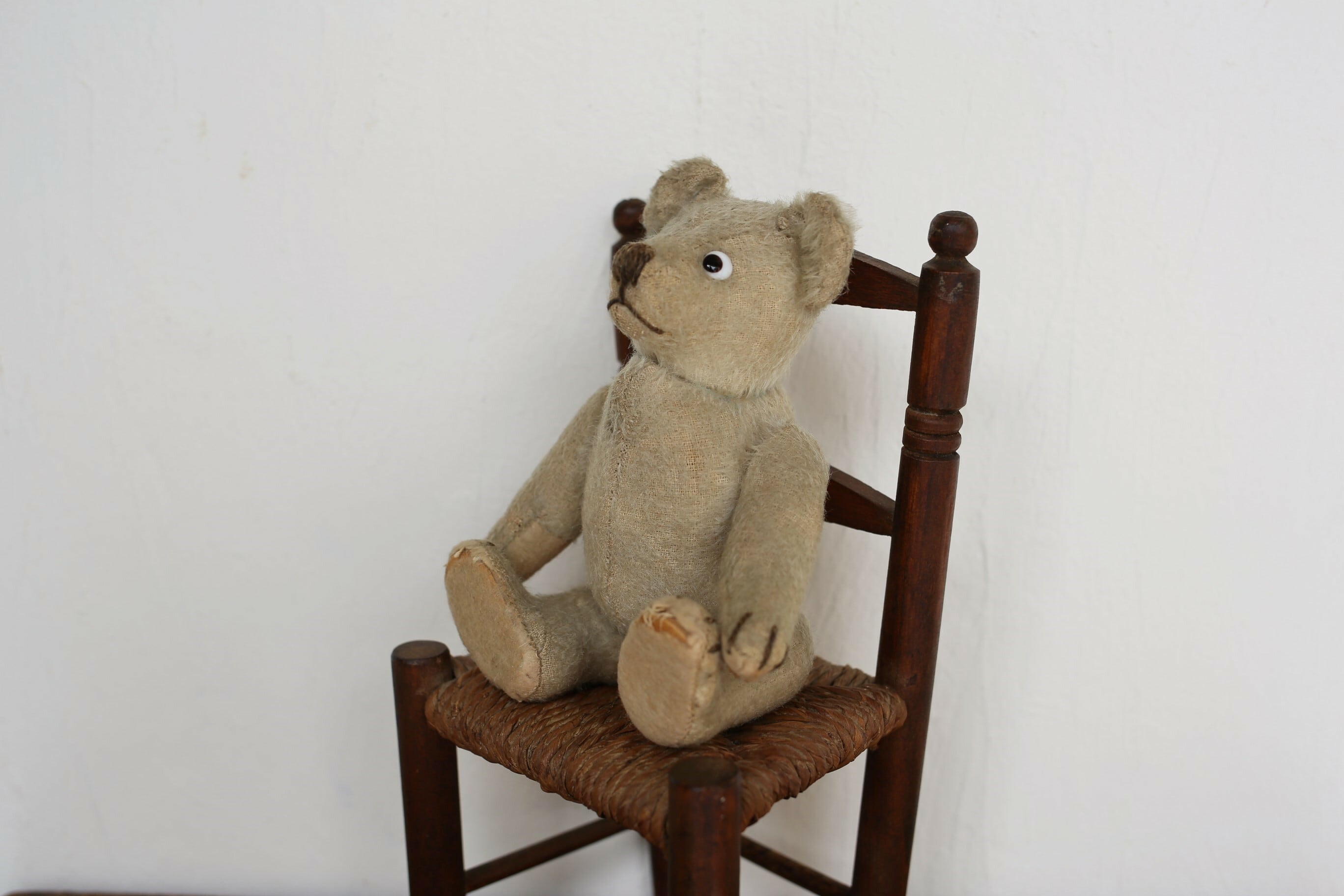 落ち着いたグレーがかったベージュに愛嬌のある目はグラスアイで、中は木屑がしっかりと硬めに詰められています。