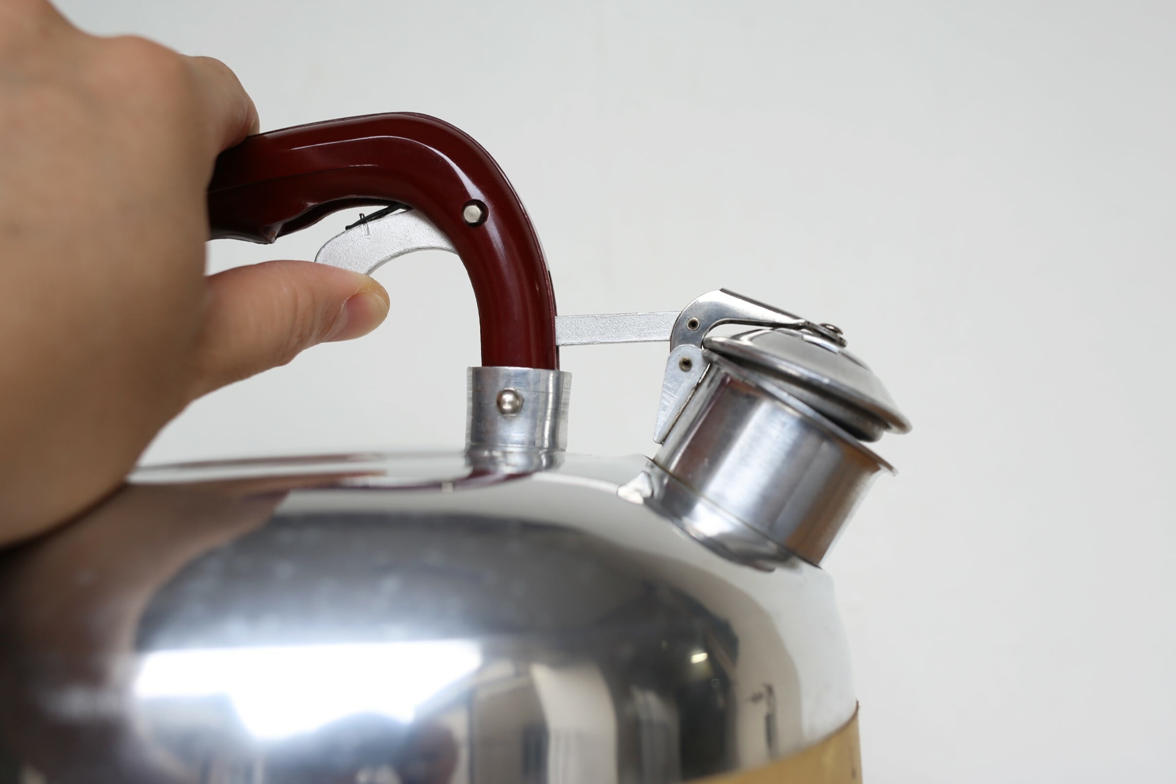 ベークライトの持ち手やレバーを握ると蓋が開く構造など、とても格好良いデザインのケトルです。