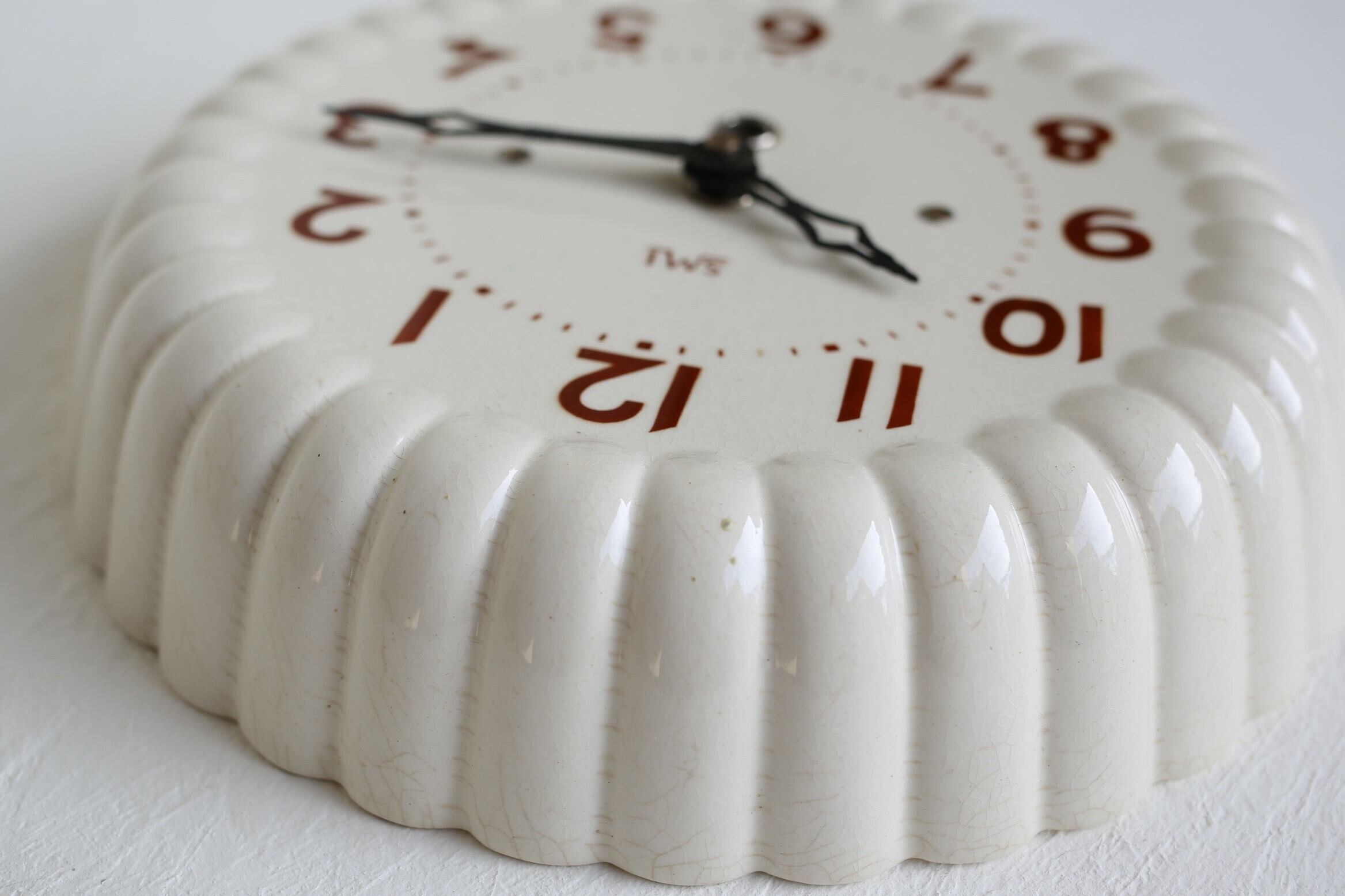 貫入と釉薬の艶が素敵なクリーム色の陶器製でお菓子の型や花のような曲線のフォルムが美しい時計です。