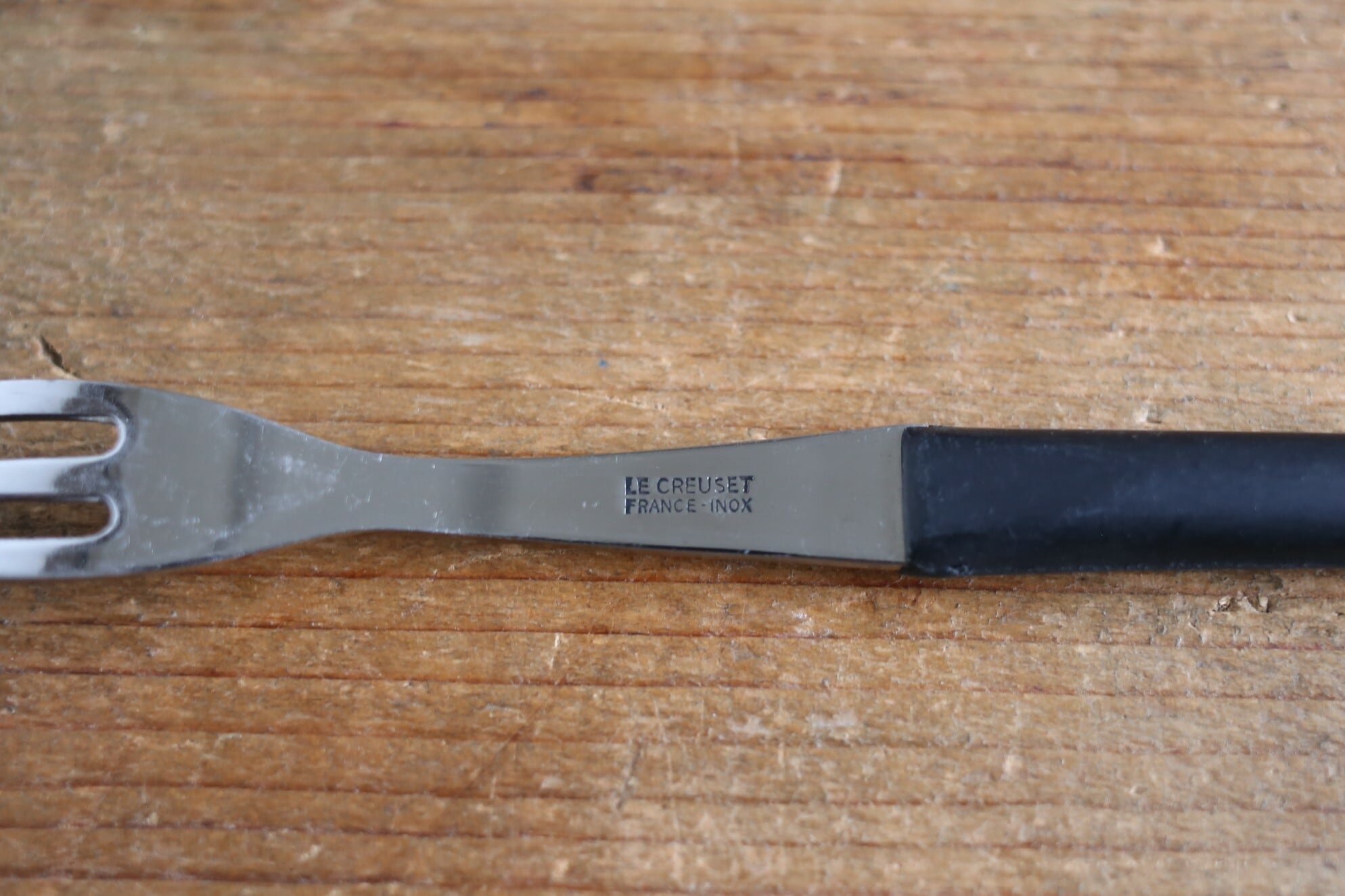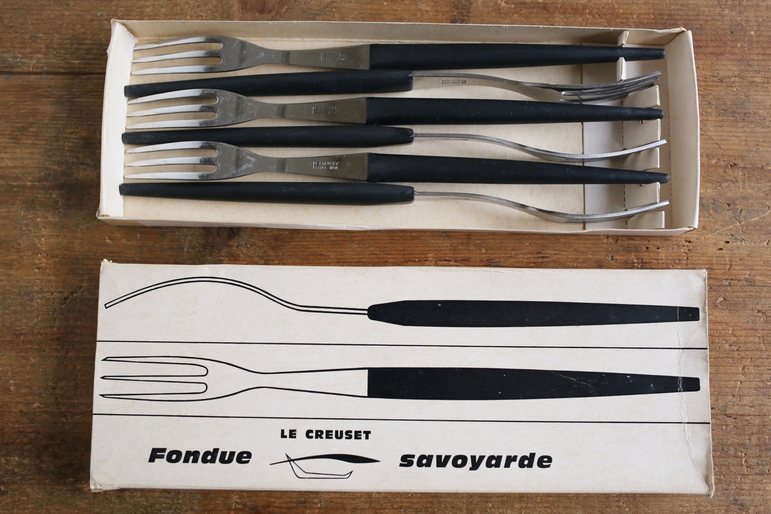 フォンデュ用のフォークは当時別売りされていたものですが、ステンレスとプラスチックの洗練されたデザインです。