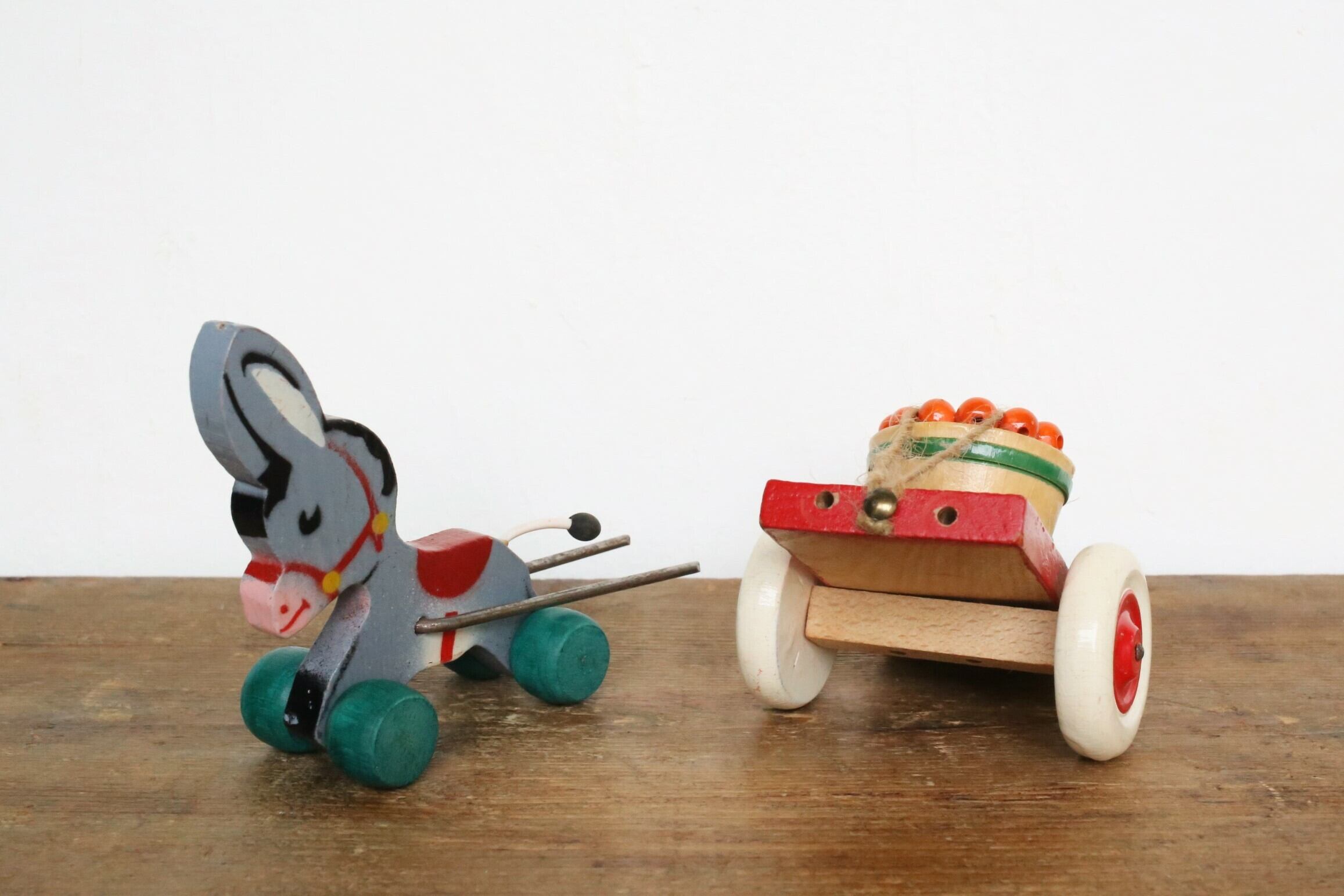 ロバの表情がなんともいえず健気で愛らしく、眺めていると癒される木製のおもちゃです、