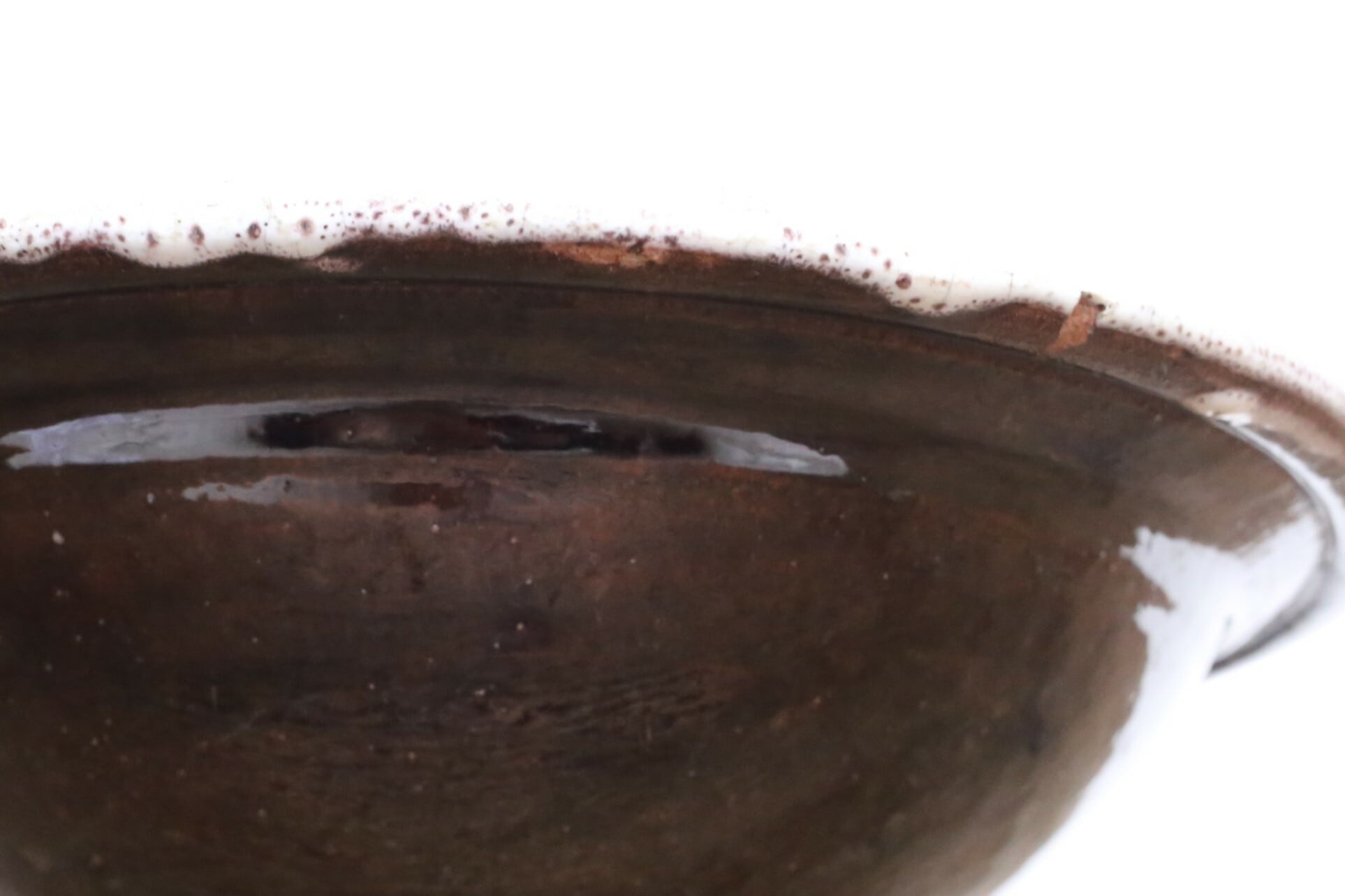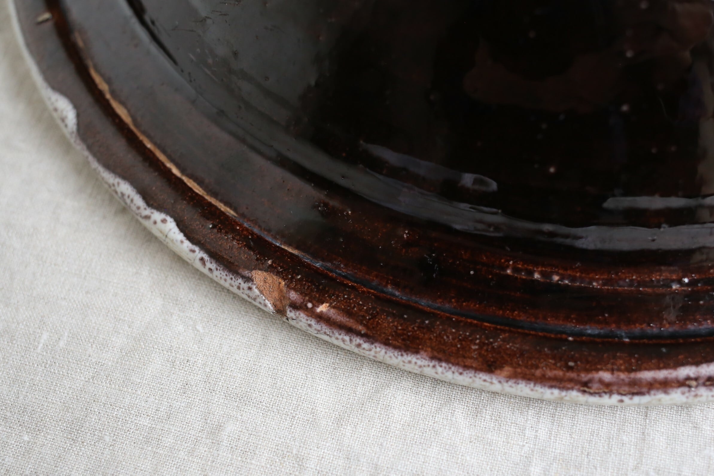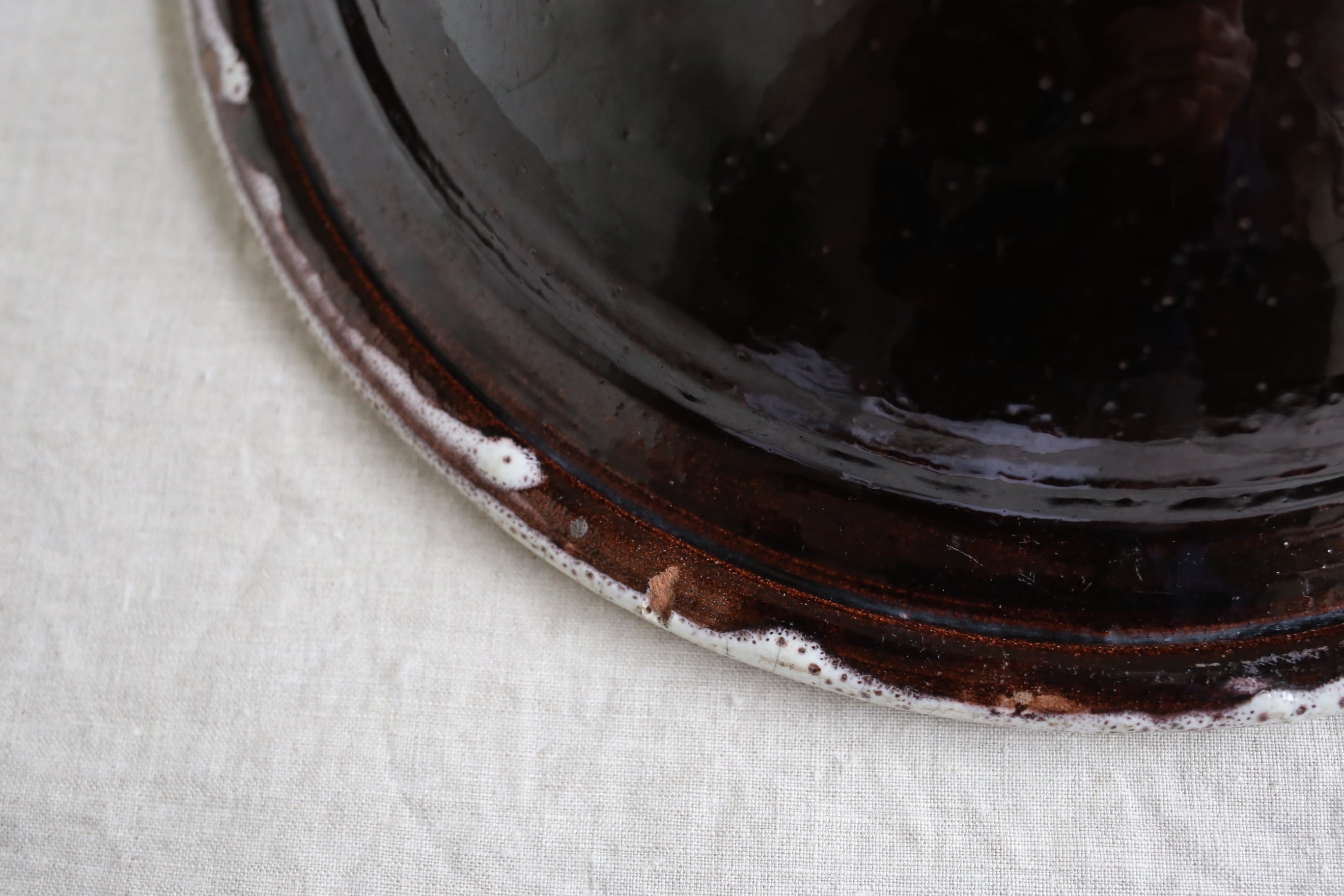 キュノワールはテラコッタ(赤レンガのような土)の上に表面に白い釉薬と裏面に黒色(こげ茶色)の釉薬をたっぷりとかけられて焼かれたものです。