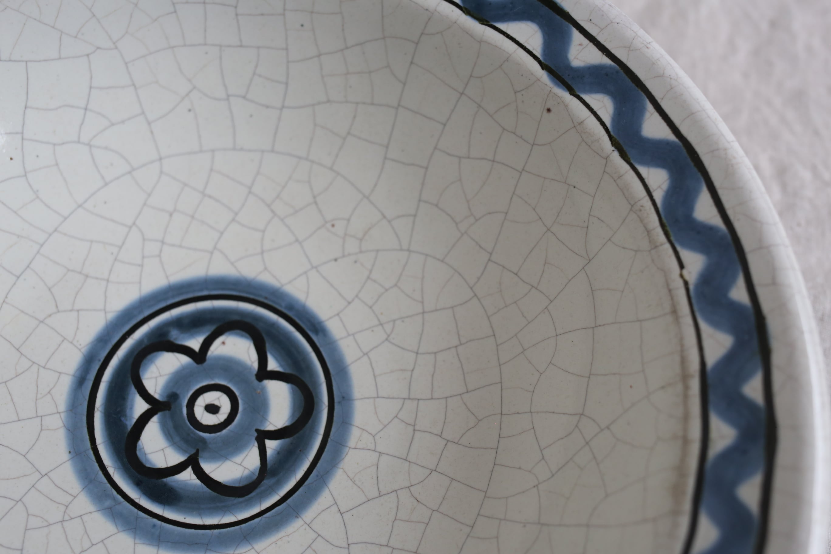 ぽってりとした厚みのある陶器にとろりとした釉薬と貫入がとても良い雰囲気で、淡いブルーと黒い線の絵柄も素敵です。