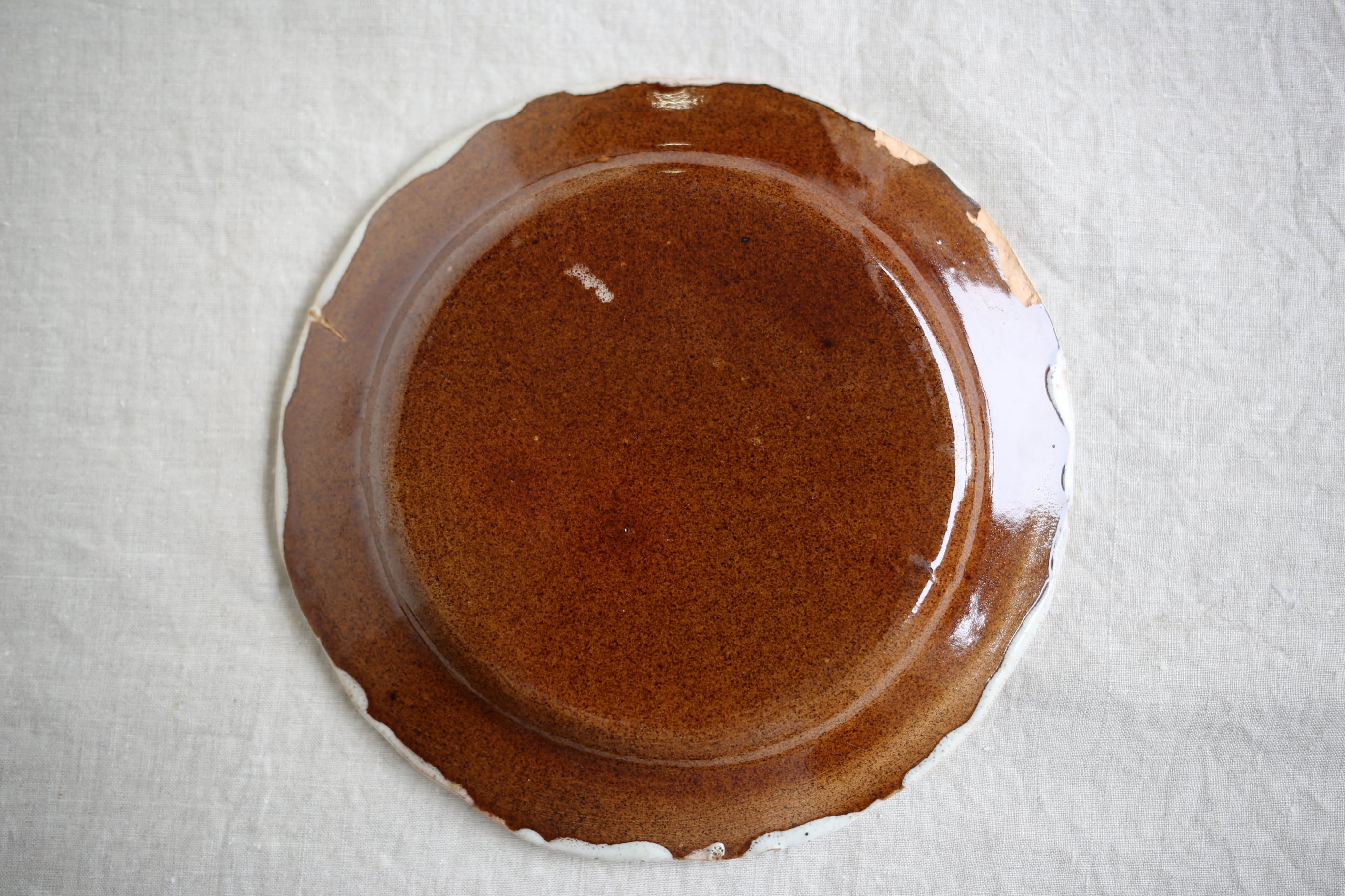縁にチップと釉薬が剥がれてテラコッタの地が見えた箇所が数か所あり、また縁の裏にカケが2箇所ありますが、古いものならではの趣きと温かみのある素敵な器です。