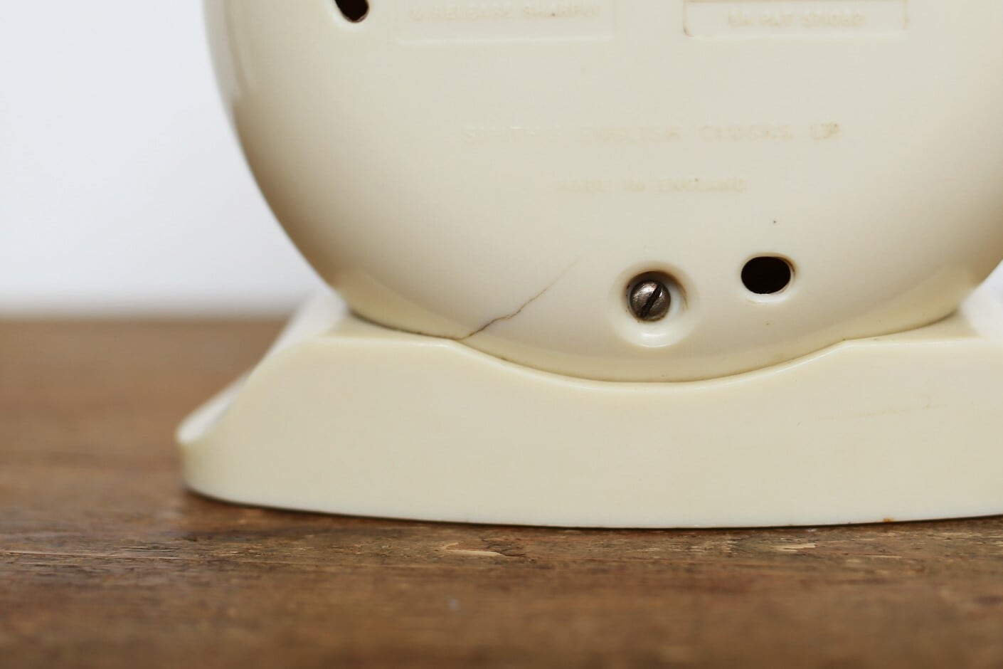 もともとはコンセントに差し込んで電気で動く目覚まし時計でしたが、電池式の新しいクォーツに交換しています。(針はオリジナルのままです。)